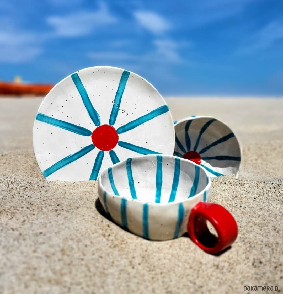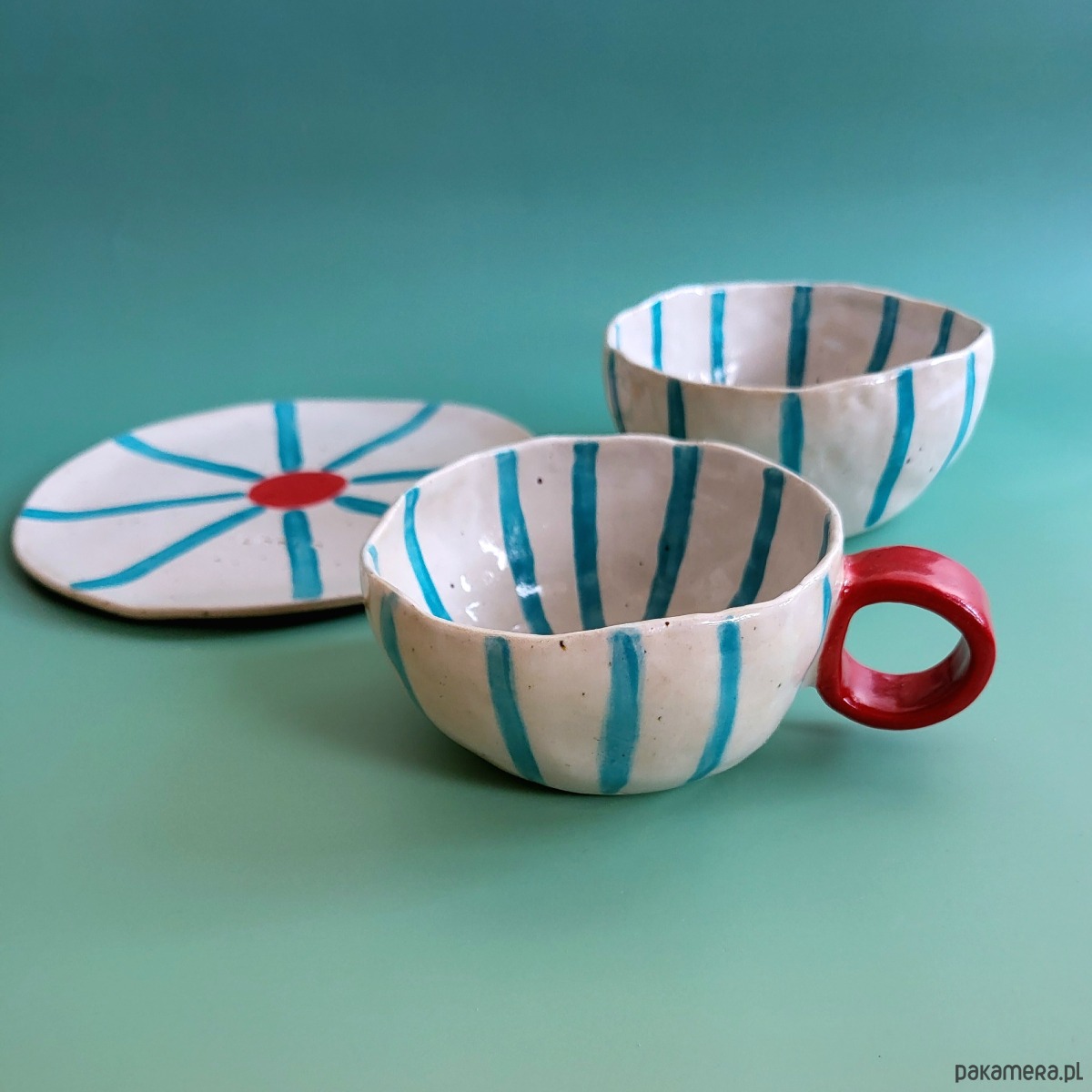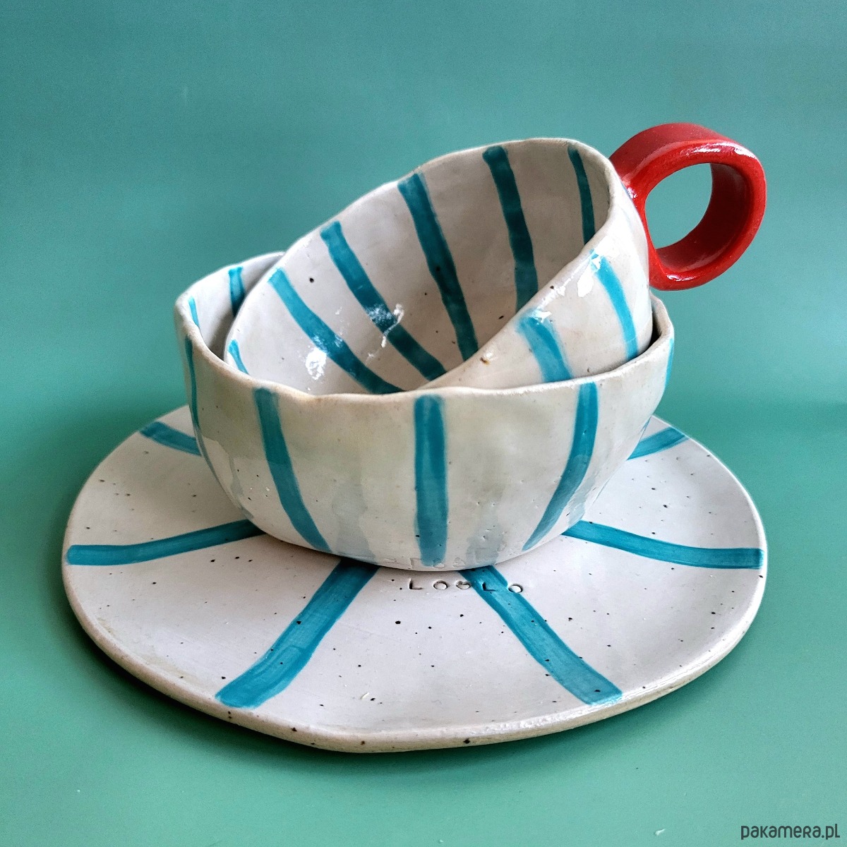 Ręcznie robiona ceramika do codziennego użytku — Ceramiczny zestaw śniadaniowy biały w niebieskie paski prezent