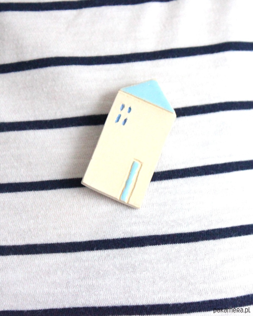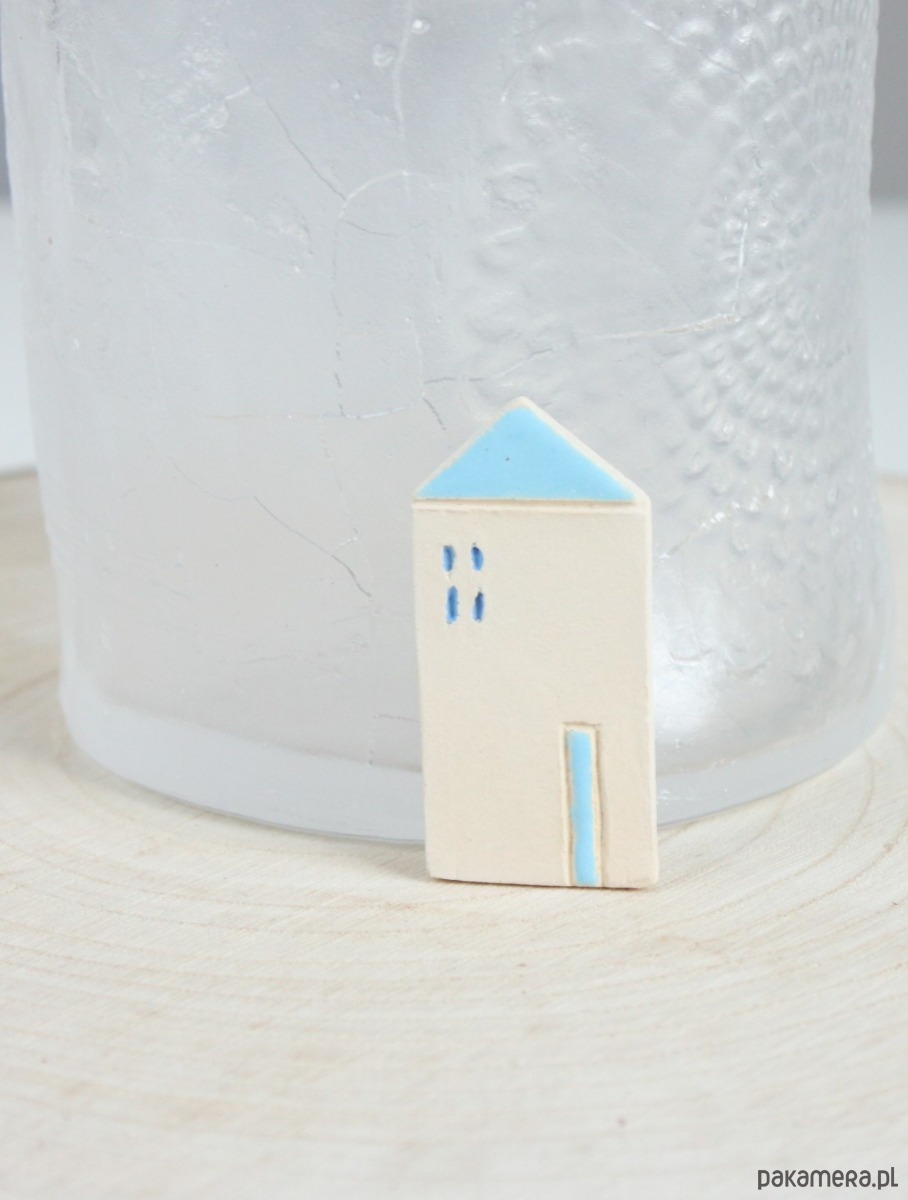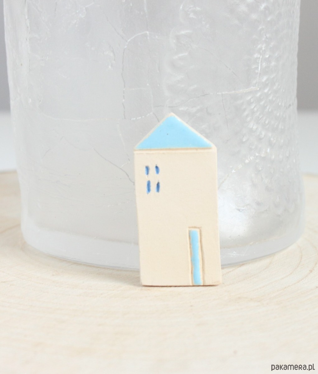 Ceramiczna broszka domek. Wymiary: 5,5cm x 2,5cm. Broszka wykonana z surowej gliny, szkliwiony tylko dach oraz drzwi (kolor błękitny).
