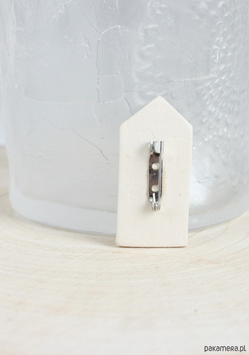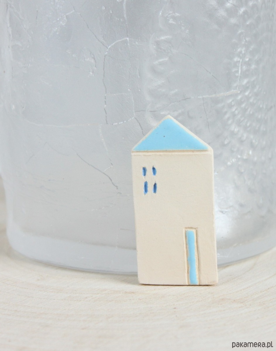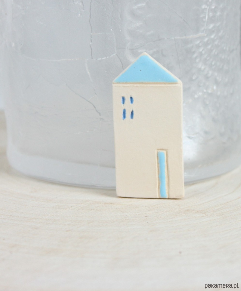 Ceramiczna broszka domek. Wymiary: 5,5cm x 2,5cm. Broszka wykonana z surowej gliny, szkliwiony tylko dach oraz drzwi (kolor błękitny).