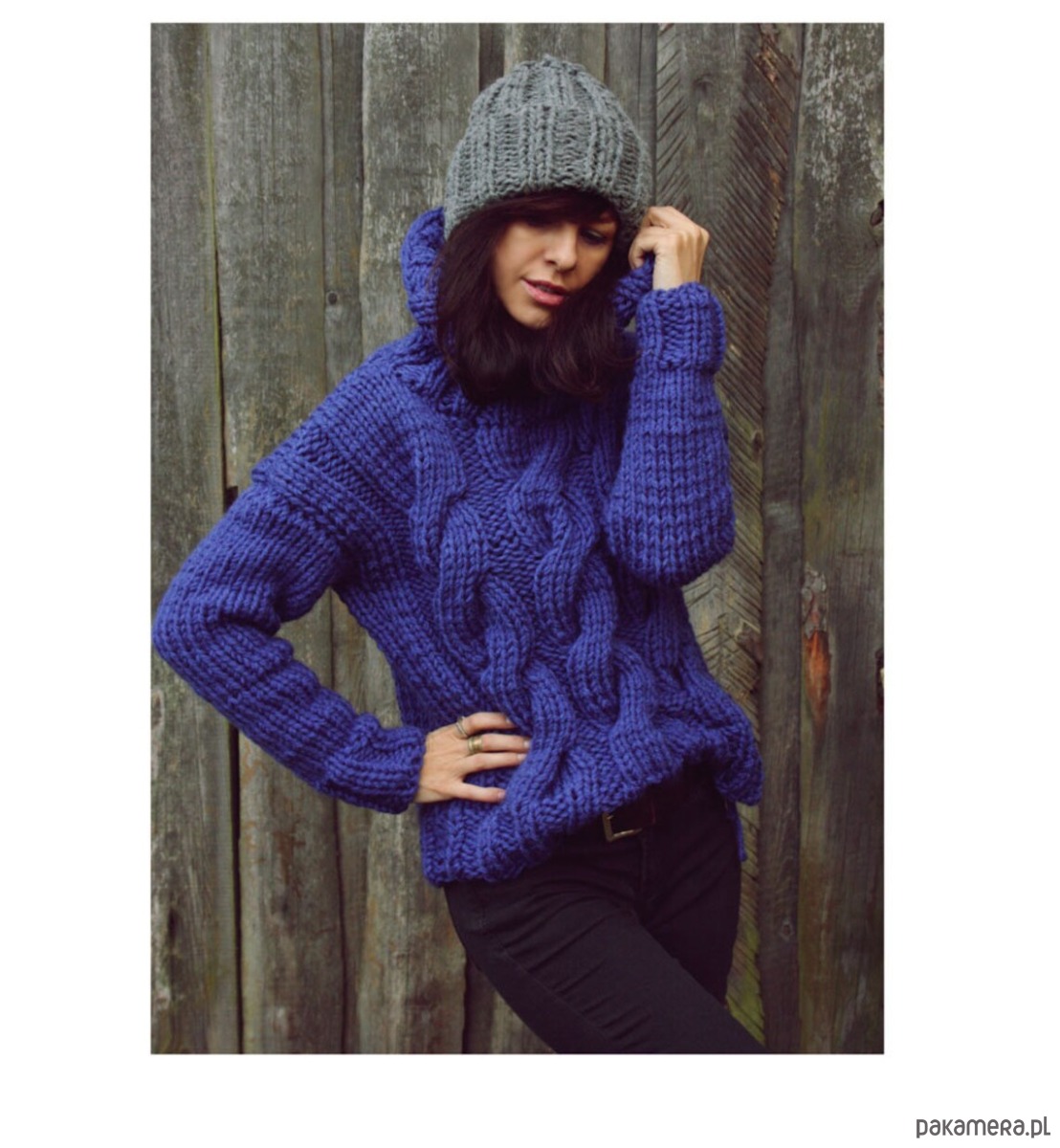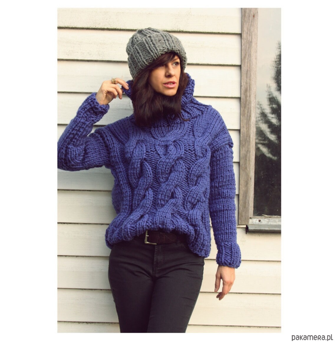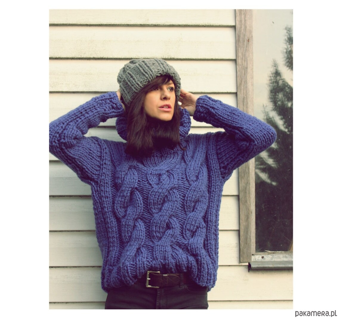 Wykonany z podwójnej przędzy typu chunky wool.