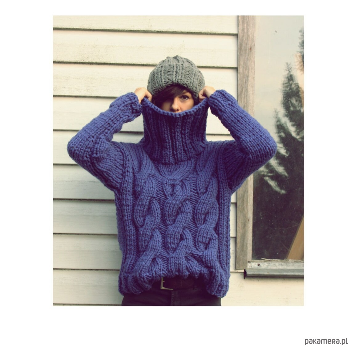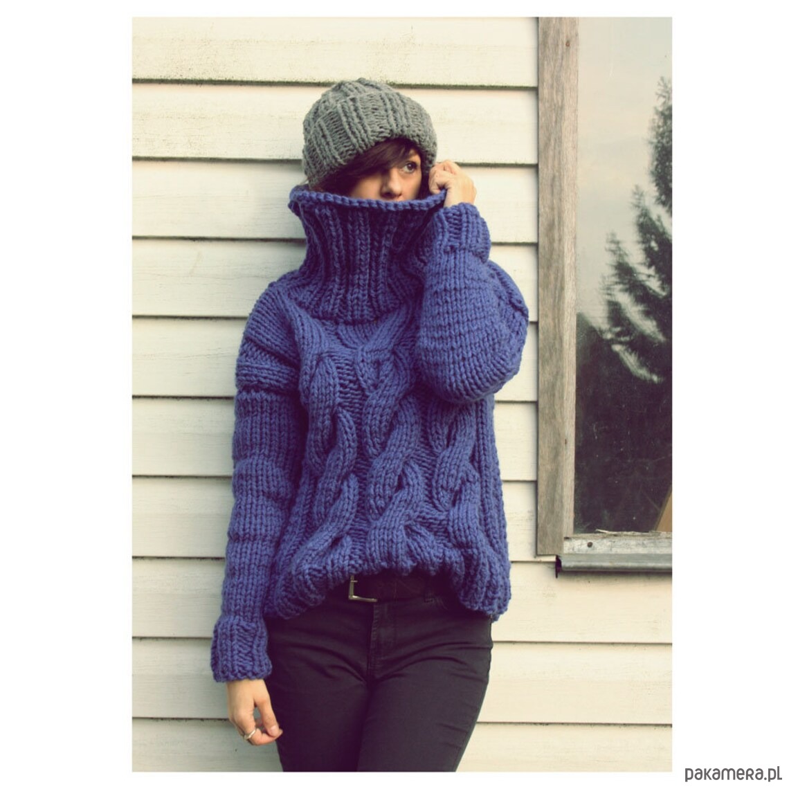 Ręcznie wykonany bardzo gruby sweter z golfem w pięknym chabrowym kolorze.