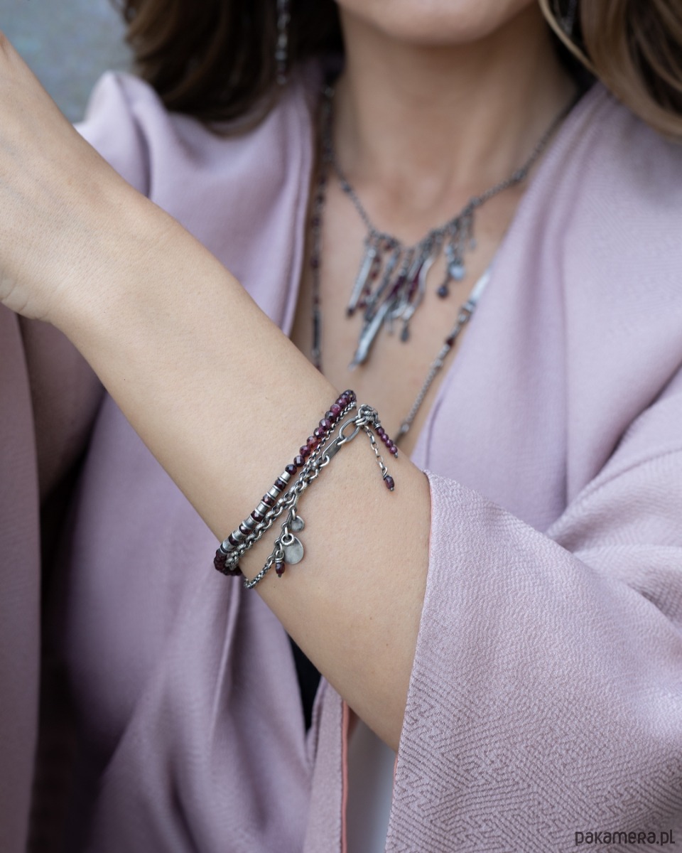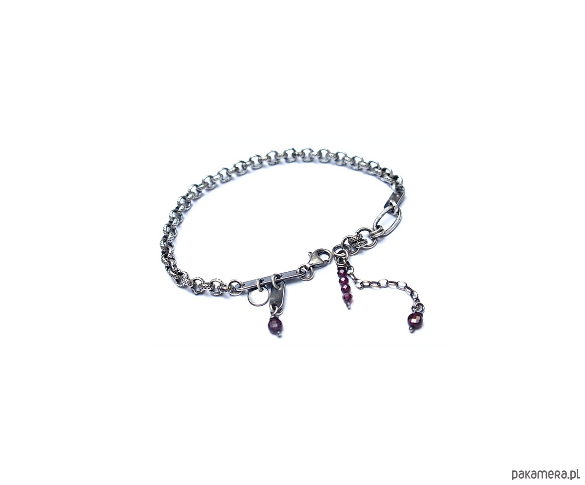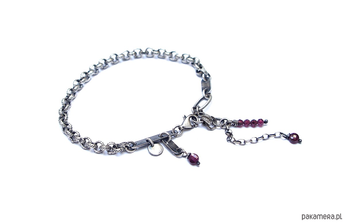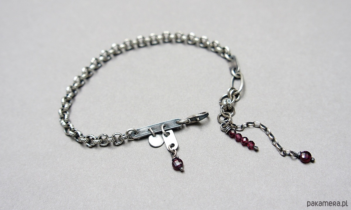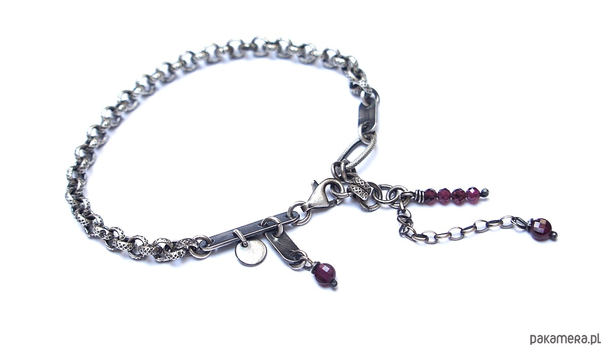 Bransoletka wykonana ze srebra pr. 925 w połączeniu z fasetowanymi kuleczkami granatów [4mm i 2mm] oraz srebrnymi blaszkami . Srebro oksydowane i przetarte. Całkowita długość bransoletki 17,5cm plus dodatkowe ogniwa i ozdobna przedłużka .