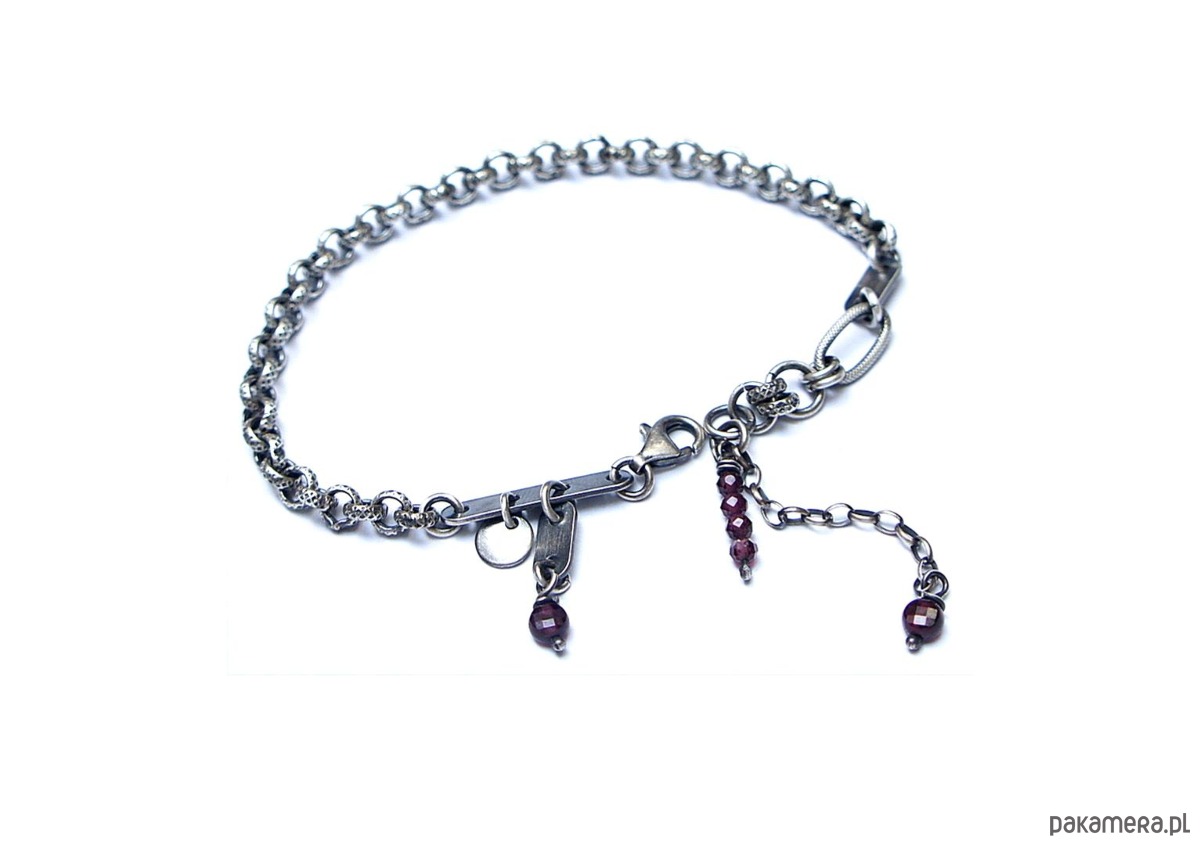 Bransoletka wykonana ze srebra pr. 925 w połączeniu z fasetowanymi kuleczkami granatów [4mm i 2mm] oraz srebrnymi blaszkami. Srebro oksydowane i przetarte. Całkowita długość bransoletki 17,5cm plus dodatkowe ogniwa i ozdobna przedłużka.
