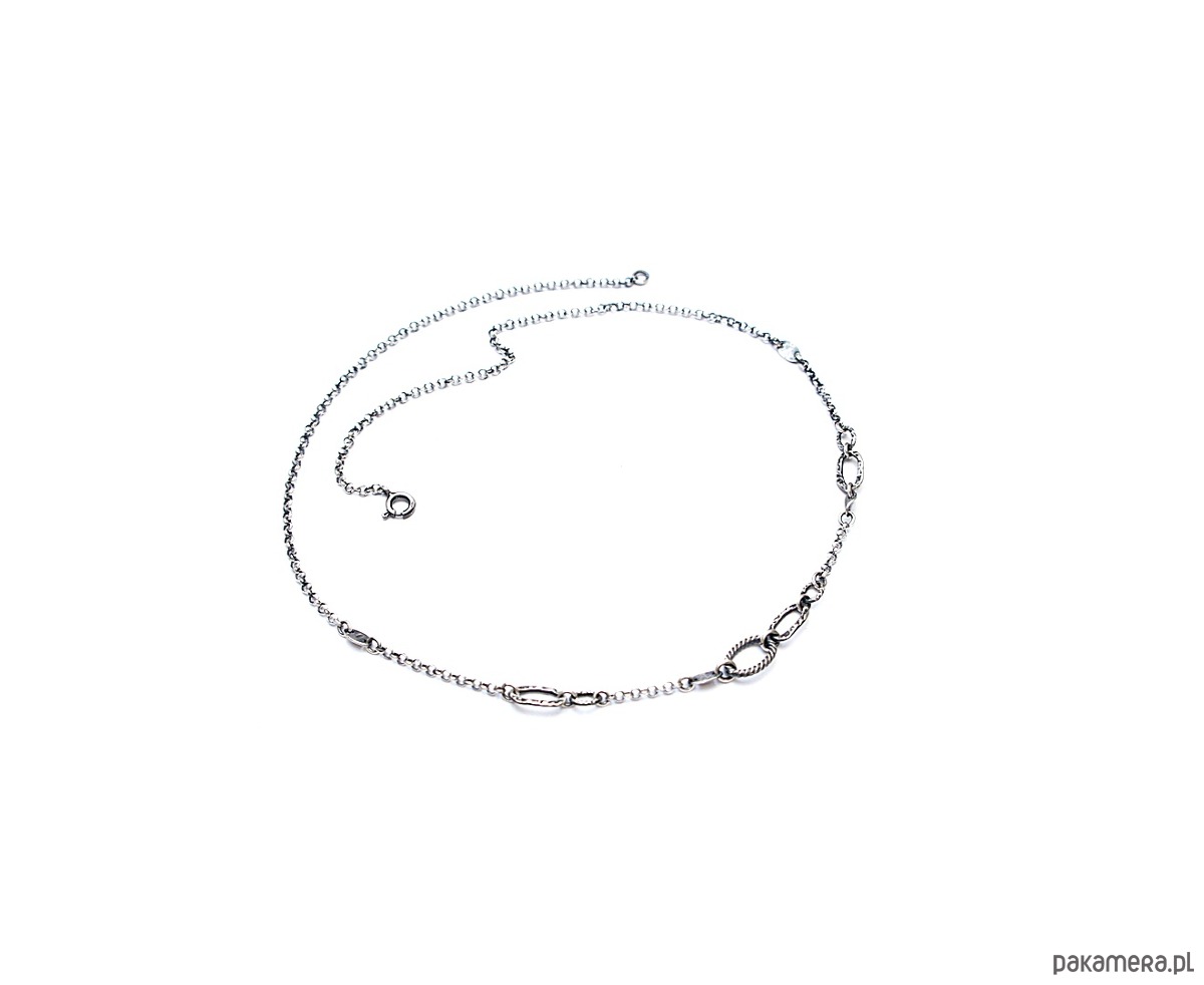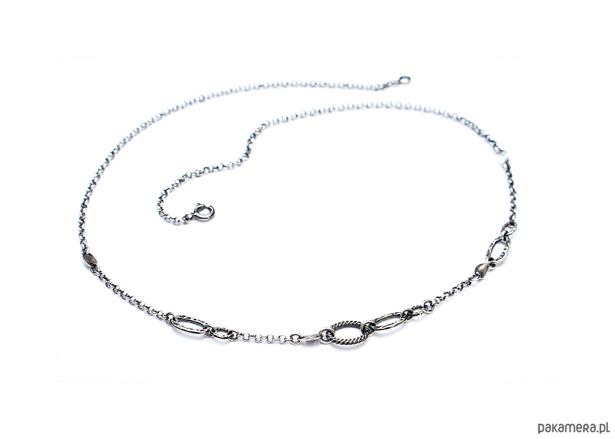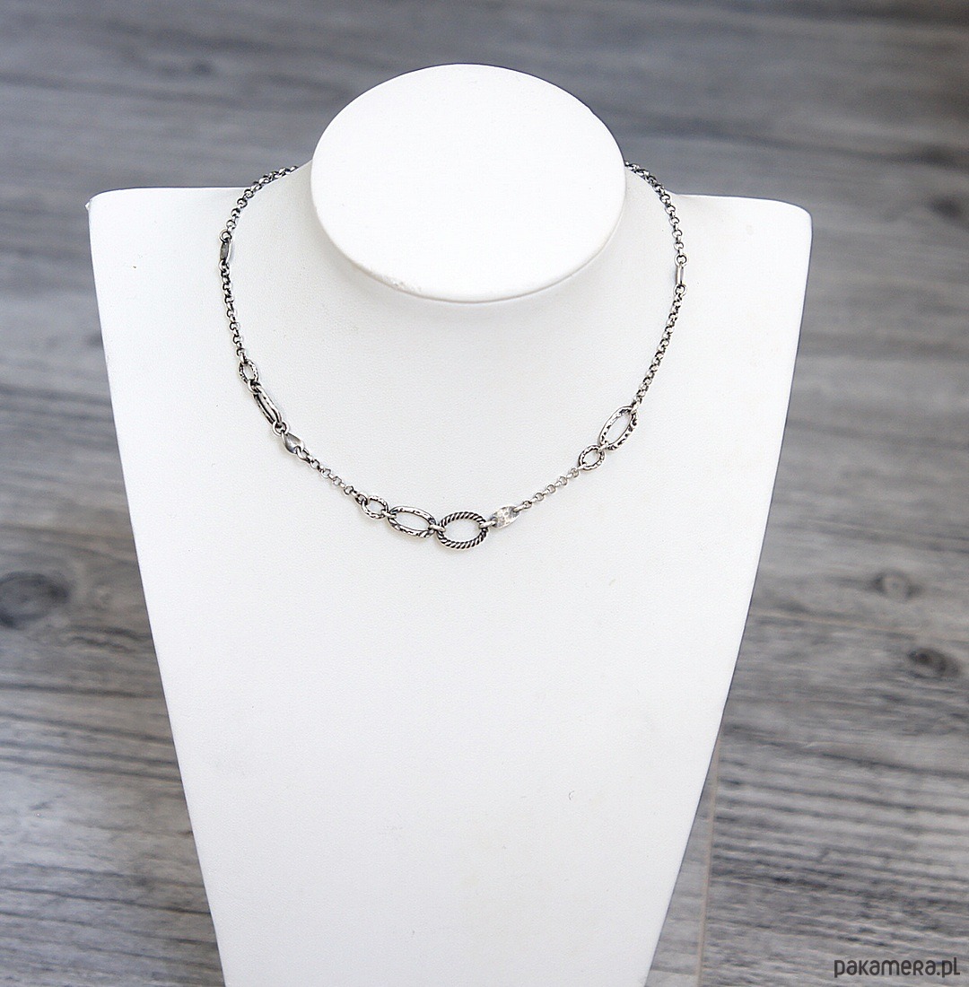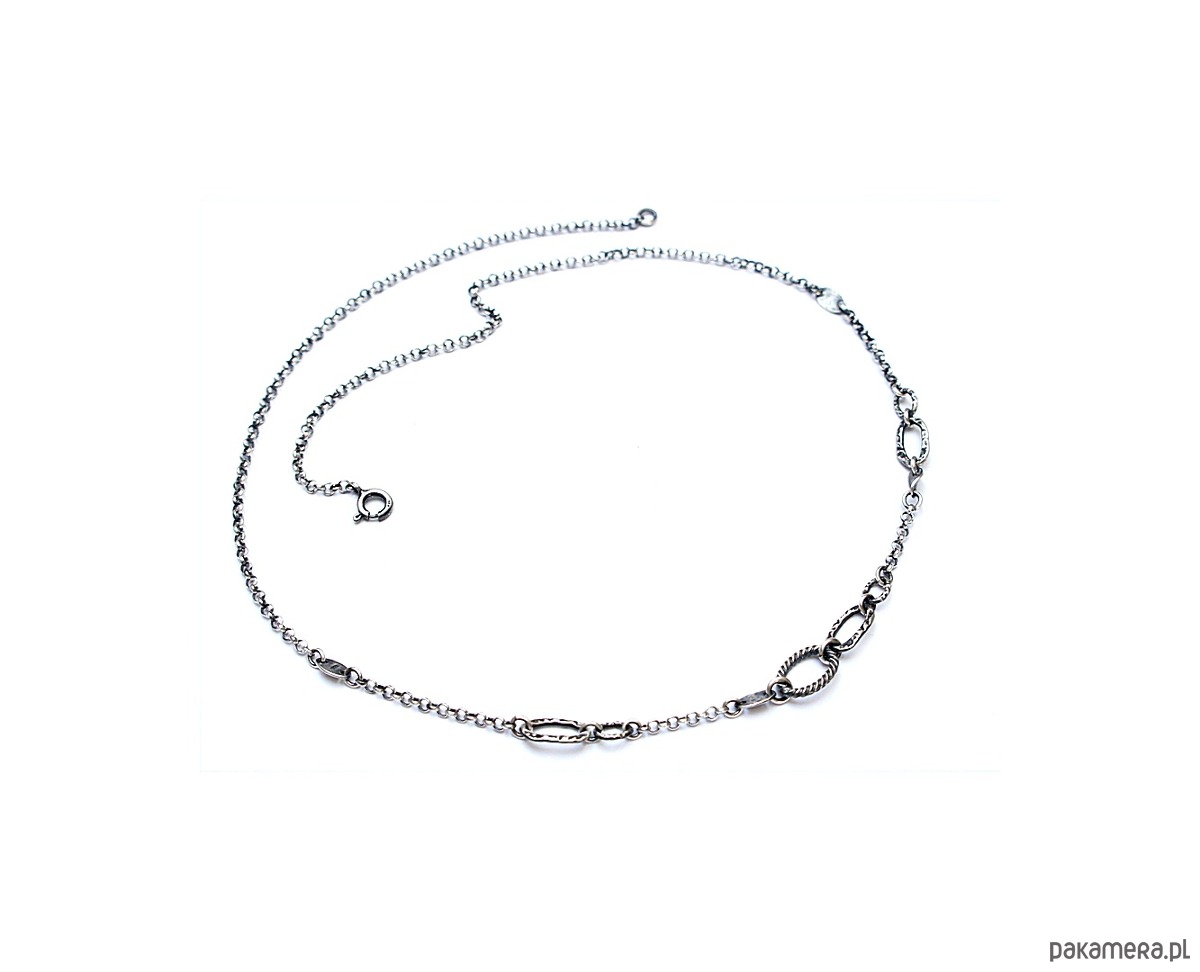 Krótki naszyjnik wykonany ze srebra [pr. 925]. Srebro oksydowane i przetarte. Całkowita długość łańcuszka około 48,5cm. Biżuteria ozdobnie zapakowana.