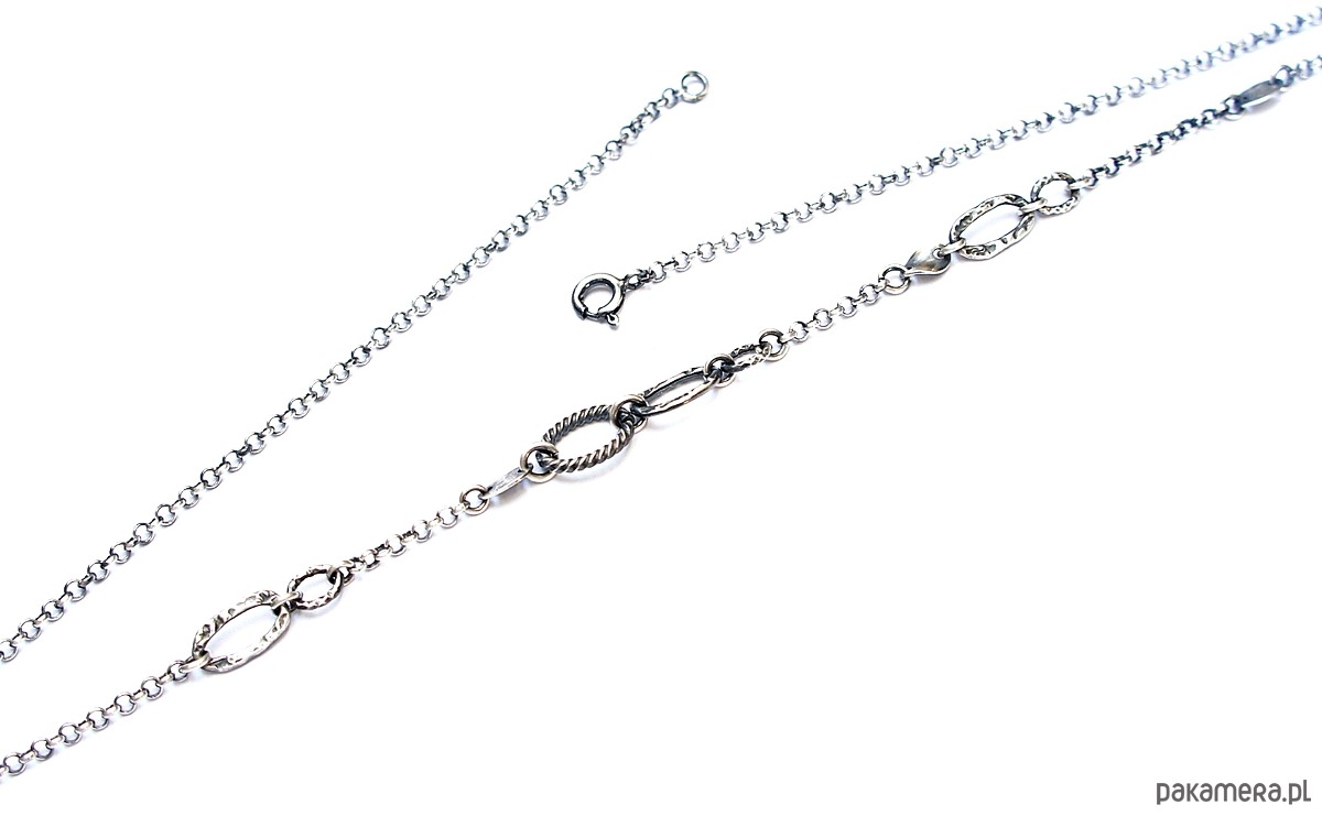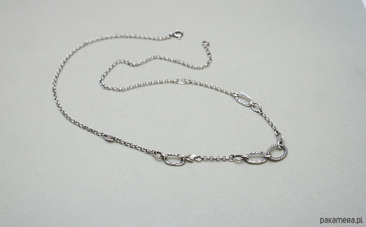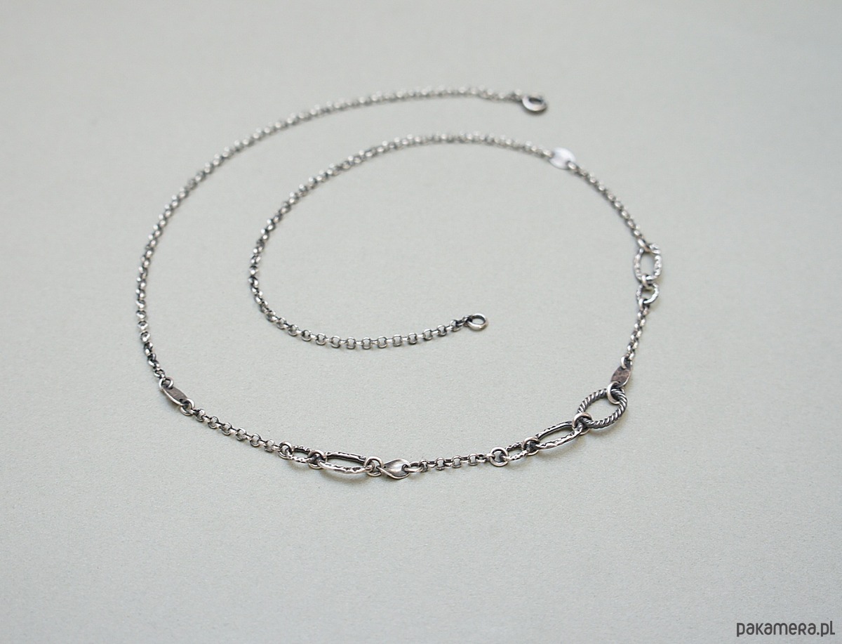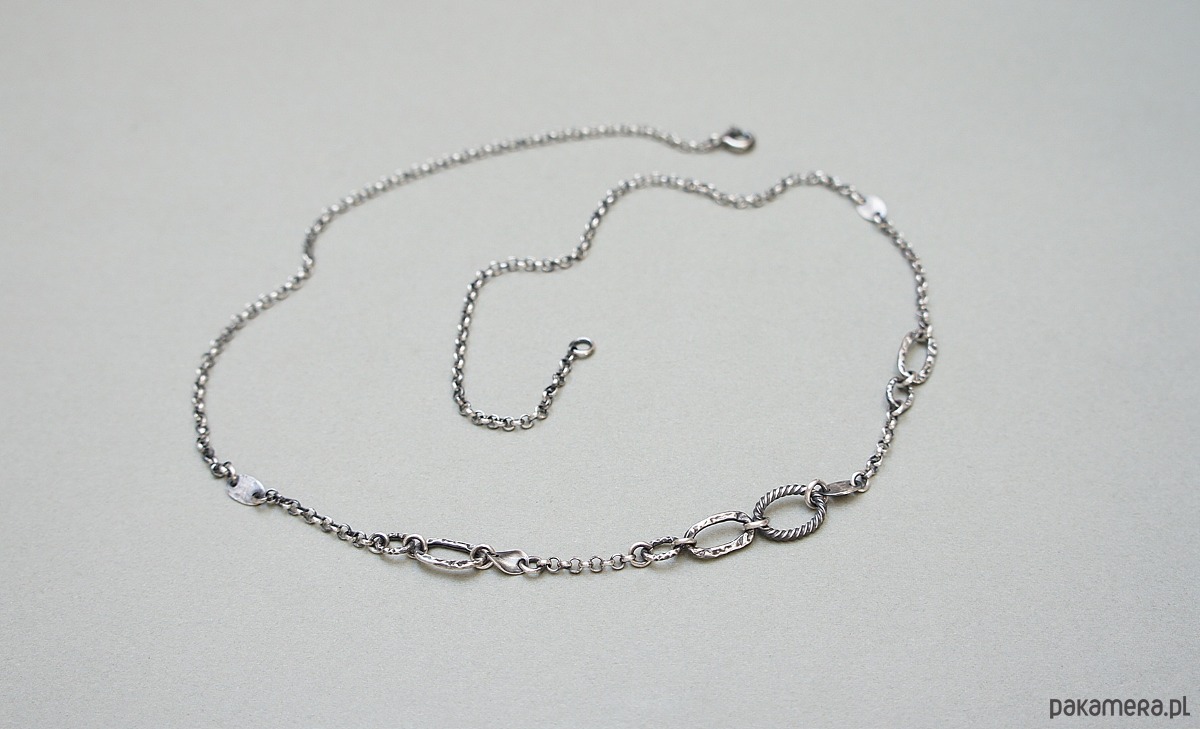 Krótki naszyjnik wykonany ze srebra [pr. 925]. Srebro oksydowane i przetarte. Całkowita długość łańcuszka około 48,5cm. Biżuteria ozdobnie zapakowana.