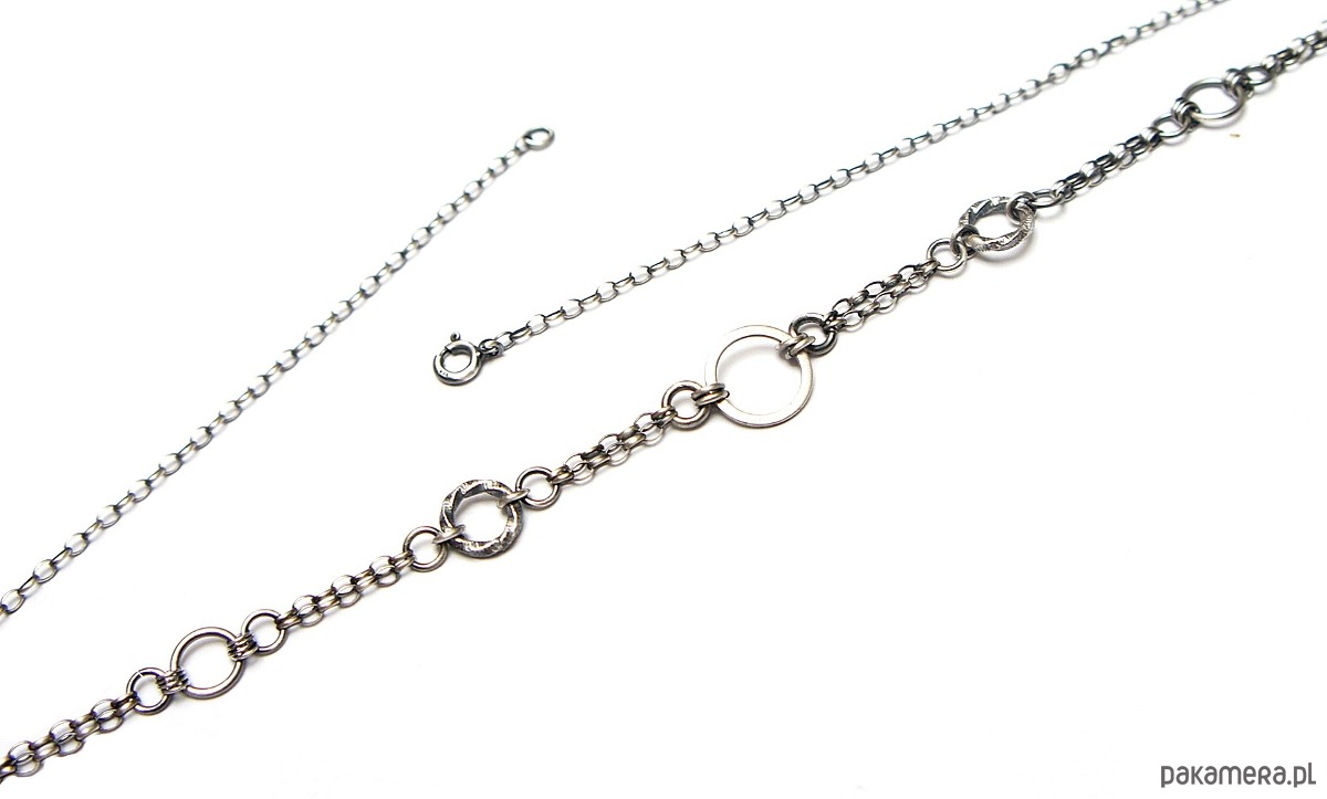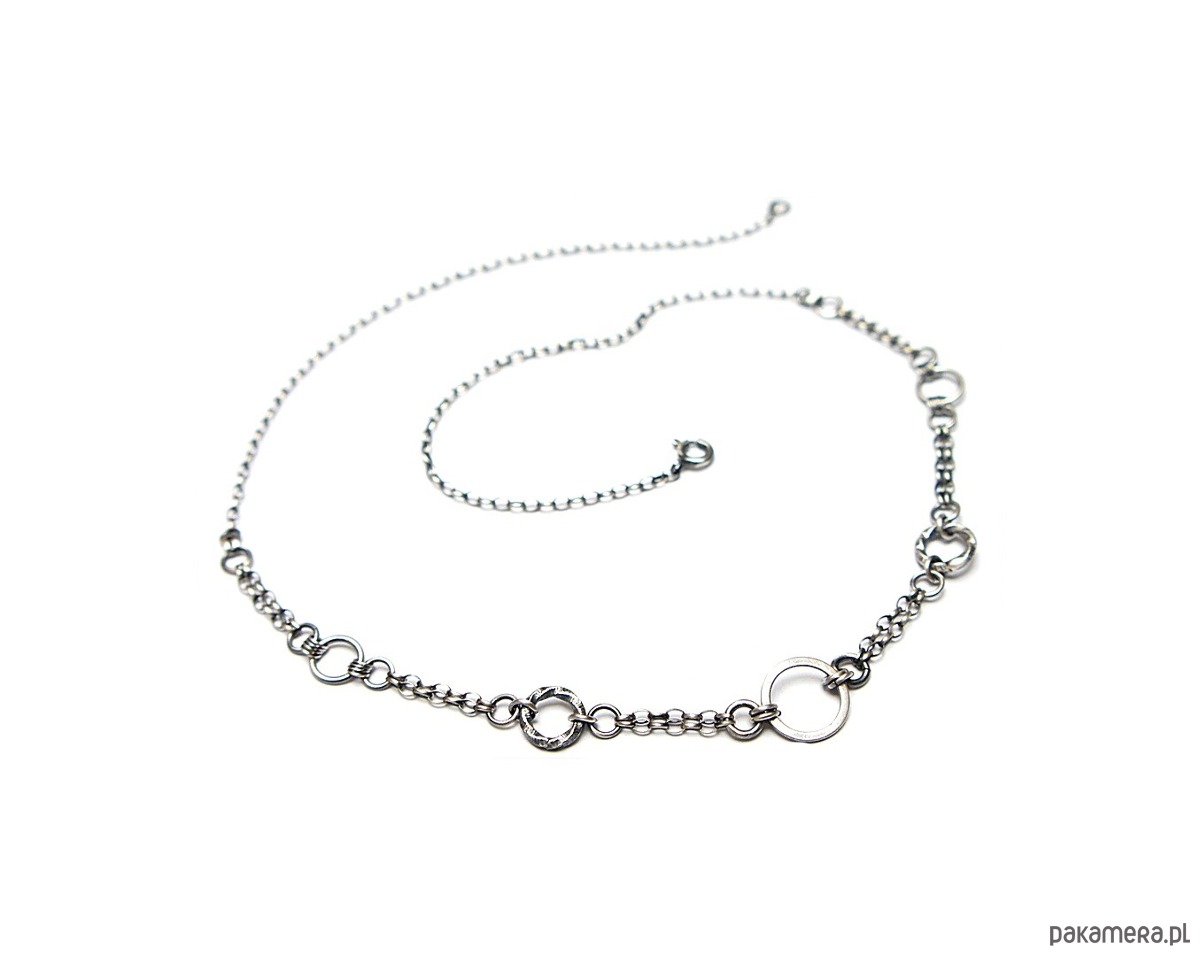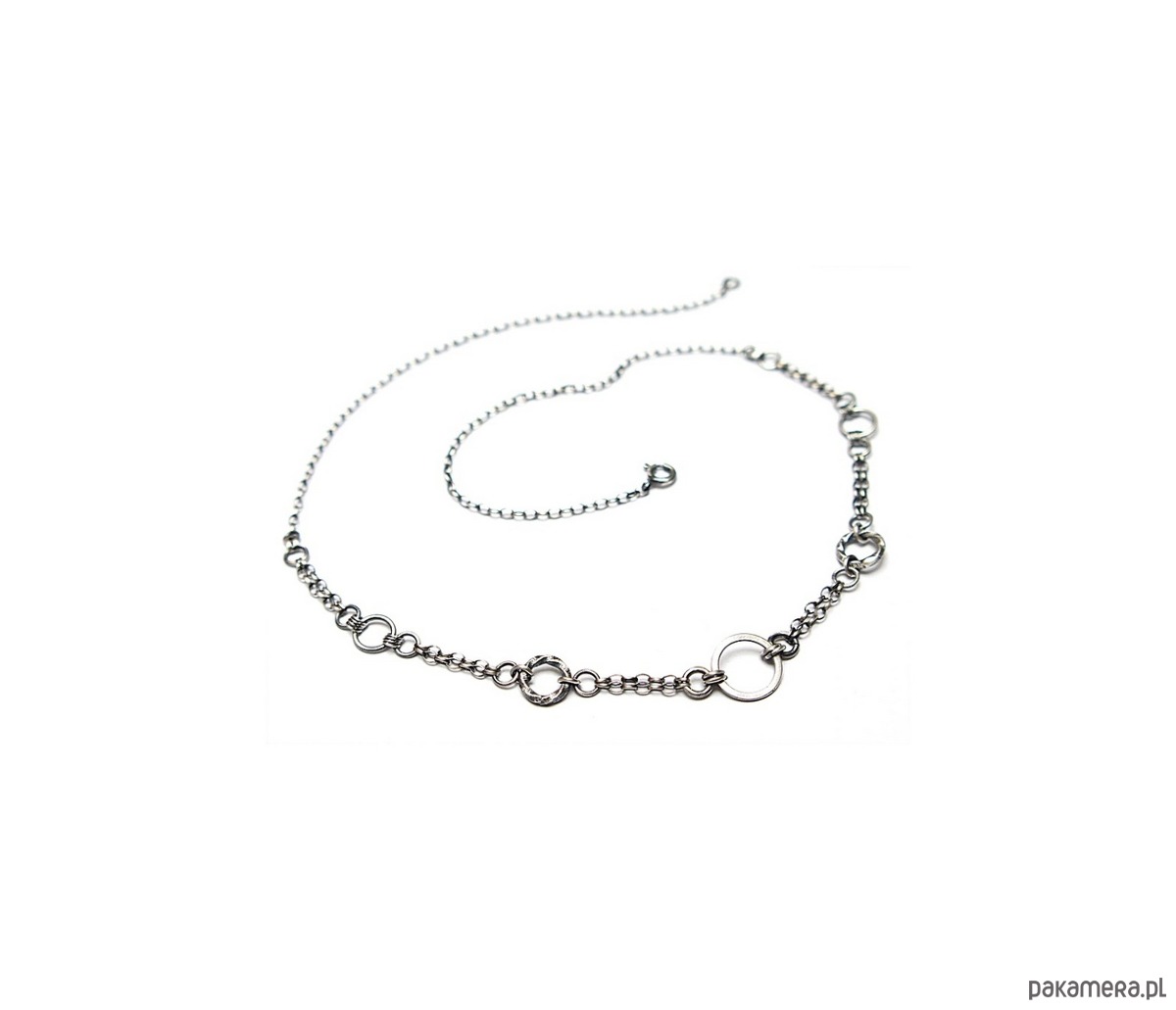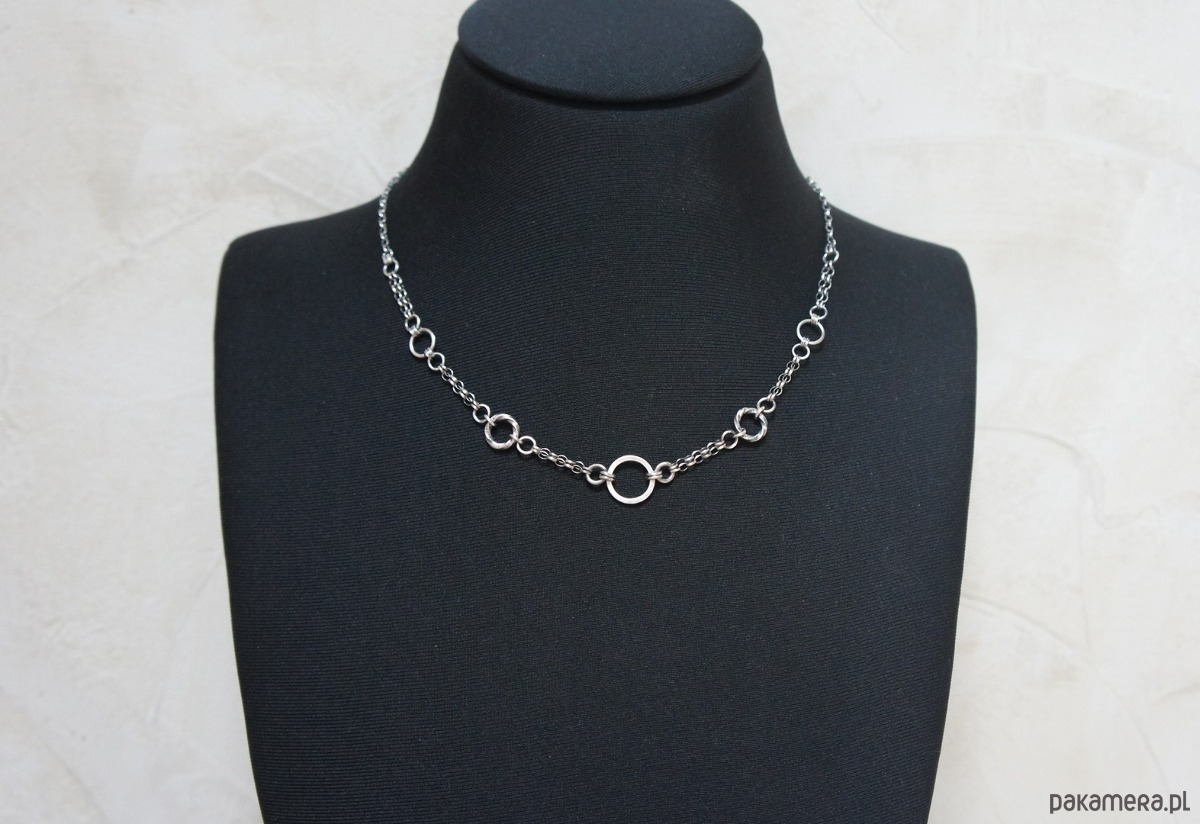 Krótki naszyjnik wykonany ze srebra [pr. 925]. Srebro oksydowane i przetarte. Całkowita długość łańcuszka około 49cm. Biżuteria ozdobnie zapakowana.