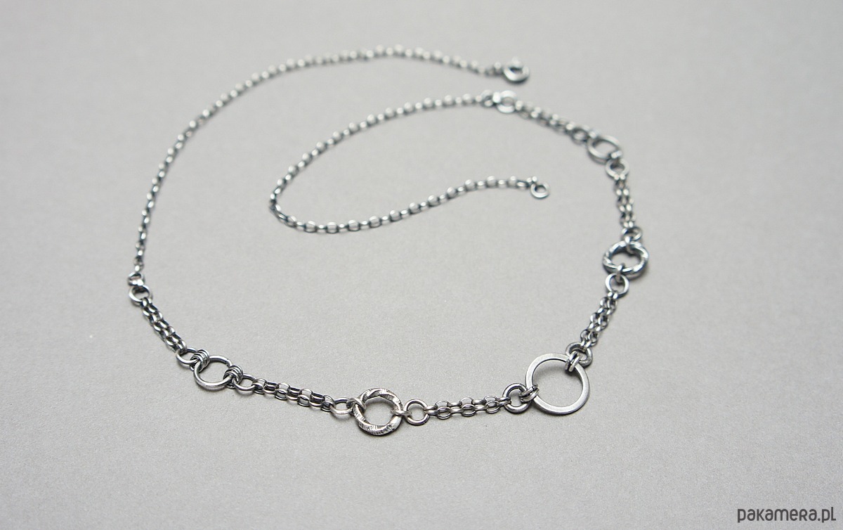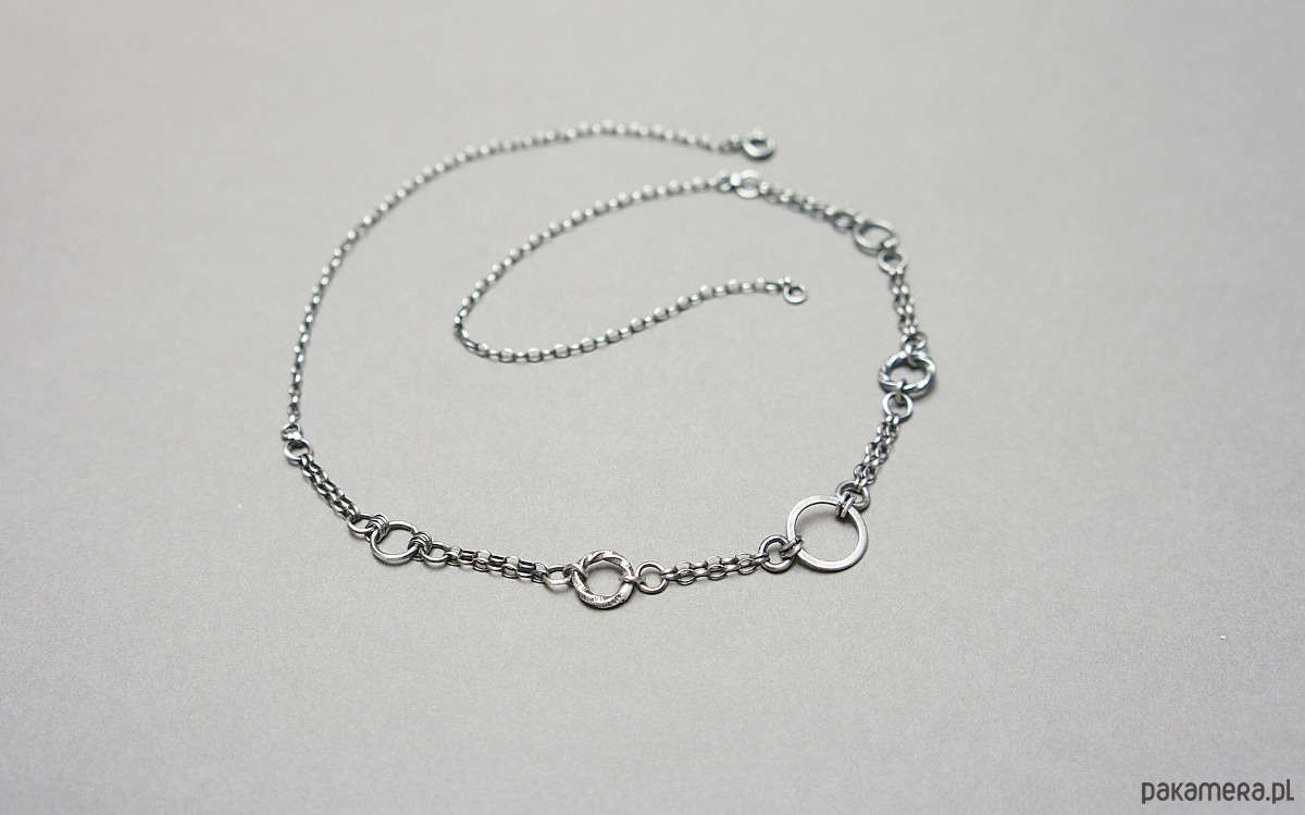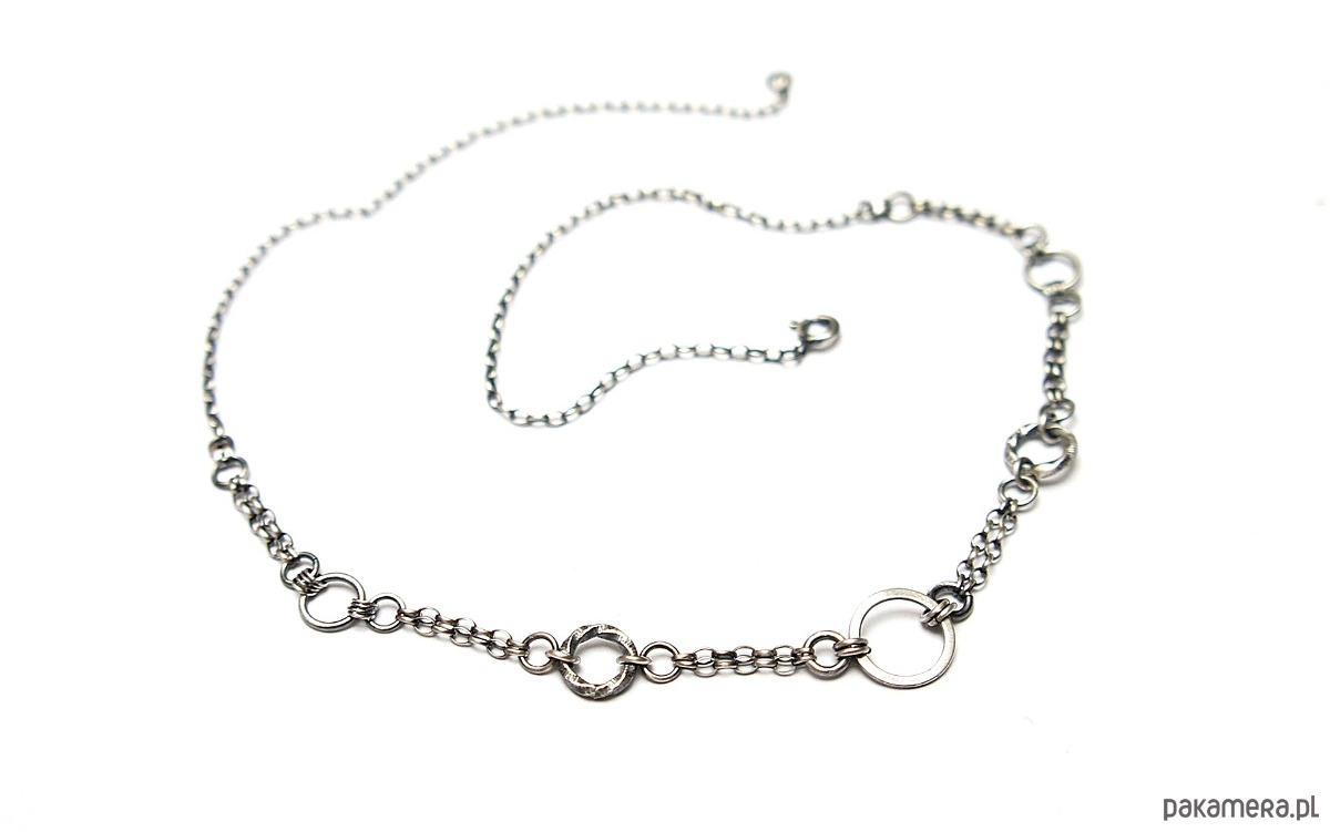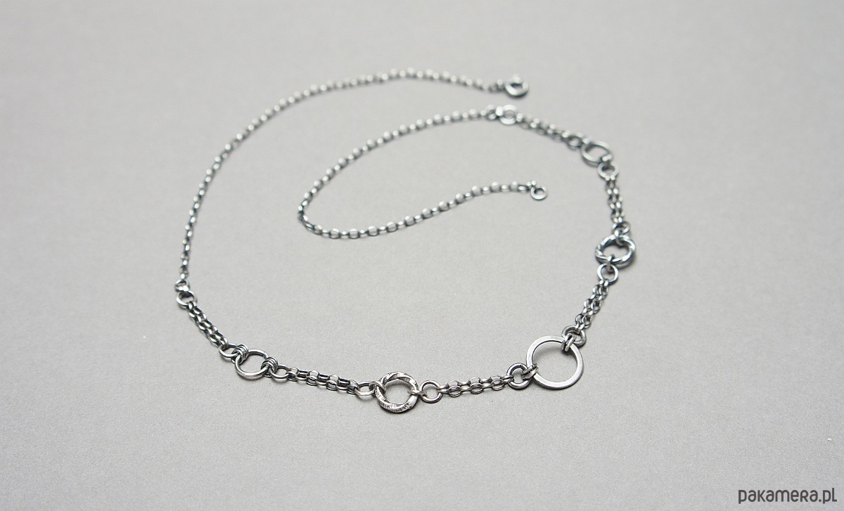 Krótki naszyjnik wykonany ze srebra [pr. 925]. Srebro oksydowane i przetarte. Całkowita długość łańcuszka około 49cm. Biżuteria ozdobnie zapakowana.