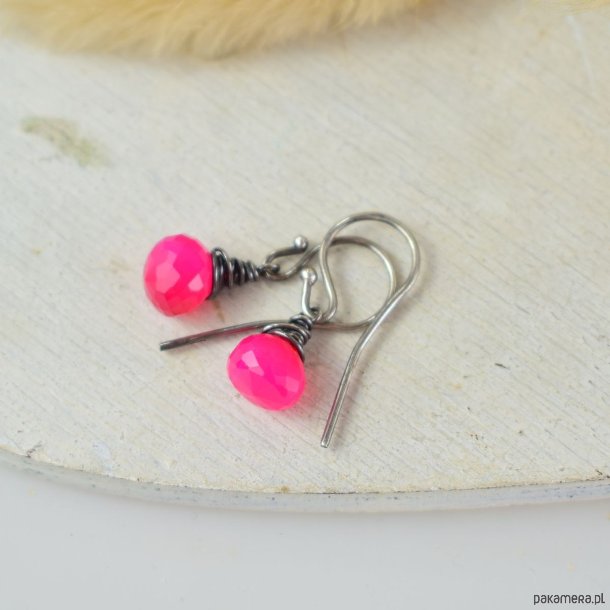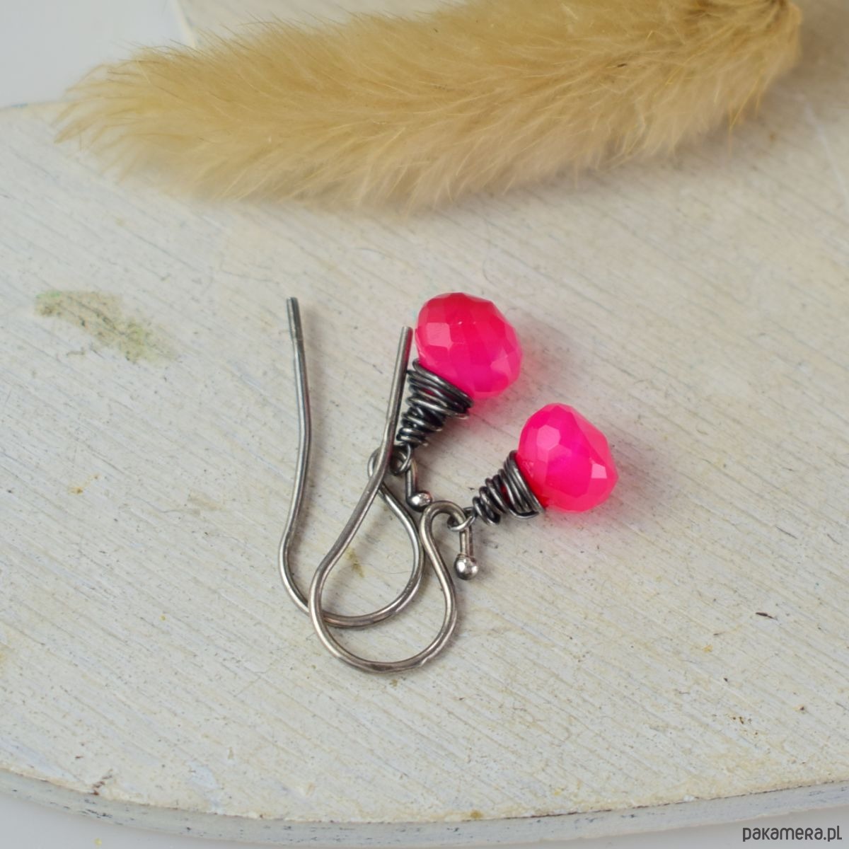 Srebrne kolczyki (srebro 925) z kroplami chalcedonu hot pink. Biżuteria została zoksydowana i wypolerowana. Długość całego kolczyka 2.5 cm.