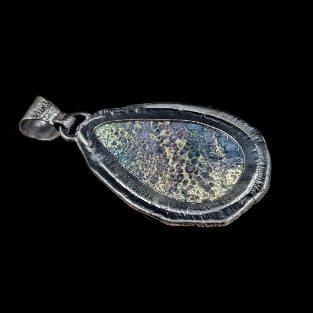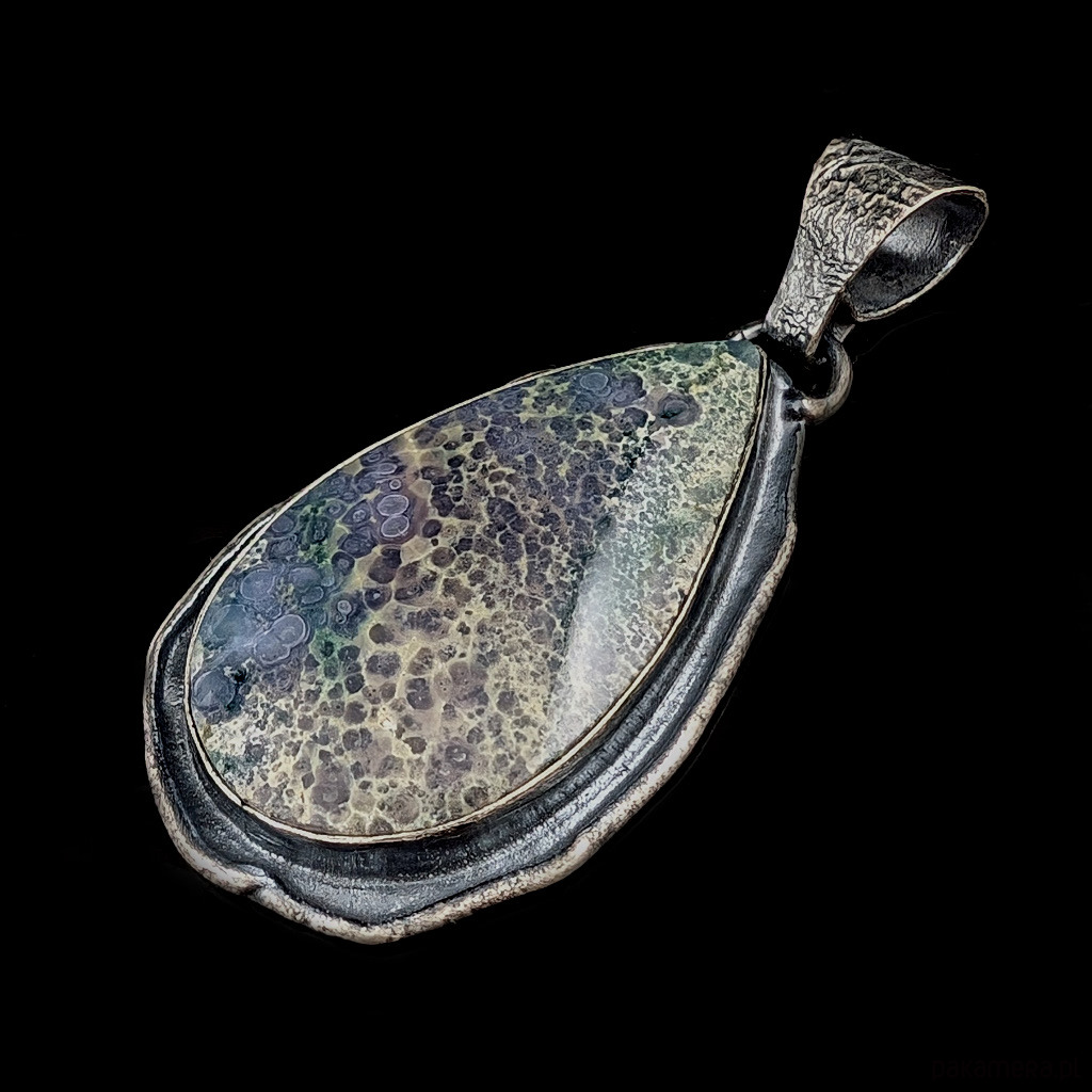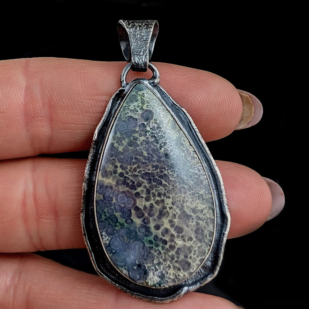 Oryginalny wisior stworzony z oksydowanego srebra pr 925 oraz drobnokrystalicznego ametystu, zwanego chalcedonem winogronowym Wymiary oprawy wisiora 42 x 28 mm. Dlugość max 58 mm. Waga masywnego wisiora 14 gramów. Wisior zostanie zapakowany w ozdobne pudełeczko.