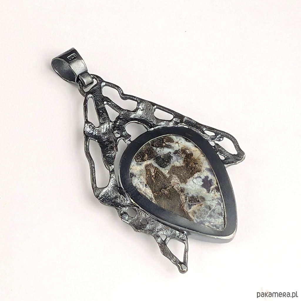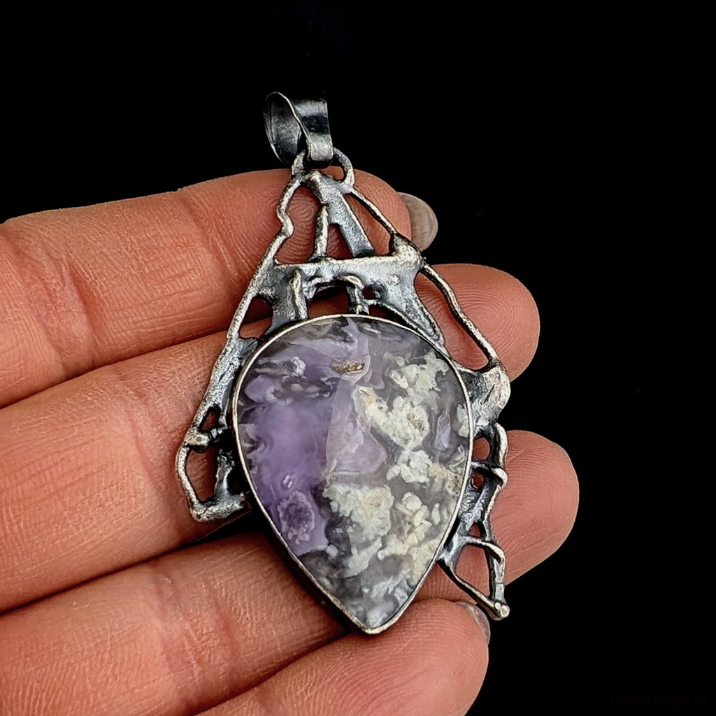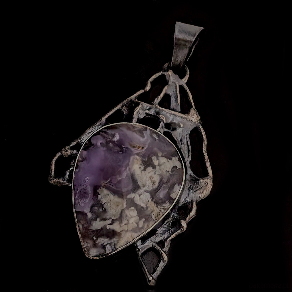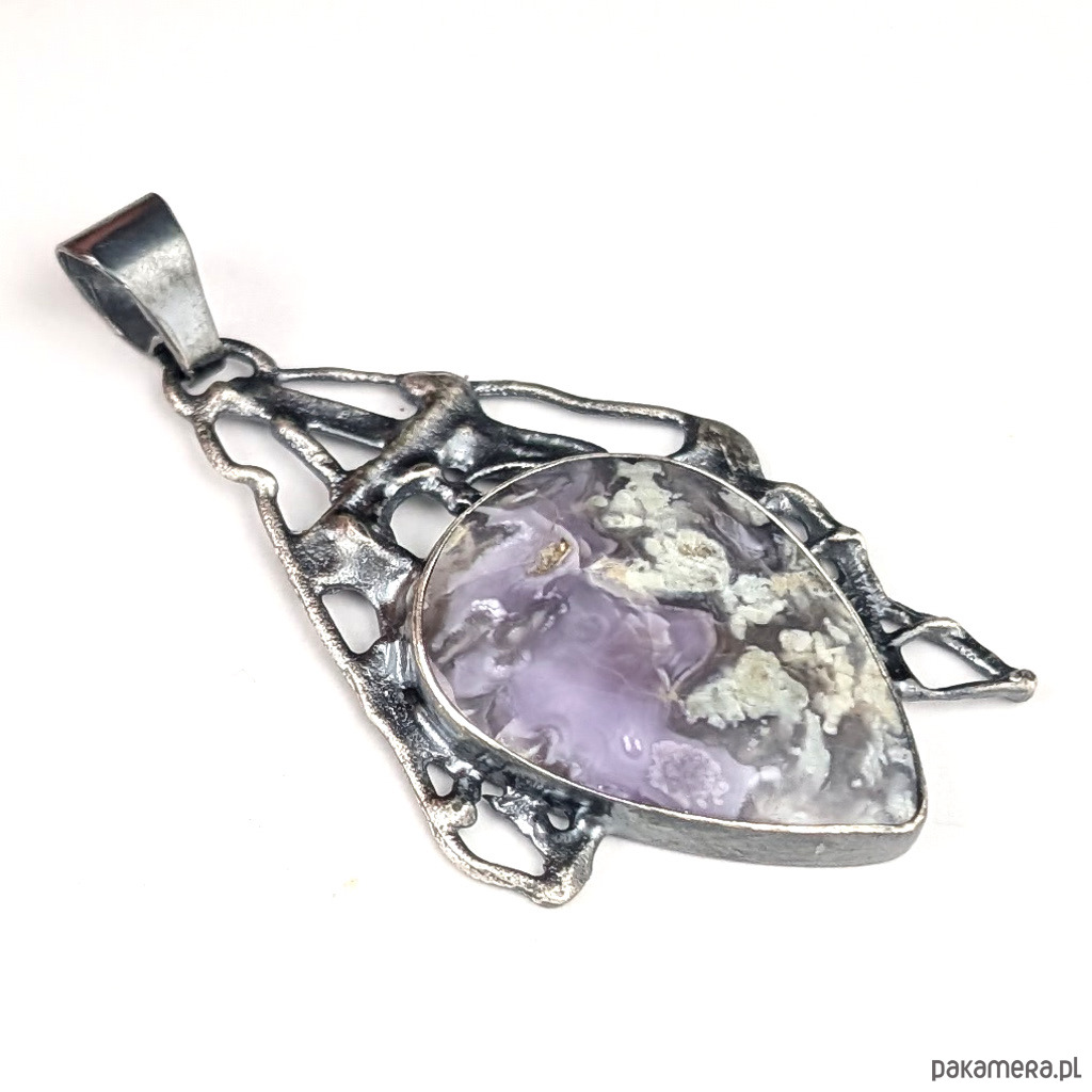 Oryginalny wisior stworzony z oksydowanego srebra pr 925 oraz drobnokrystalicznego ametystu, zwanego chalcedonem winogronowym Wymiary oprawy wisiora 50 x 35 mm. Dlugość max 62 mm. Waga masywnego wisiora 12 gramów. Wisior zostanie zapakowany w ozdobne pudełeczko.