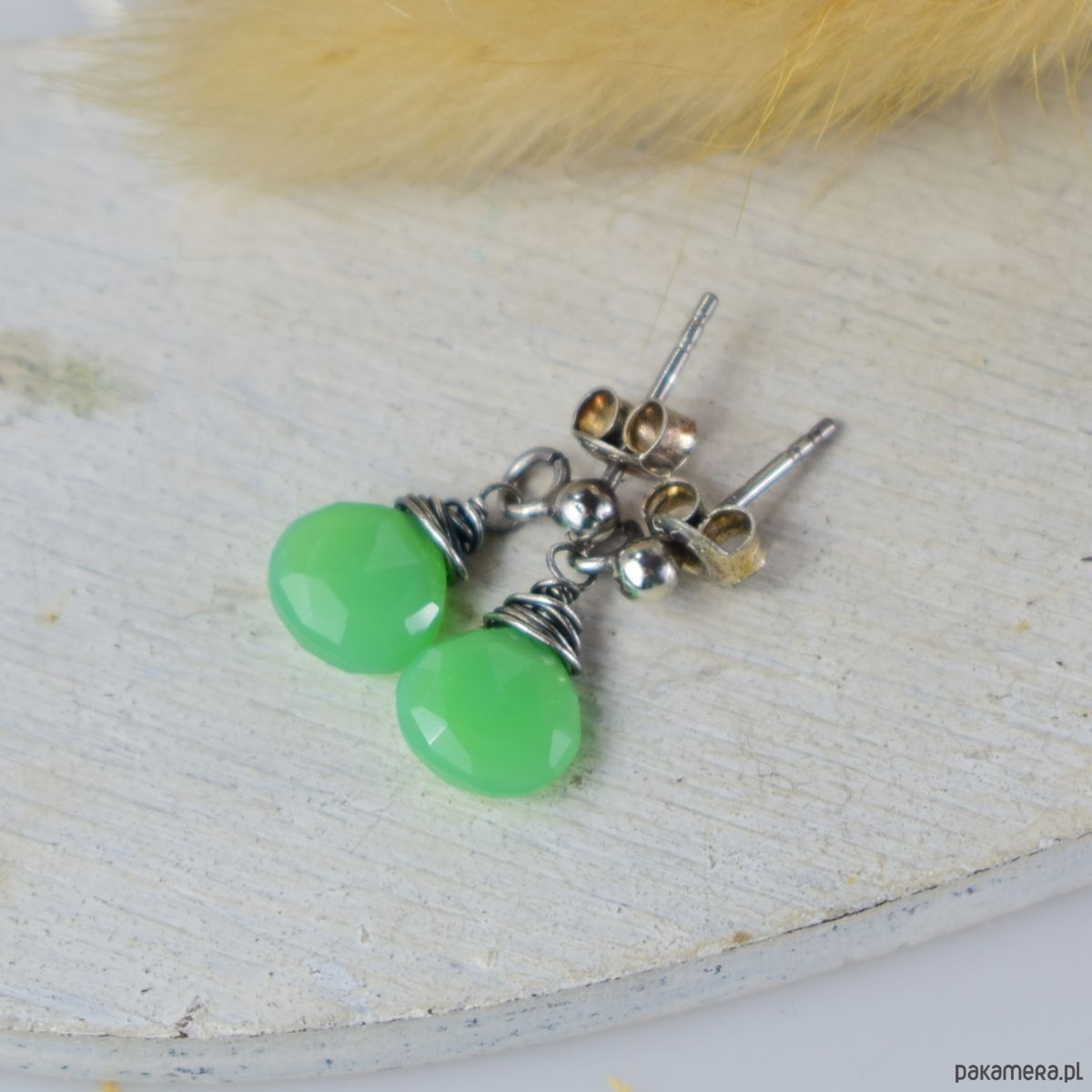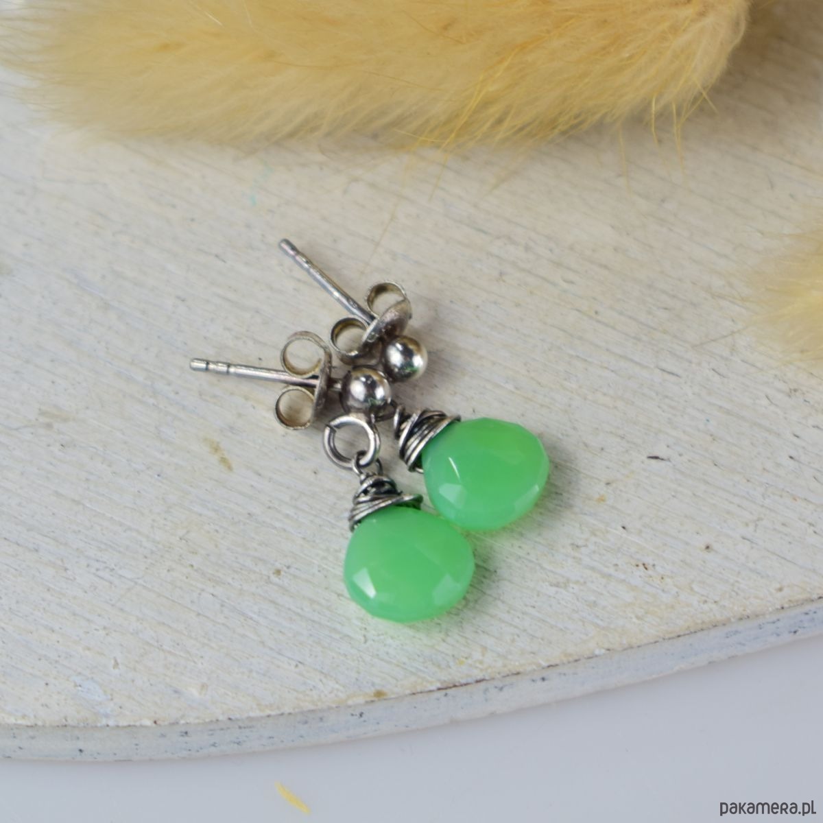 Srebrne kolczyki (srebro 925) z kroplami zielonego chalcedonu. Biżuteria została zoksydowana i wypolerowana. Długość całego kolczyka 1.8 cm.