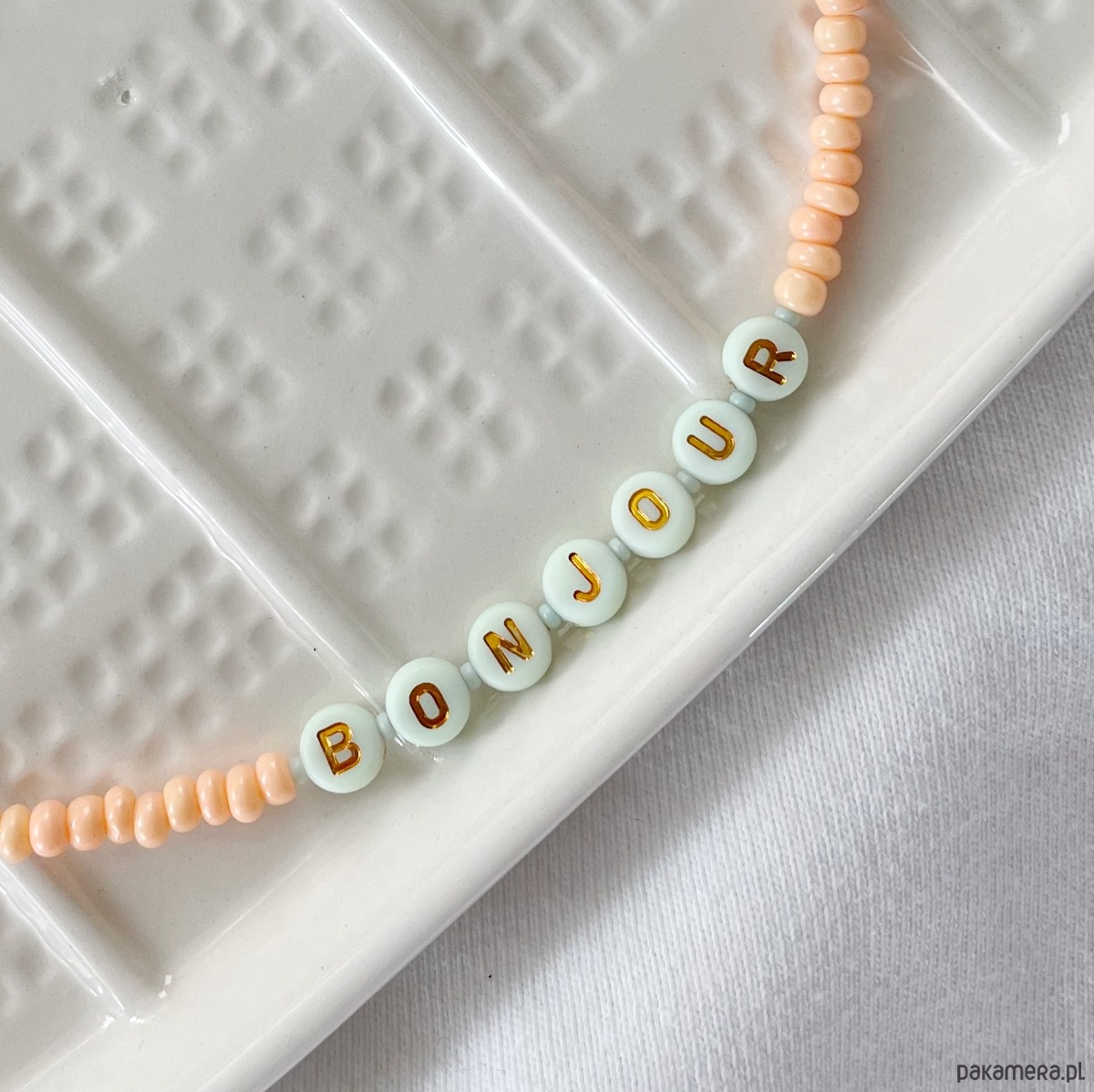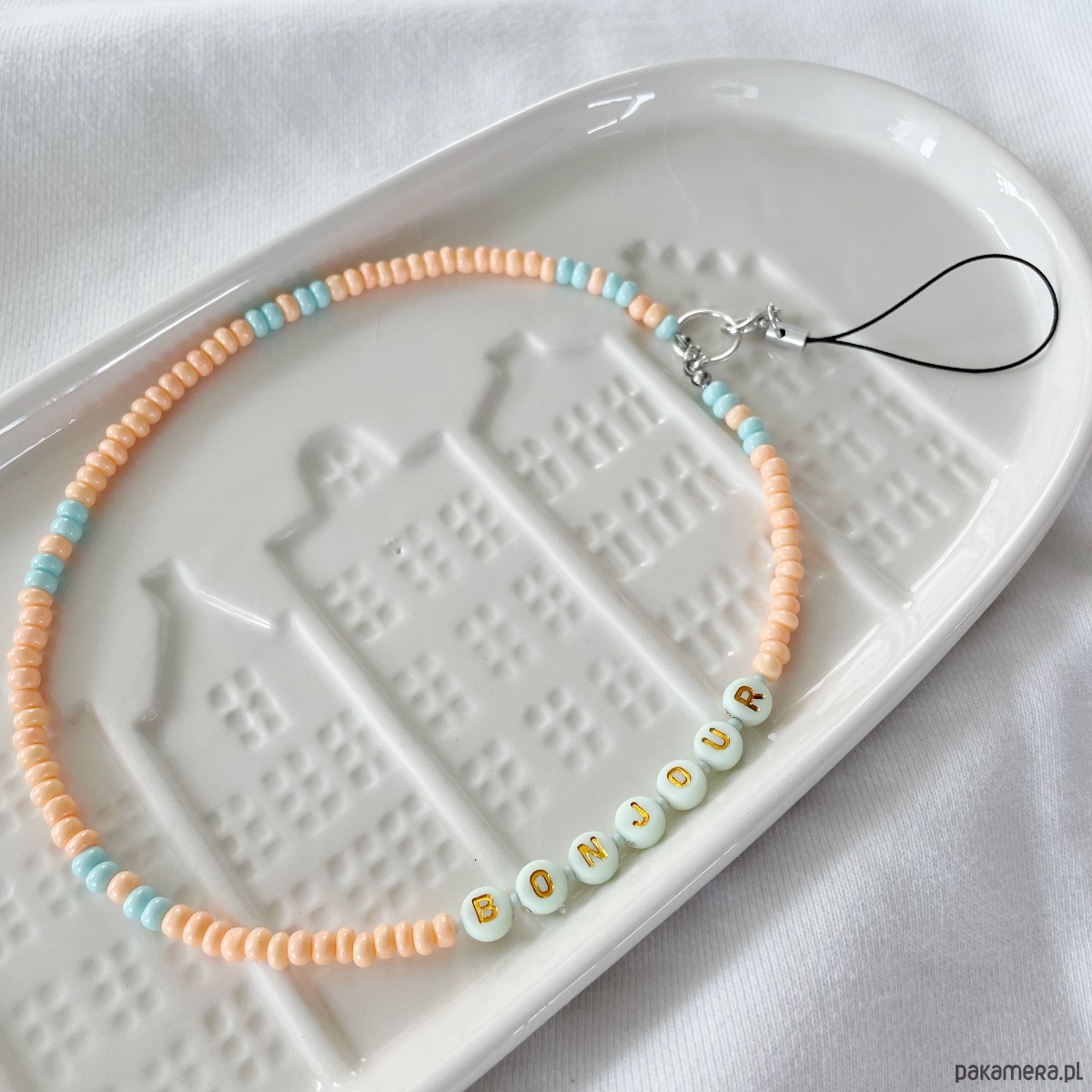 Charms do telefonu wykonany własnoręcznie ze szklanych koralików, akrylowych literek i żyłki jubilerskiej. Zapięcie i dodatki ze stali chirurgicznej. Kolory: brzoskwiniowe i błękitne, literki złote na miętowym tle.