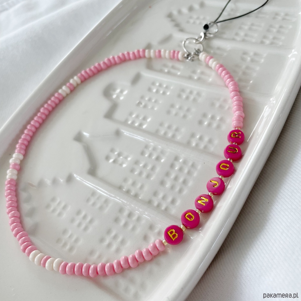 Charms do telefonu wykonany własnoręcznie ze szklanych koralików, akrylowych literek i żyłki jubilerskiej. Zapięcie i dodatki ze stali chirurgicznej. Kolory: brzoskwiniowe i błękitne, literki złote na miętowym tle.
