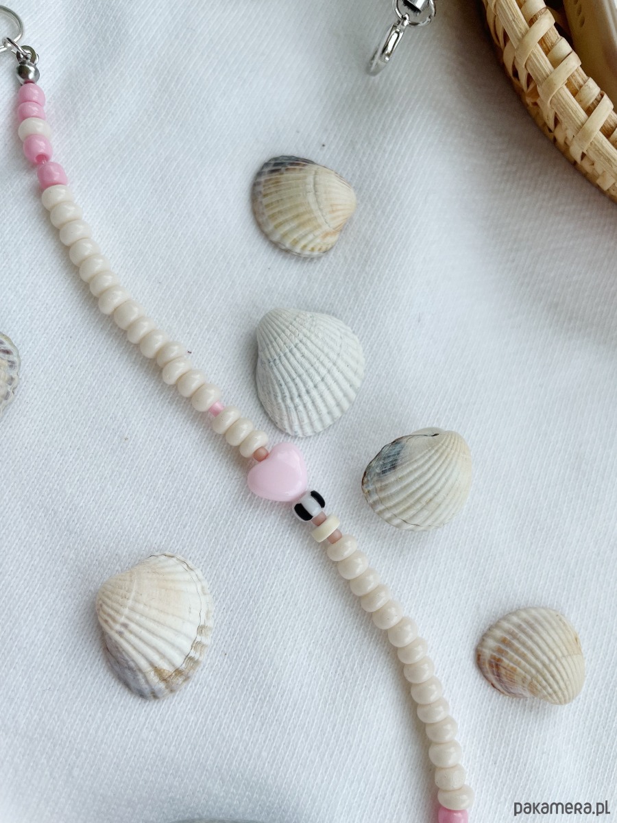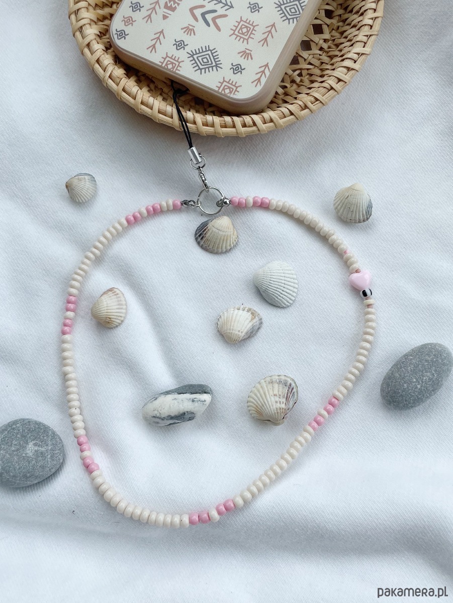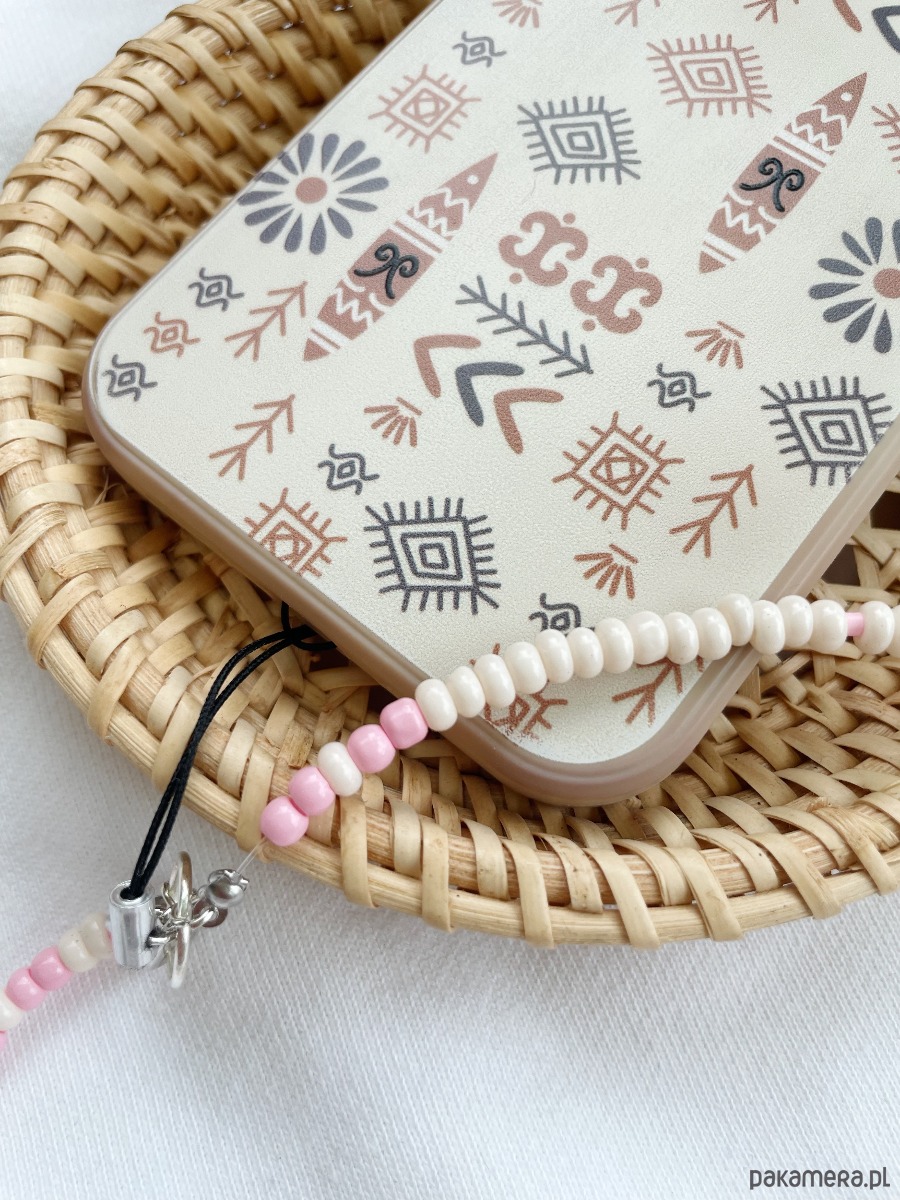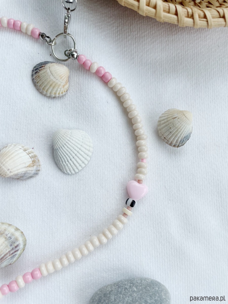 Charms do telefonu wykonany własnoręcznie ze szklanych koralików i ceramicznych koralików i żyłki jubilerskiej. Zapięcie i dodatki ze stali chirurgicznej.