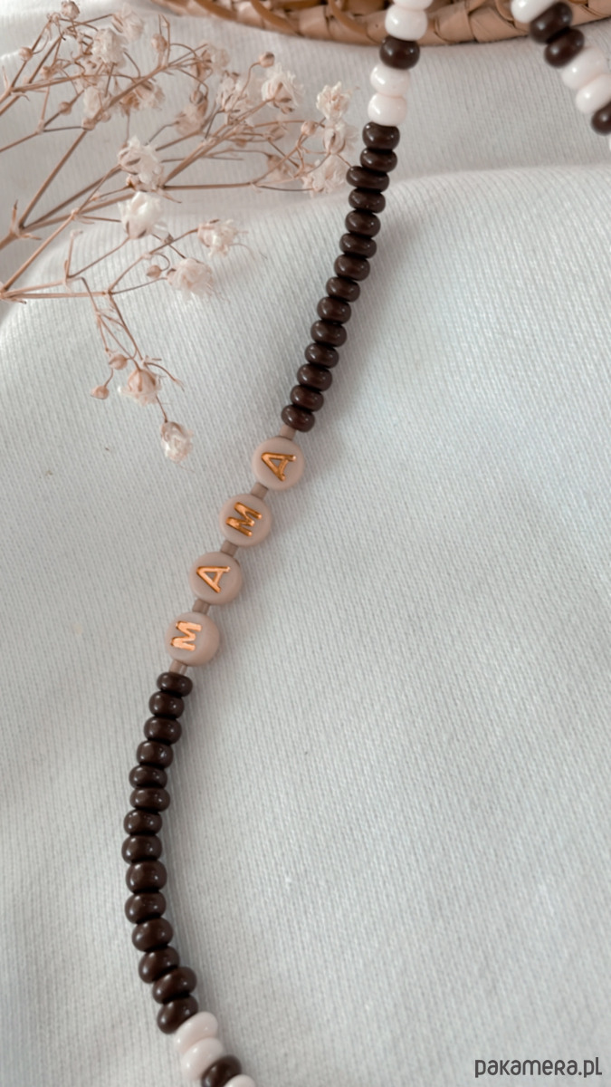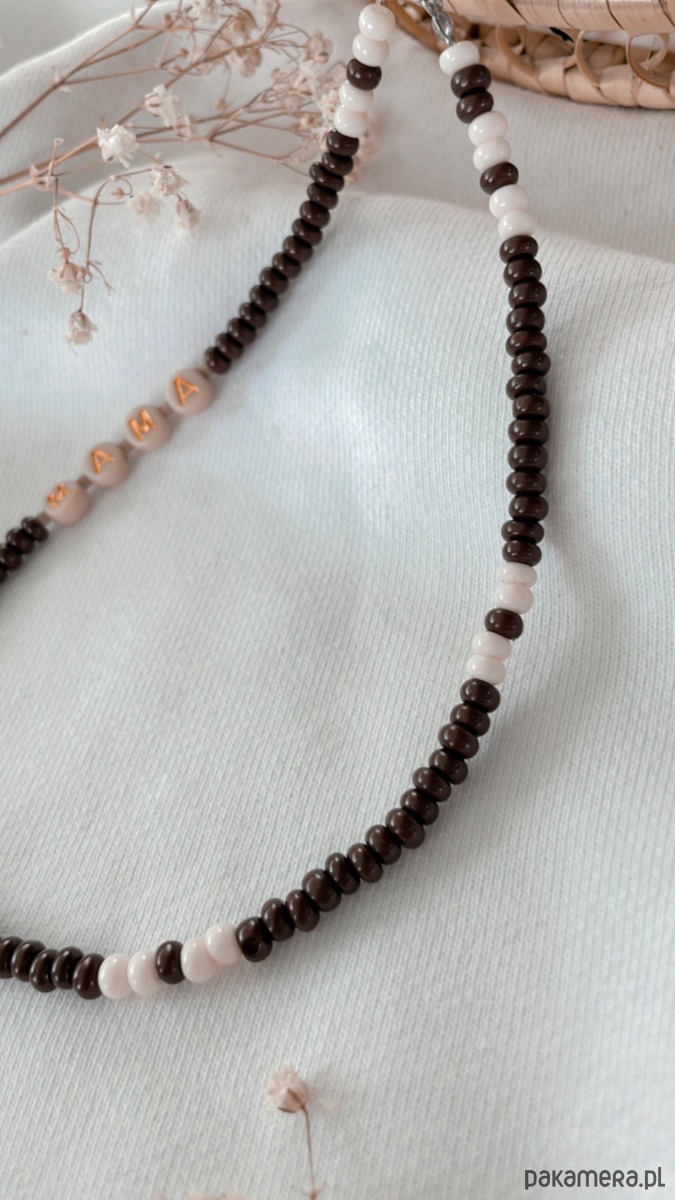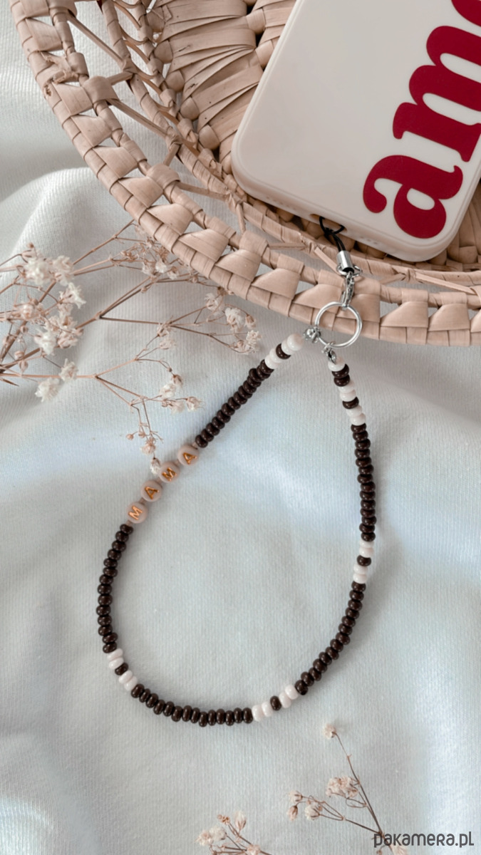 Charms do telefonu wykonany własnoręcznie ze szklanych koralików, akrylowych literek i żyłki jubilerskiej. Zapięcie i dodatki ze stali chirurgicznej. Kolory: koraliki czekoladowe i kremowe, literki złote na beżowym tle.
