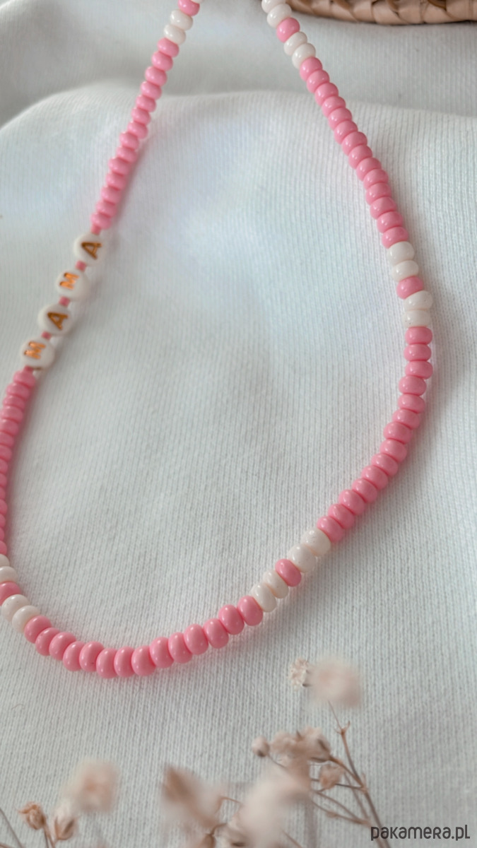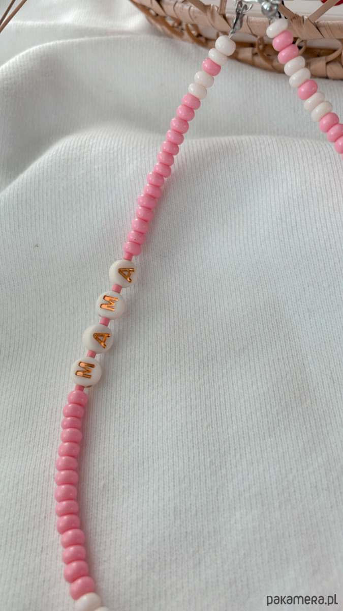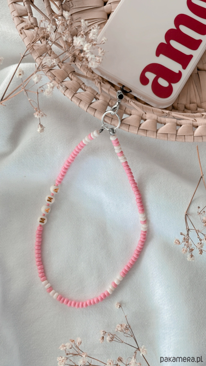 Charms do telefonu wykonany własnoręcznie ze szklanych koralików, akrylowych literek i żyłki jubilerskiej. Zapięcie i dodatki ze stali chirurgicznej. Kolory: koraliki różowe i kremowe, literki złote na kremowym tle.