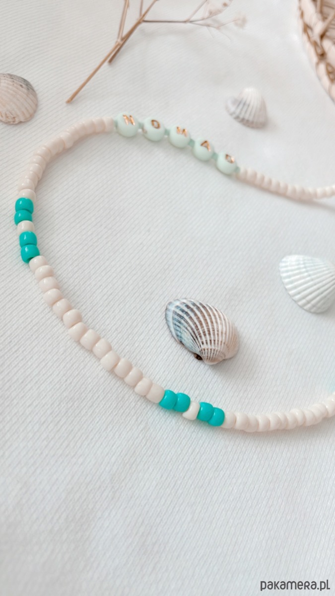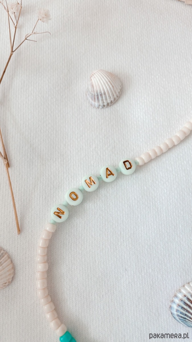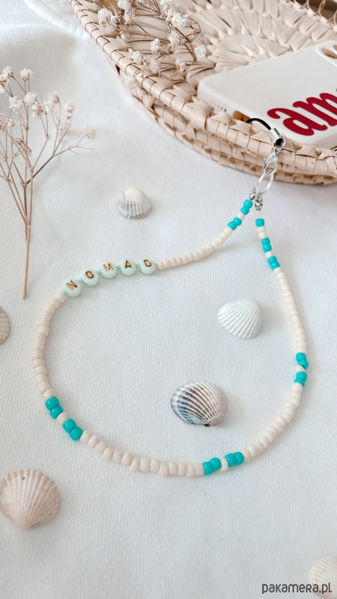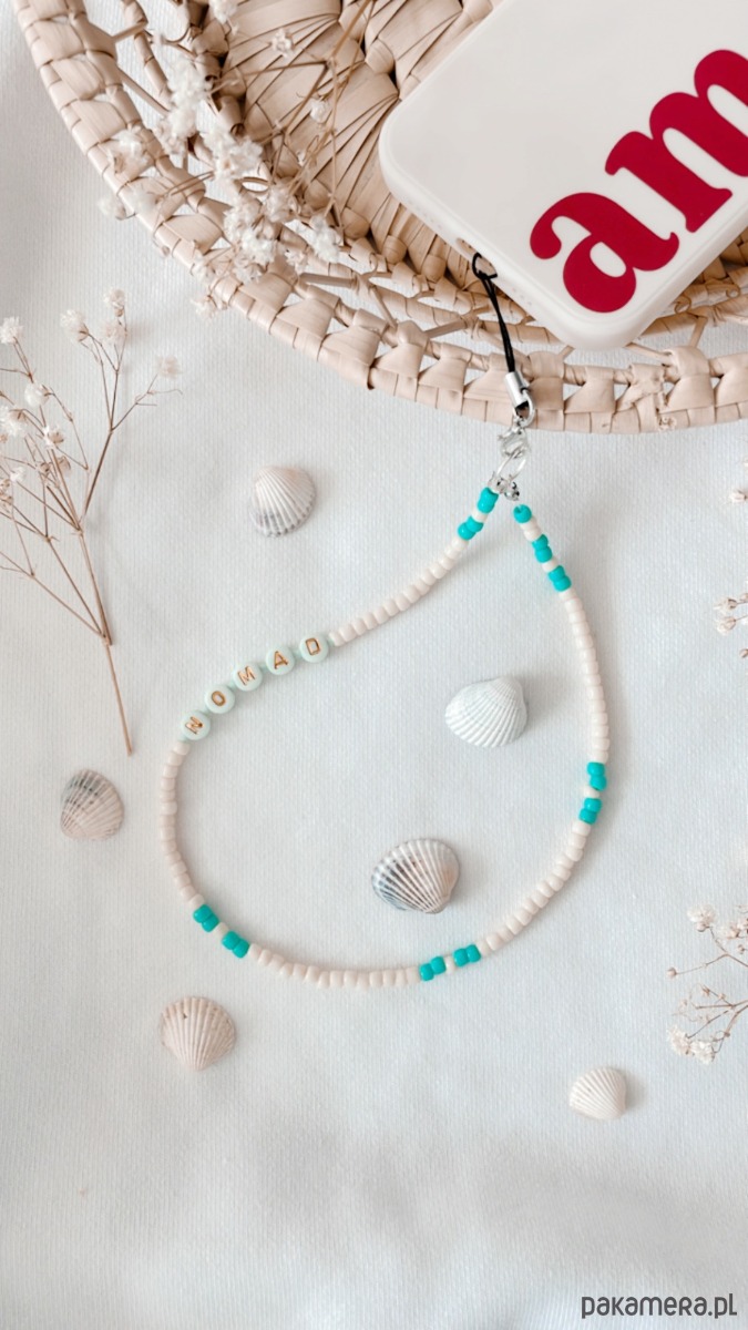 Charms do telefonu wykonany własnoręcznie ze szklanych koralików, akrylowych literek i żyłki jubilerskiej. Zapięcie i dodatki ze stali chirurgicznej.