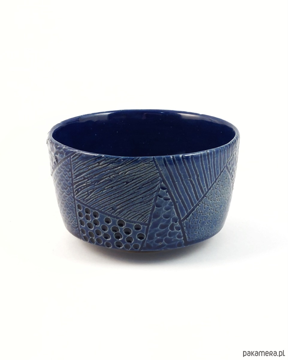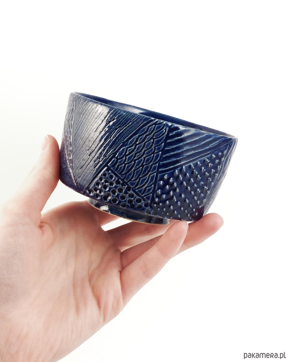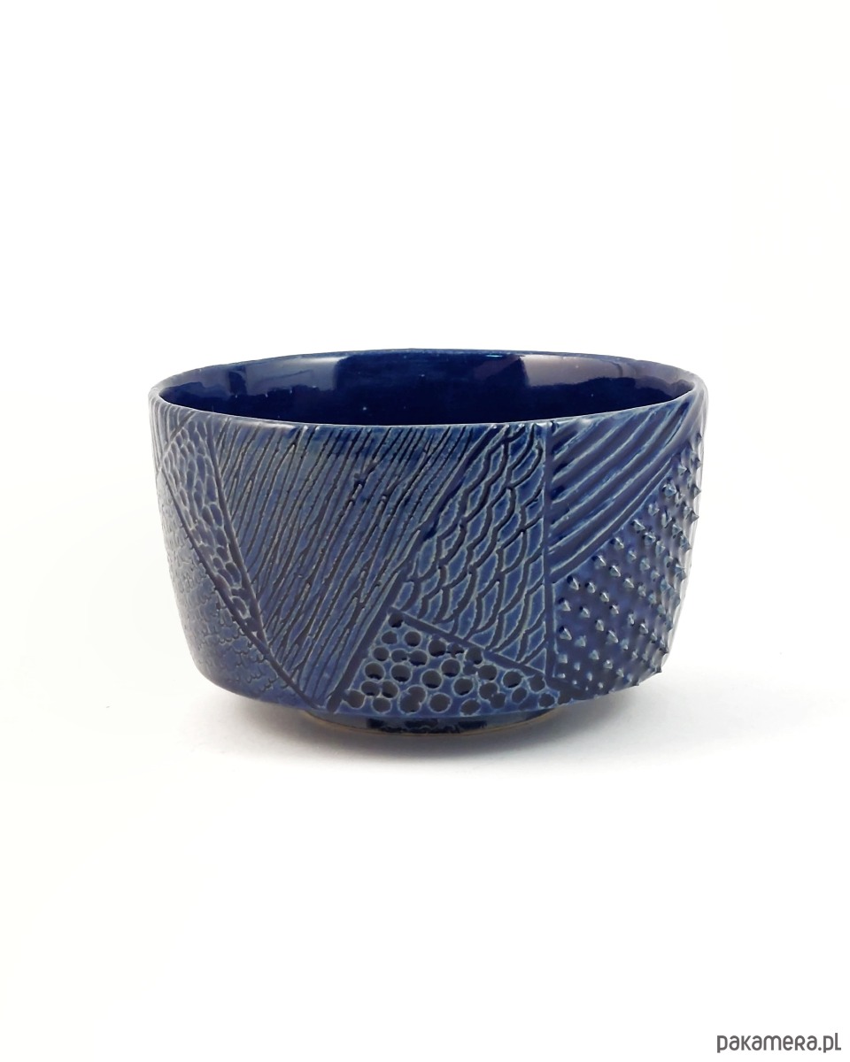 Chawan do przyrządzania i picia zielonej herbaty. Ozdobiony abstrakcyjną teksturą w kolorze granatowym.