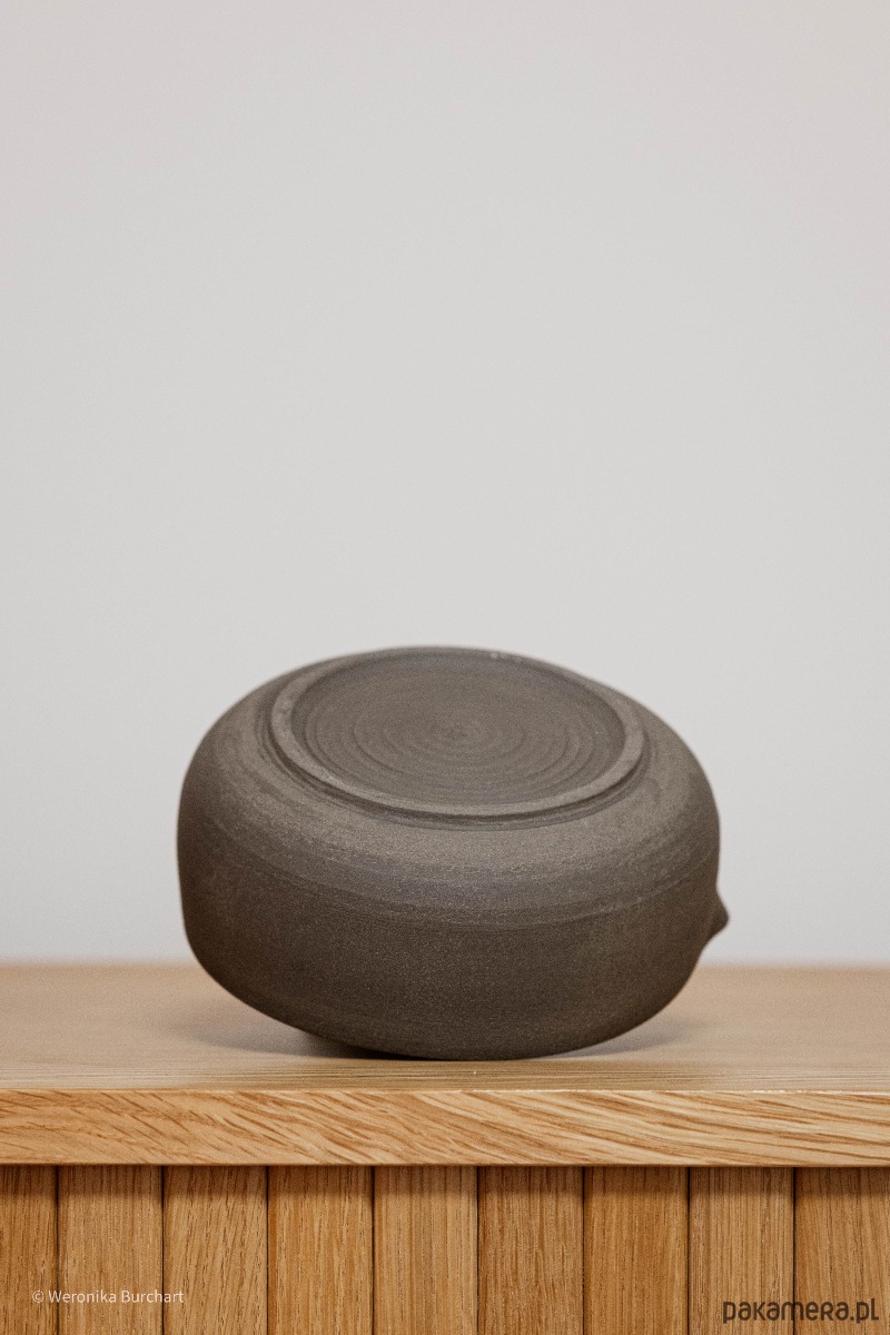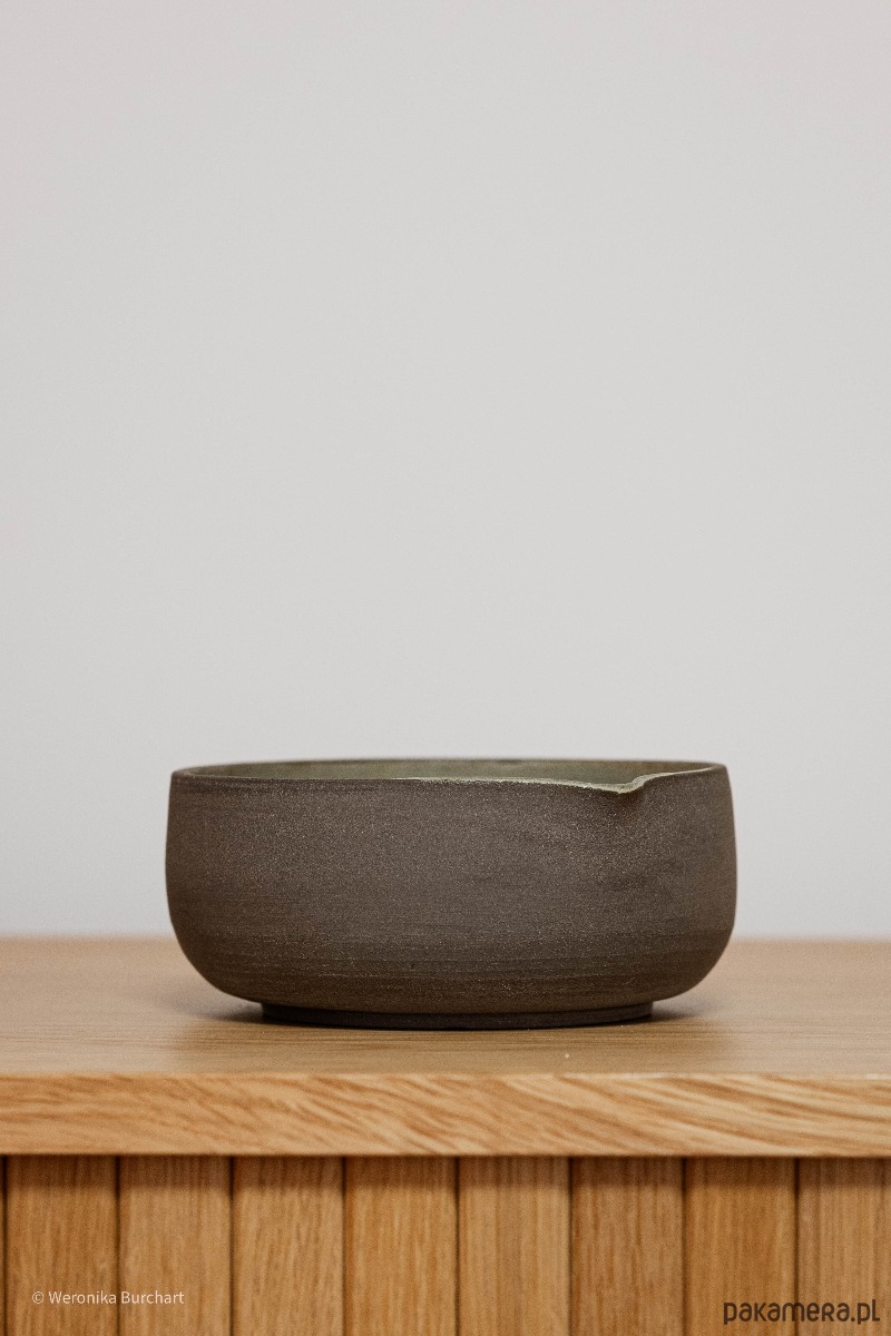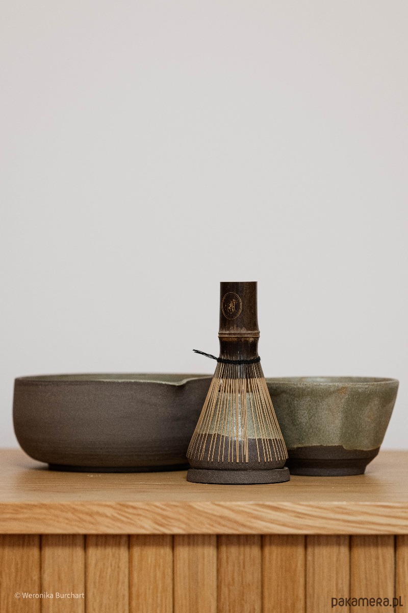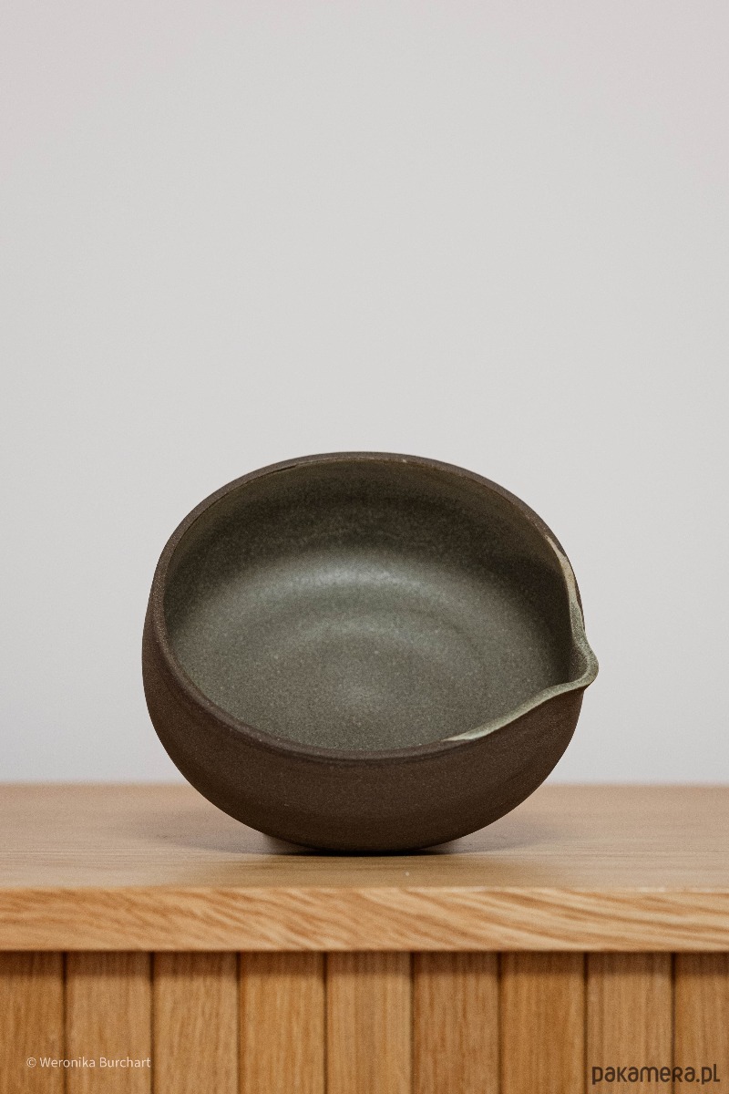 Wykonany z czarnej gliny, która nadaje mu szlachetnej wagi i sprawia, że misa pewnie leży w dłoni podczas intensywnego mieszania. Wnętrze pokrywa matowe szkliwo w kolorze szałwii. Ta uspokajająca, ziemista barwa wprowadza harmonię i wyciszenie, idealnie komponując się z intensywną zielenią Matchy.