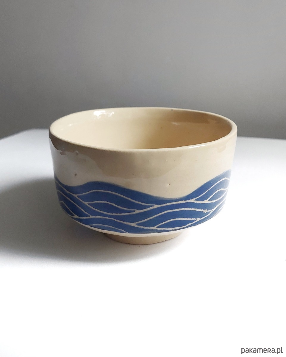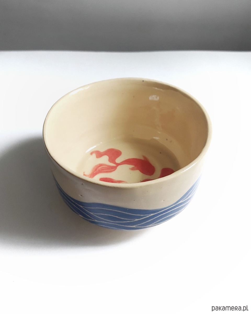 Chawan do przyrządzania i picia zielonej herbaty. Miseczka z namalowanymi w środku rybkami Koi, na zewnątrz ozdobiona morzem.