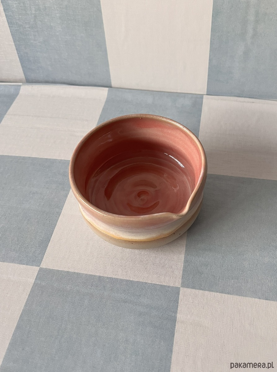 Chawan stworzony z myślą o rytuale parzenia i picia matchy. Wewnątrz - delikatnie błyszczące, różowe szkliwo, które pięknie kontrastuje z różowo-żółtym wykończeniem na zewnątrz naczynia.