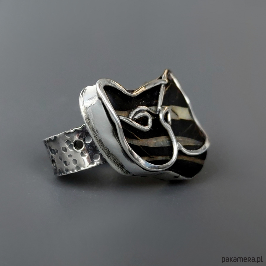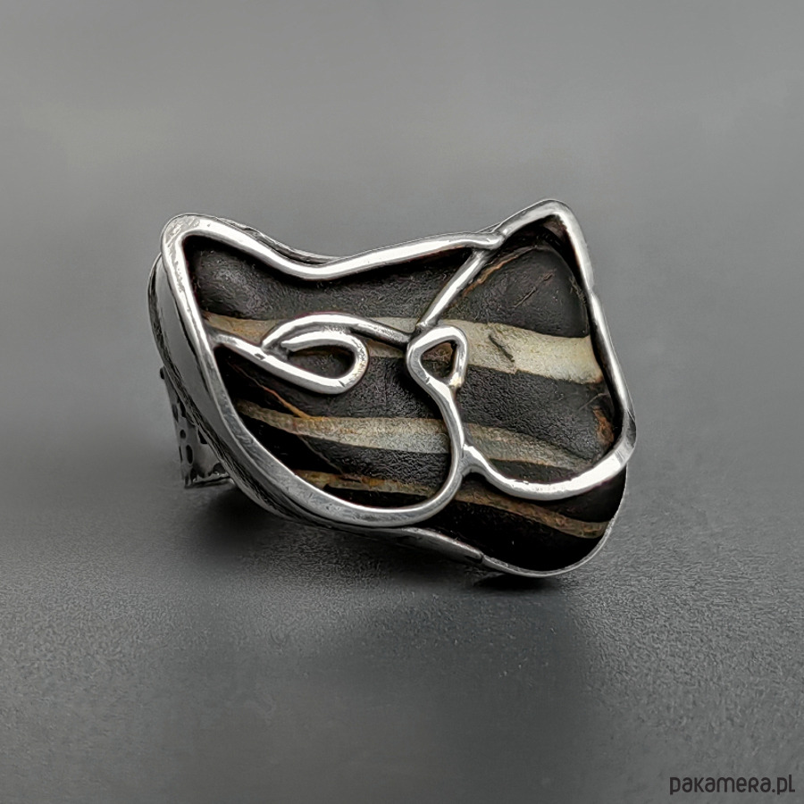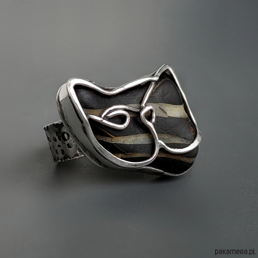 Okazały, ekstrawagancki, przykuwający wzrok pierścionek, wykonany w całości ręcznie ze srebra próby 930 i 999. Ozdobiony pasiastym kamieniem przykrytym srebrnym ażurowym rysunkiem kociego pyszczka. Otwarta perforowana obrączka z łatwością dopasuje się do każdej dłoni. Wymiary korony pierścionka w najszerszym miejscu: ok. 26x25mm. Biżuteria została mocno oksydowana i wypolerowana. Biżuteria zostanie ozdobnie zapakowana.