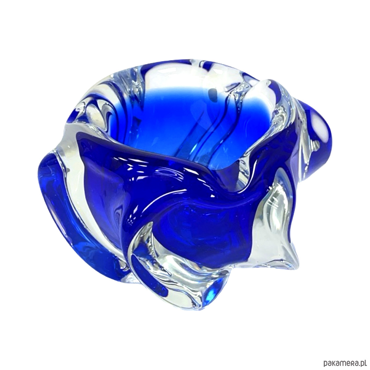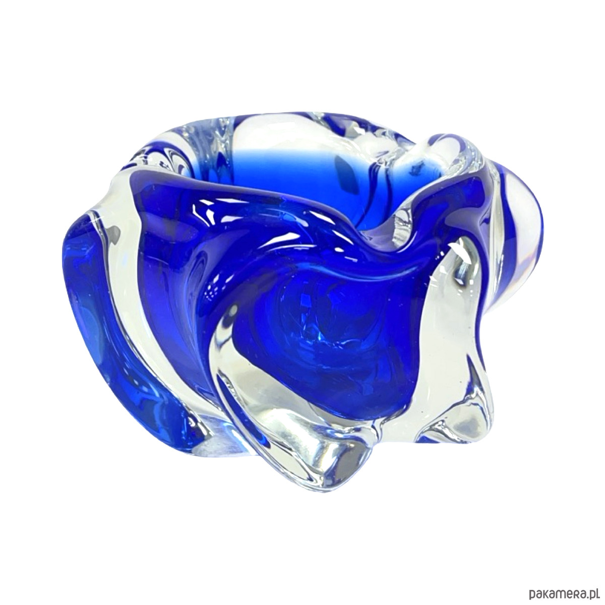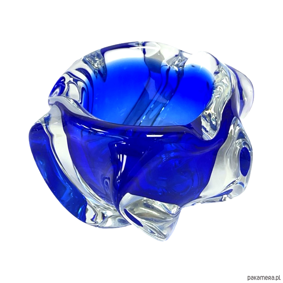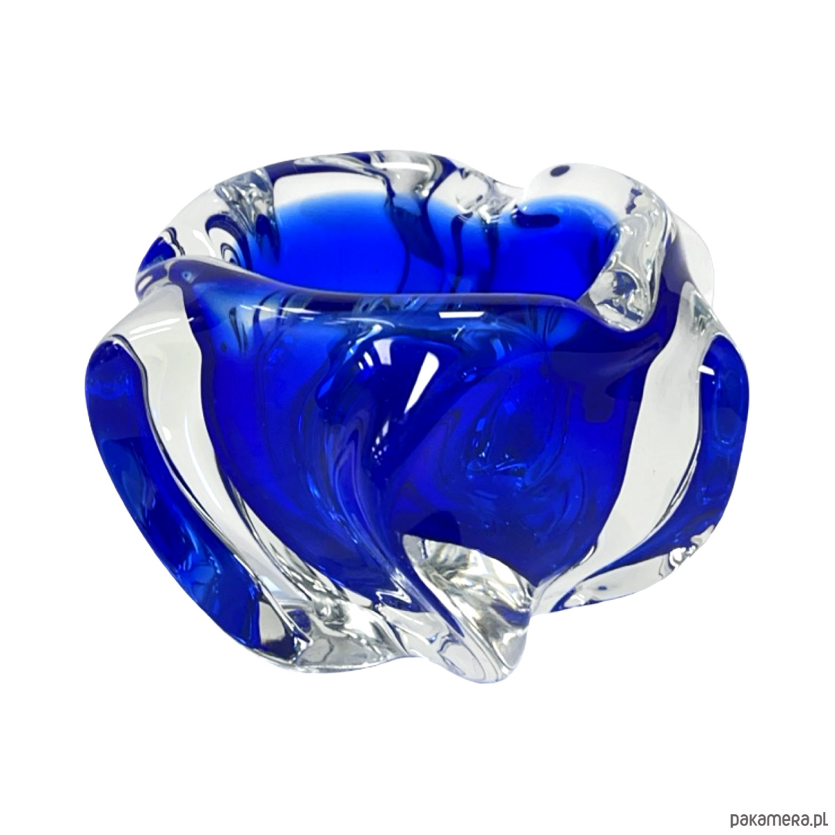Model w charakterystycznej organicznej formie freeform, typowej dla czeskiego modernizmu i nurtu Brussels Style / Mid-Century Modern. Dynamiczne, rzeźbiarskie kształty z głębokim kobaltowym szkłem zanurzonym w masie bezbarwnej tworzą efekt płynnej, niemal rzeźbiarskiej bryły.