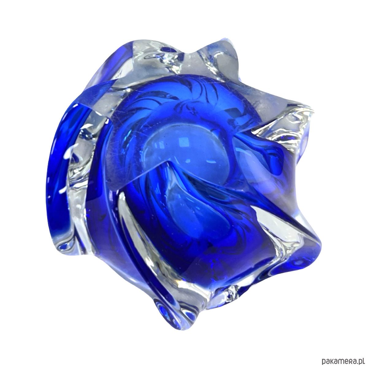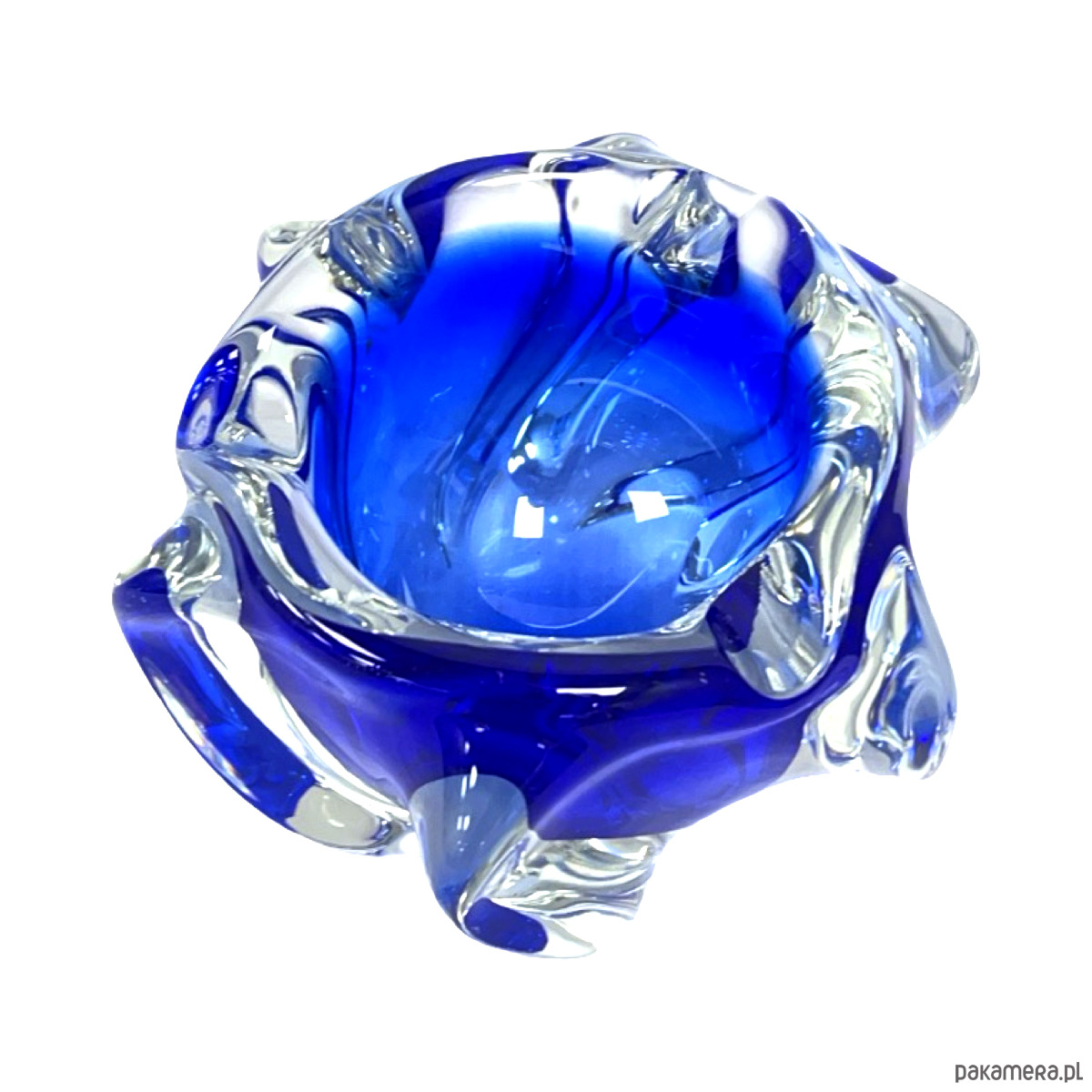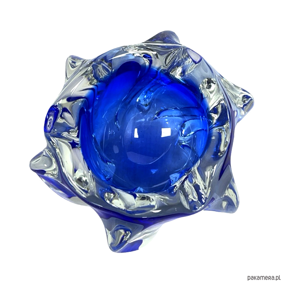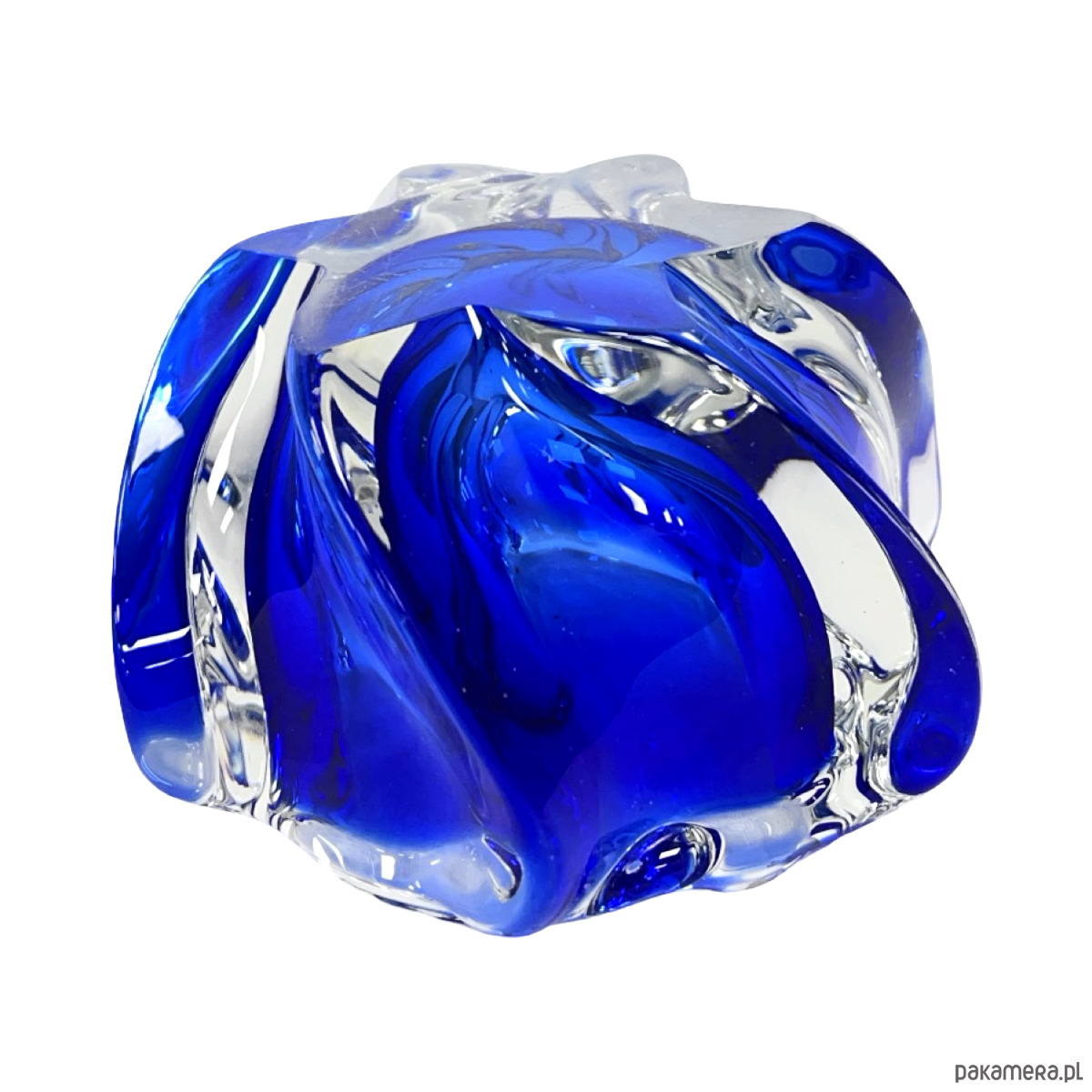 Model w charakterystycznej organicznej formie freeform, typowej dla czeskiego modernizmu i nurtu Brussels Style / Mid-Century Modern. Dynamiczne, rzeźbiarskie kształty z głębokim kobaltowym szkłem zanurzonym w masie bezbarwnej tworzą efekt płynnej, niemal rzeźbiarskiej bryły.