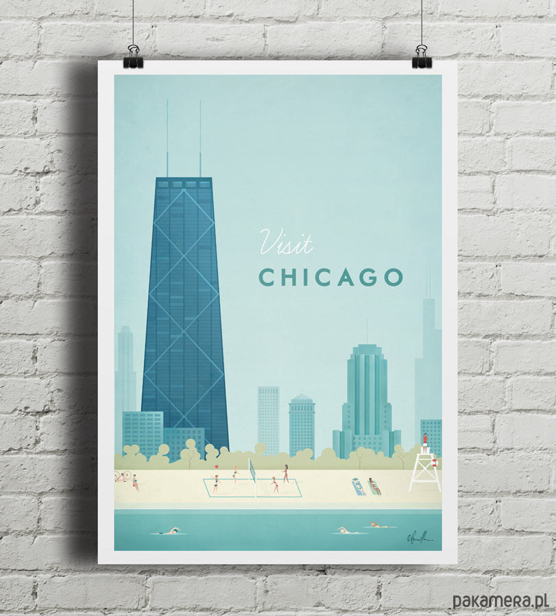 Plakat w stylu vintage przedstawiający ludzi wypoczywających na plaży nad jeziorem Michigan w Chicago. W tle widoczna jest panorama miasta z charakterystycznymi wieżowcami John Hancock Center i Palmolive Building. Inspirowany plakatami podróżniczymi z lat 20-tych XX wieku.