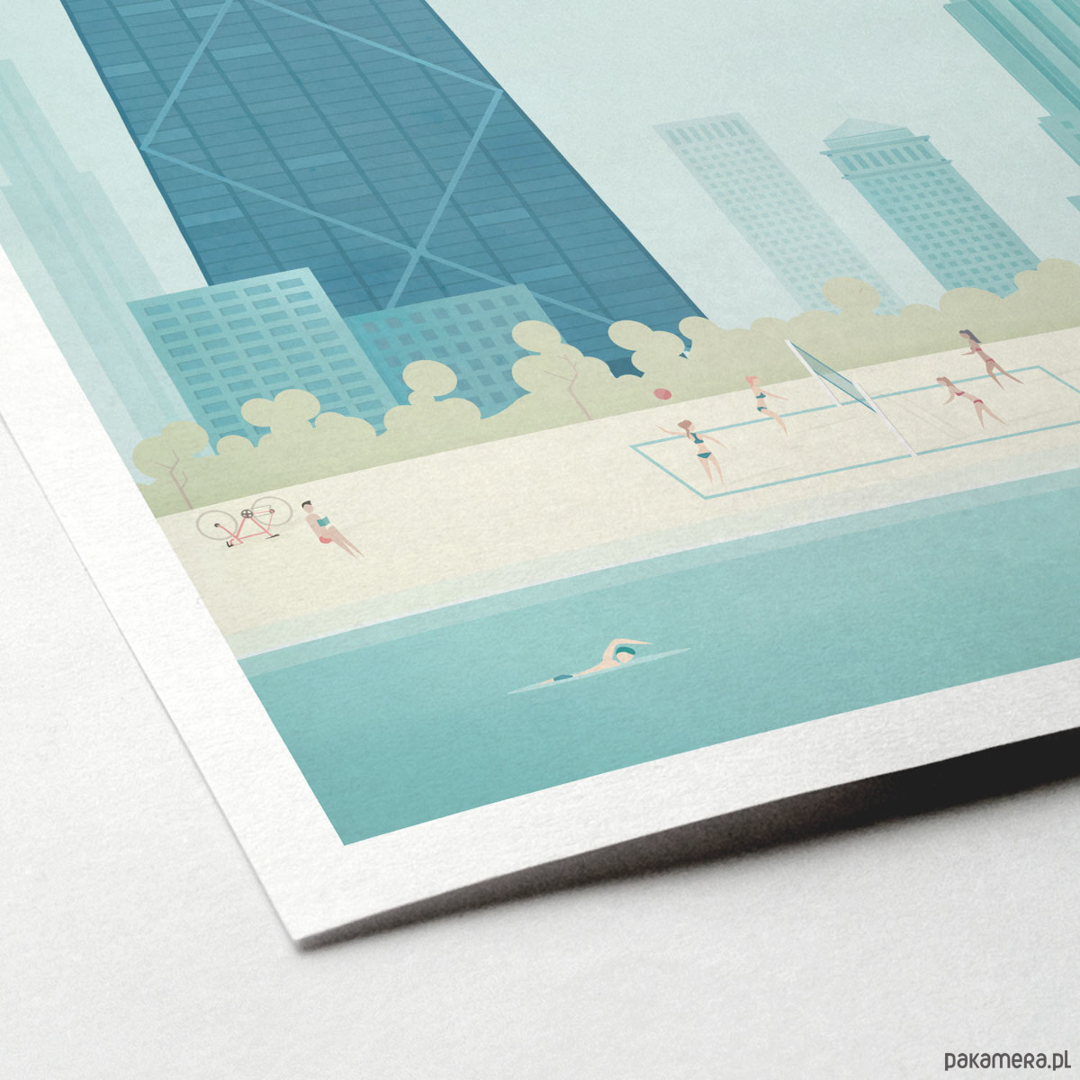 Plakat w stylu vintage przedstawiający ludzi wypoczywających na plaży nad jeziorem Michigan w Chicago. W tle widoczna jest panorama miasta z charakterystycznymi wieżowcami John Hancock Center i Palmolive Building. Inspirowany plakatami podróżniczymi z lat 20-tych XX wieku.