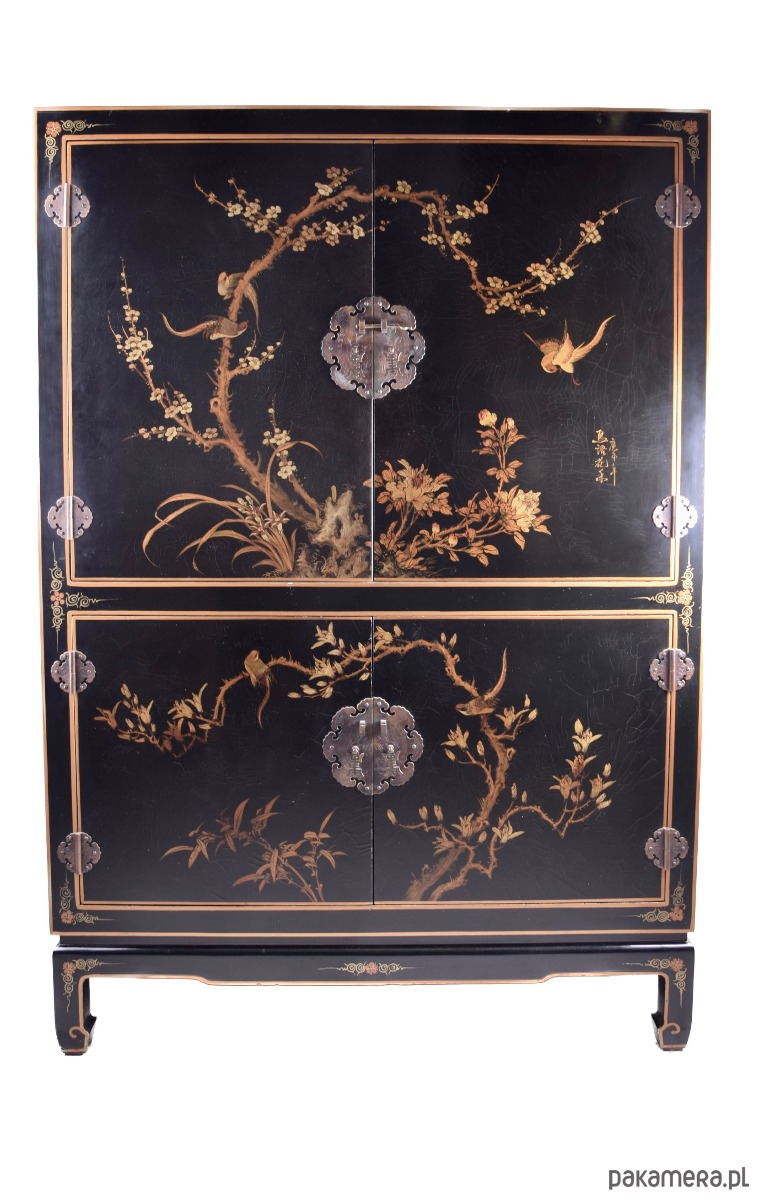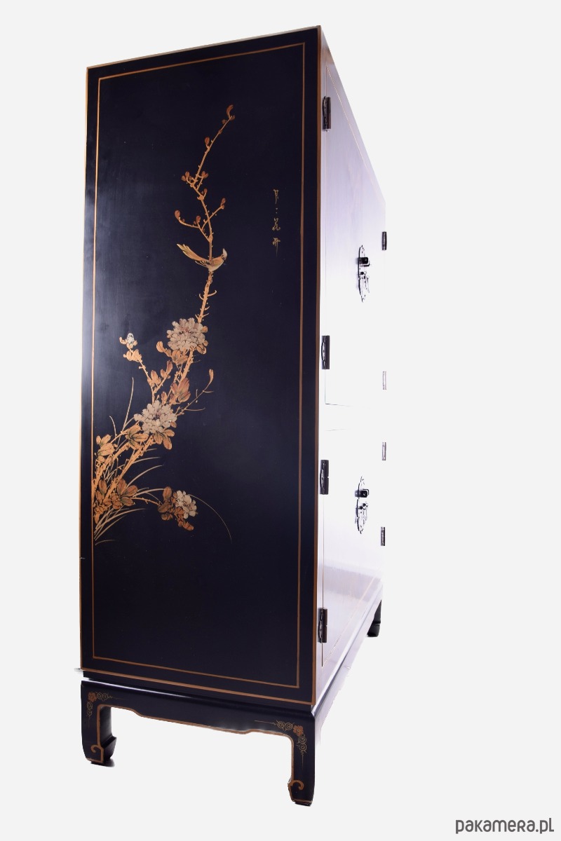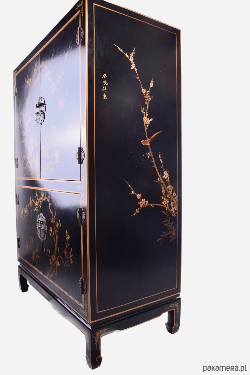 Ręcznie lakierowana szafa o niezwykłej harmonii formy i koloru, będąca przykładem klasycznego kunsztu dalekowschodniego rzemiosła artystycznego. Jej powierzchnię zdobi bogata, lecz wyważona dekoracja malarska – delikatne gałęzie w rozkwicie, ptaki i liście, przedstawione na głębokim, czarnym tle o subtelnym połysku.