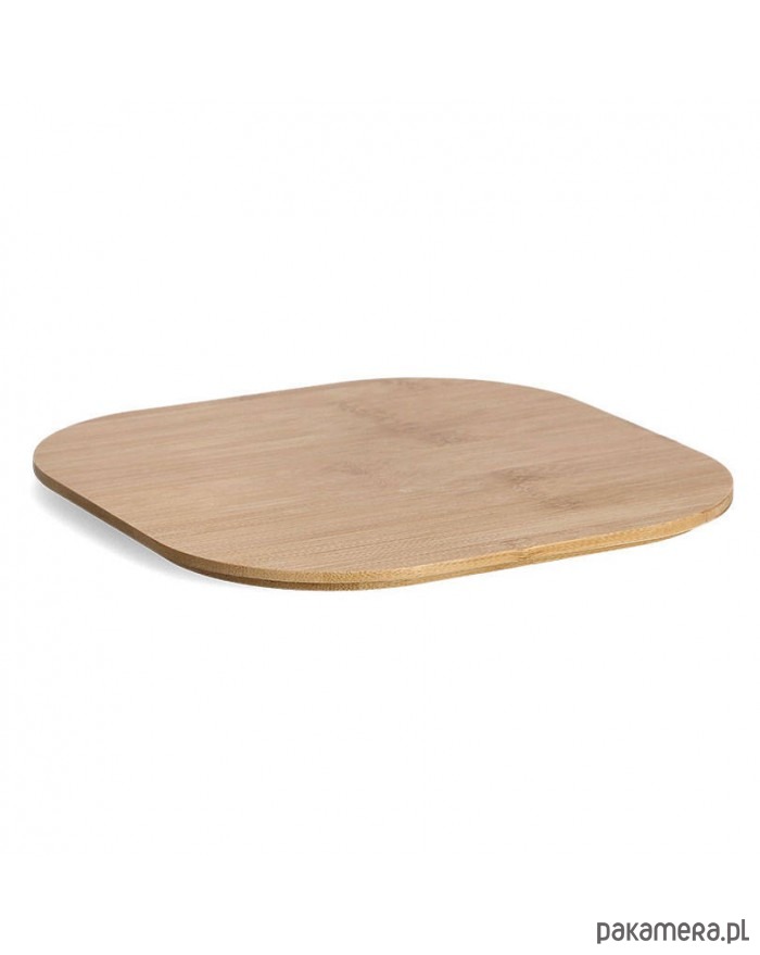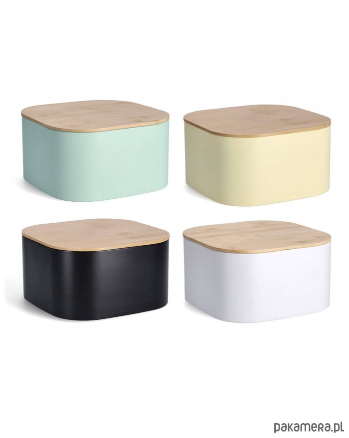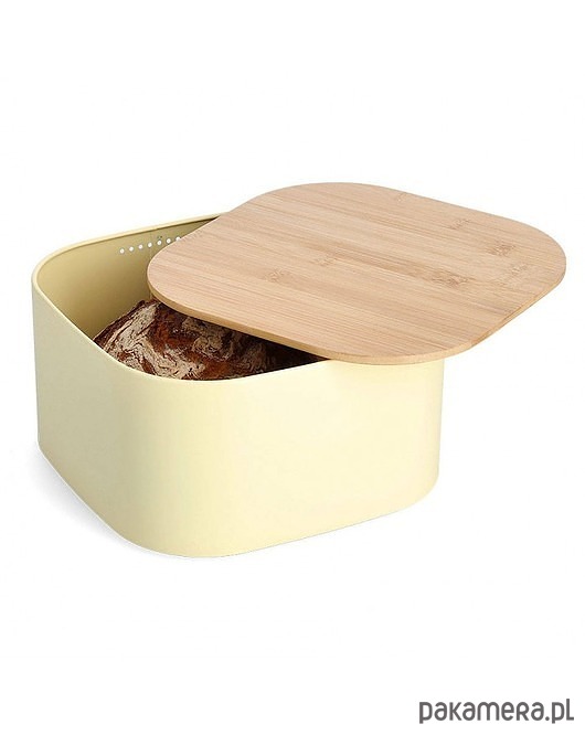 Poręczny chlebak do przechowywania pieczywa o podstawie kwadratu. Wykonany z metalu. Wyposażony w bambusową pokrywkę.