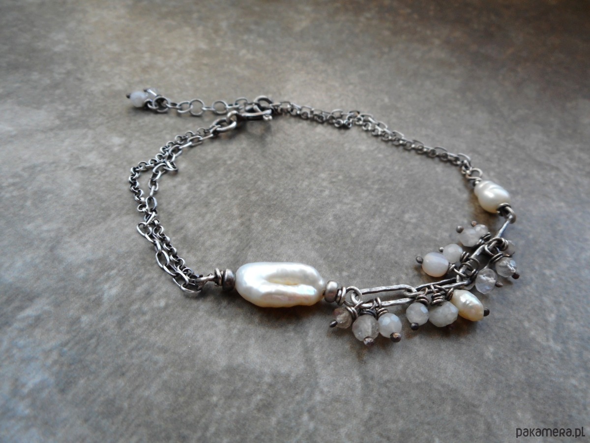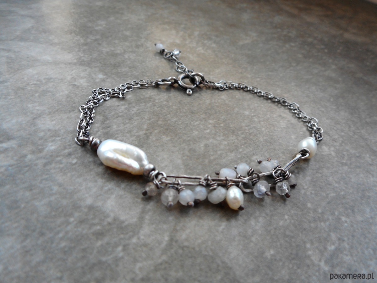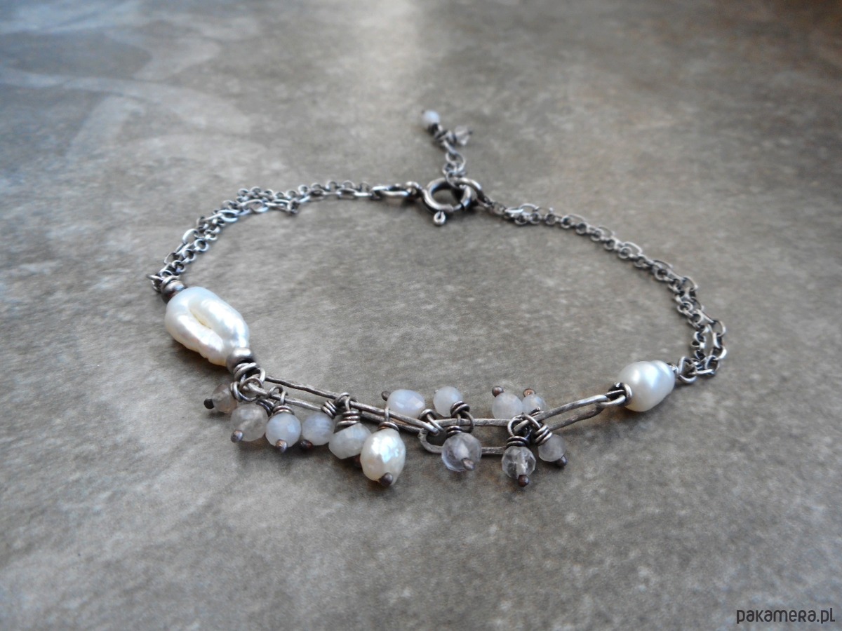 Efektowna bransoletka wykonana z kamieni naturalnych i szlachetnego srebra; wygodna i uniwersalna, połączenie pereł, minerałów w jasnych kolorach i oksydowanego srebra nadaje biżuterii niepowtarzalnego stylu.