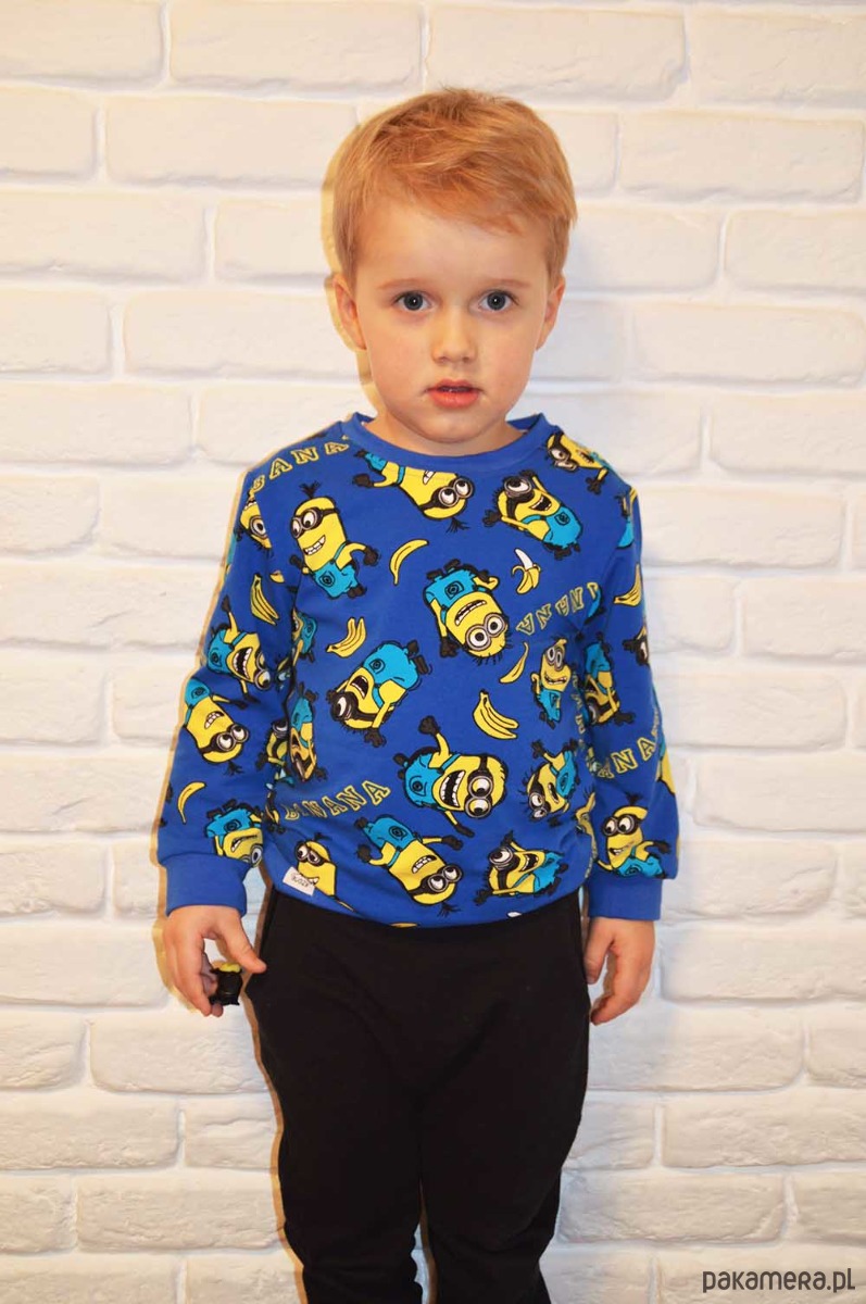 Piękna, niebieska bluza w Minionki z bananami z długim rękawem oraz okrągłym dekoltem wykonana z miękkiej dzianiny dresowej. Rewelacyjny wzór zagwarantuje indywidualny styl Twojemu dziecku. Rękawy wykończone ściągaczem, ściągacz również wokół szyi i na dole. Miła w dotyku, modna i bardzo wygodna. Praktyczne kolory. Idealny wybór dla każdego Malucha, który chce wyróżniać się z tłumu.