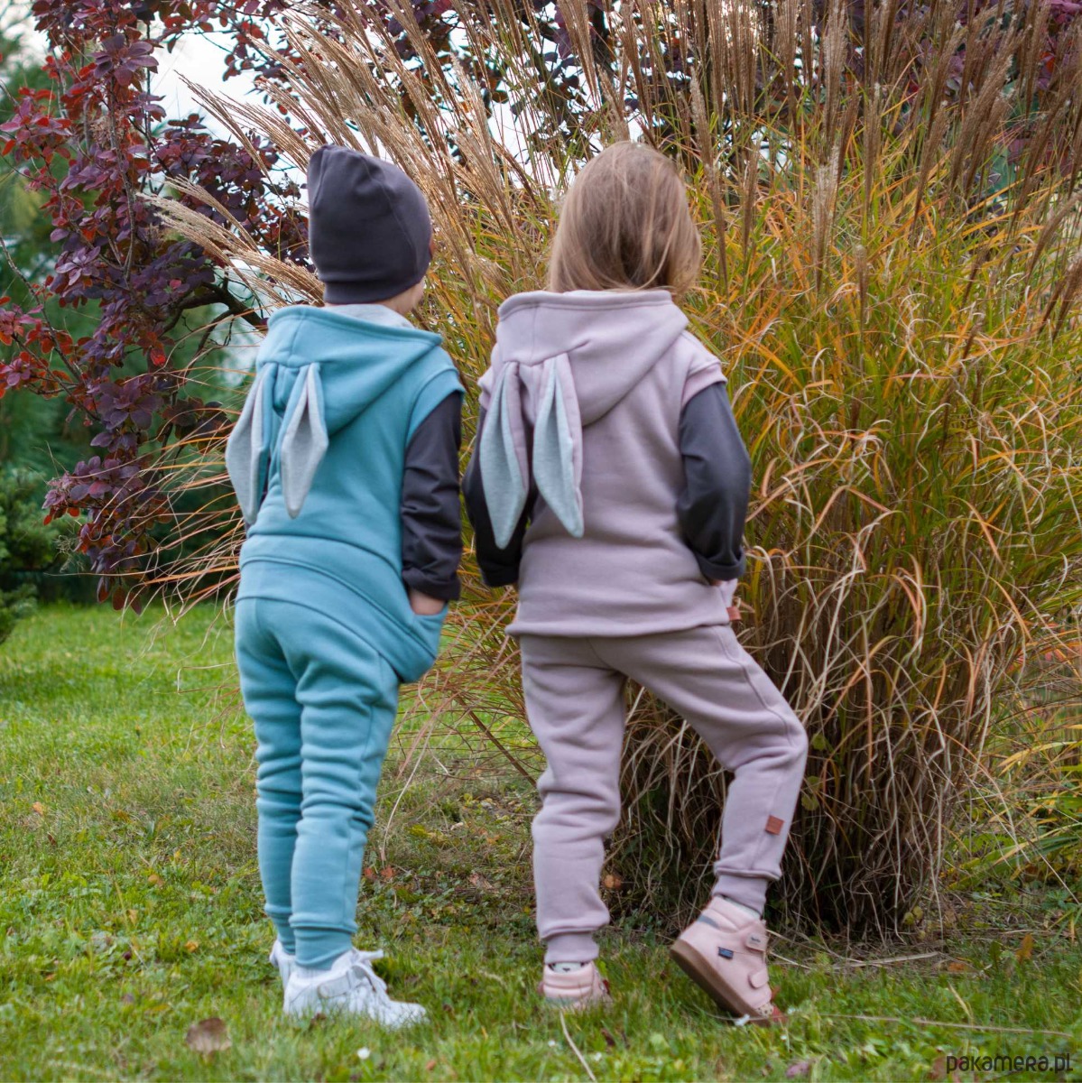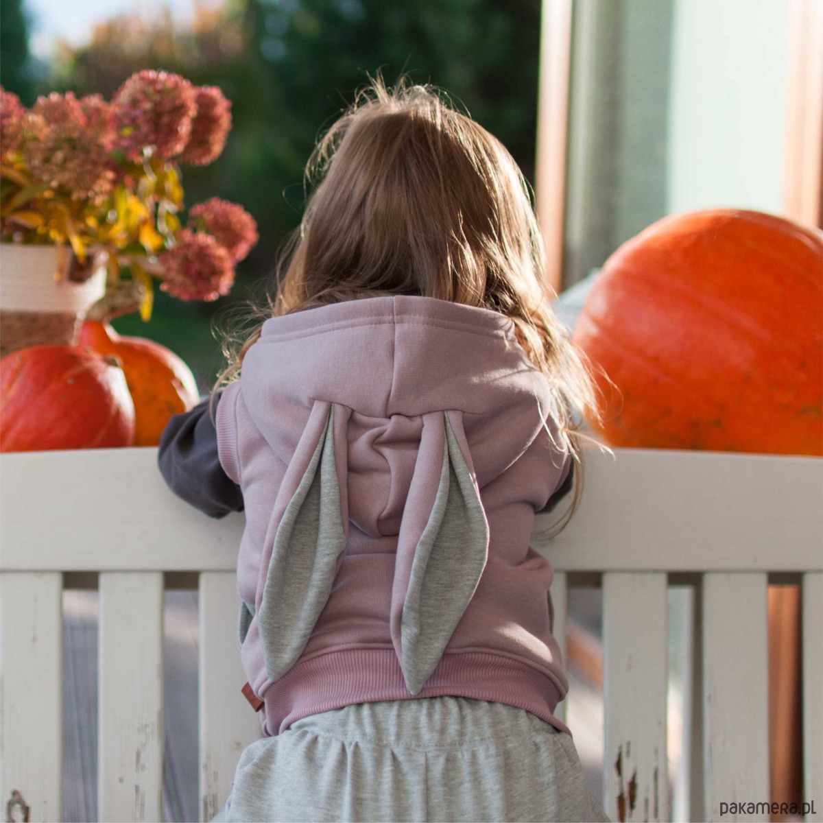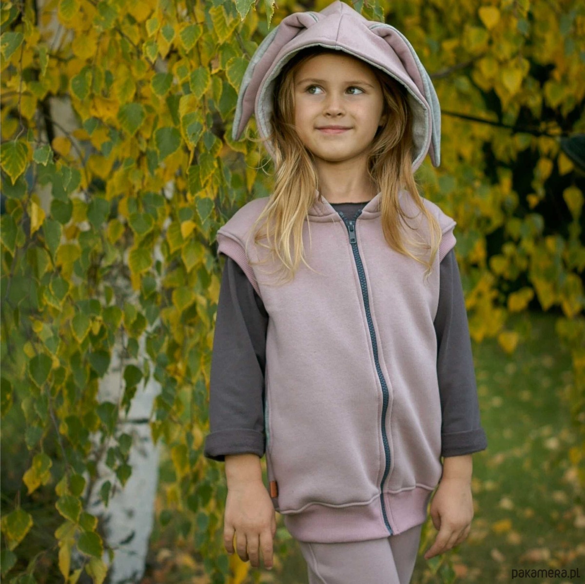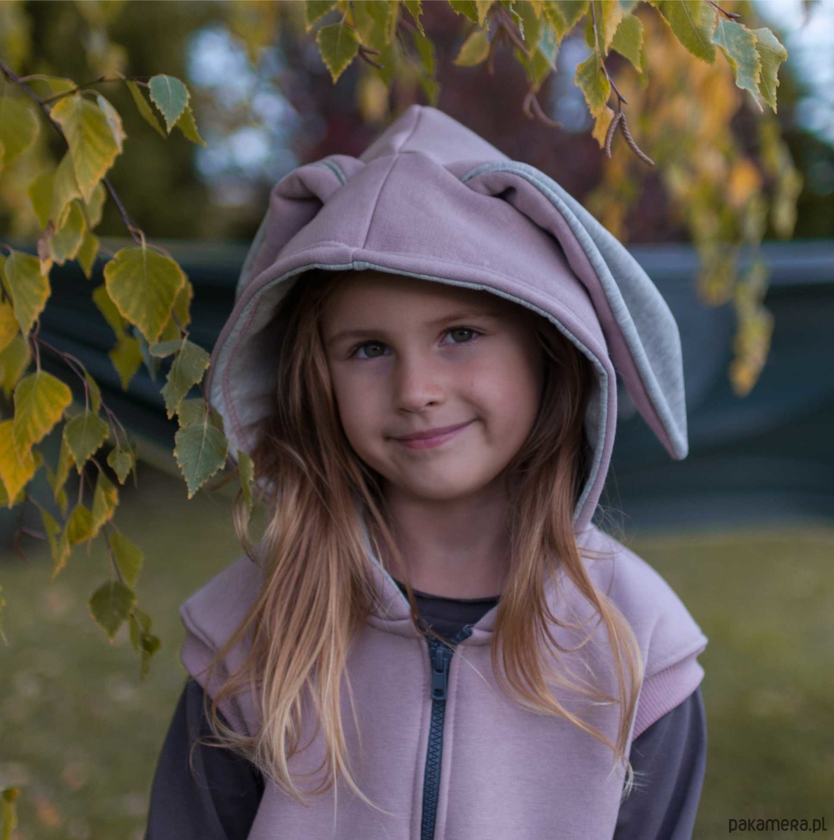 Ciepła kamizelka z uszami królika, zapinana na zamek. Przy kapturku urocze, mięciutkie uszka królika.