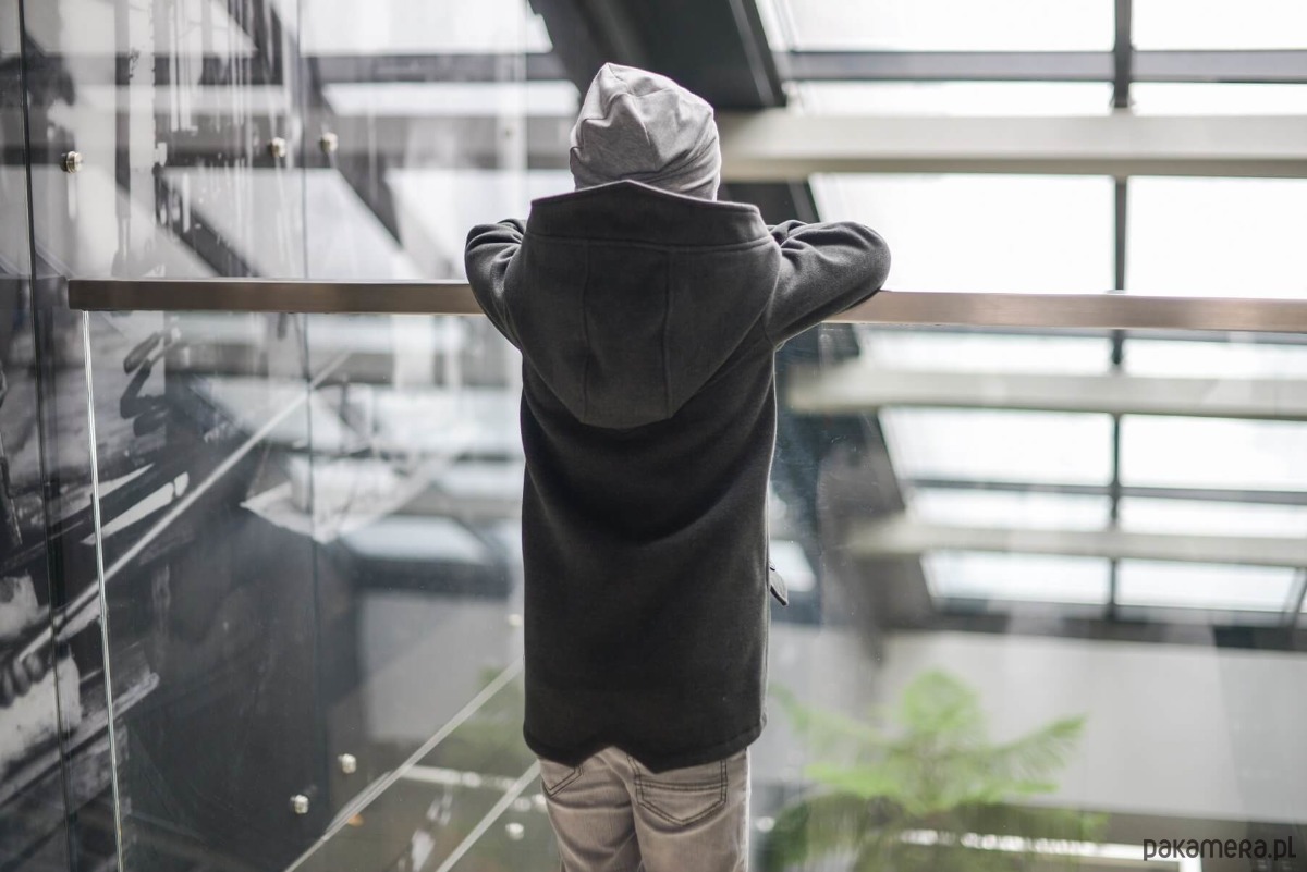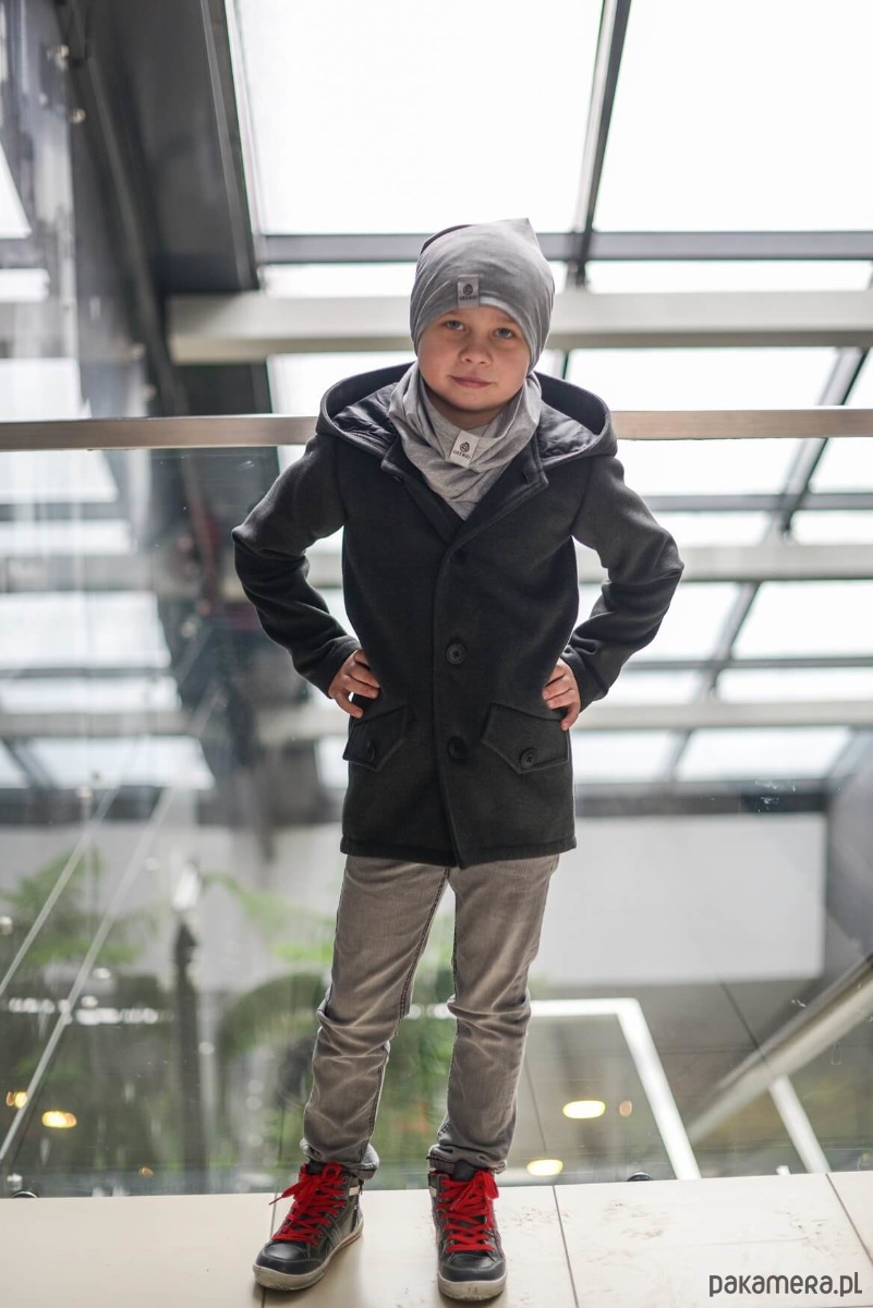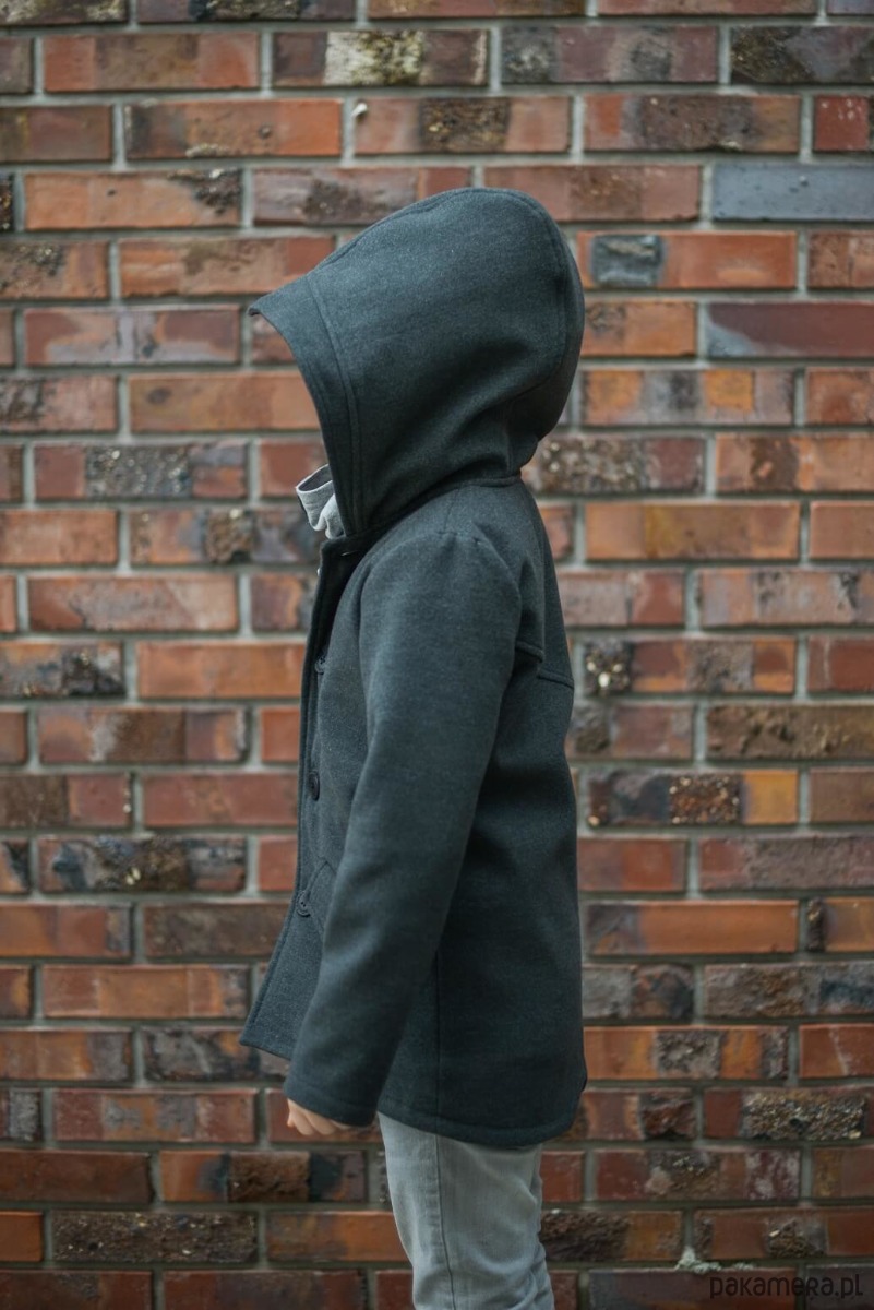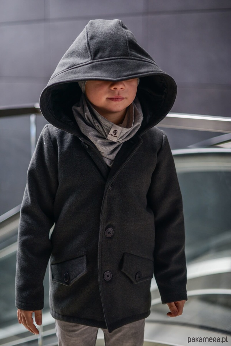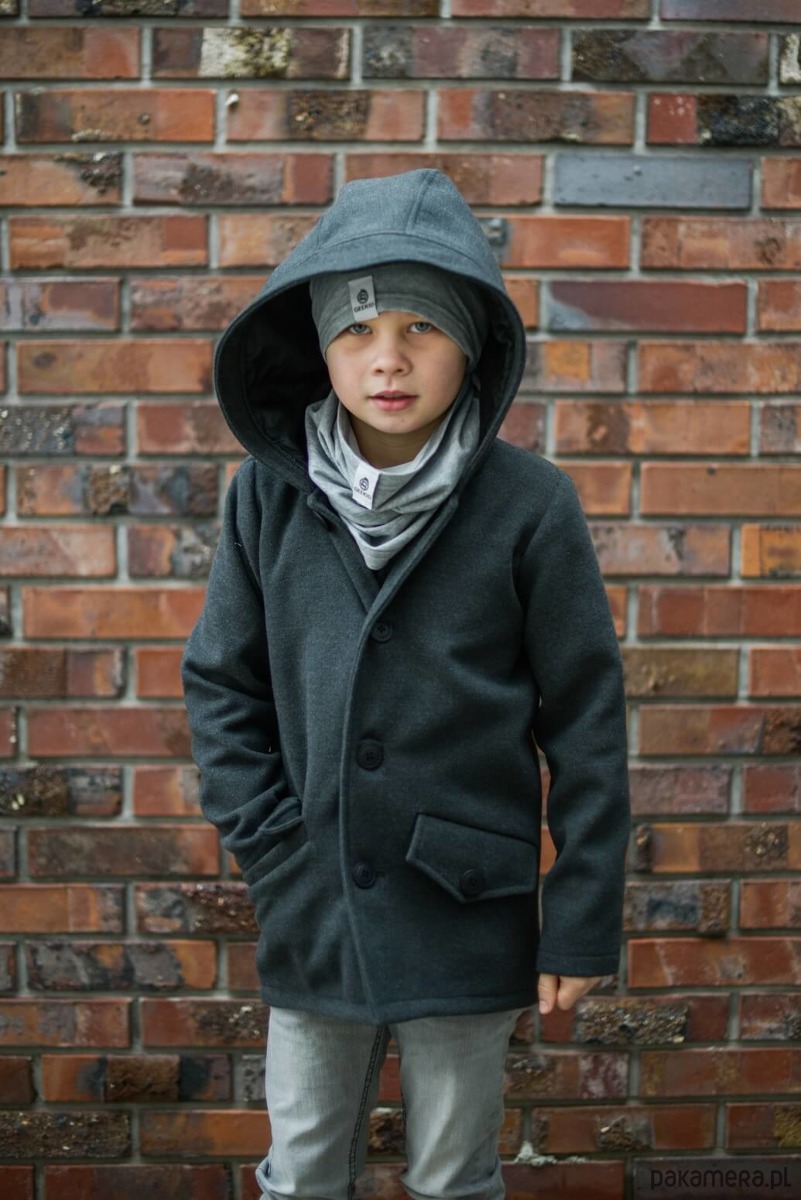 Płaszcz chłopięcy ciemnoszary z kapturem.