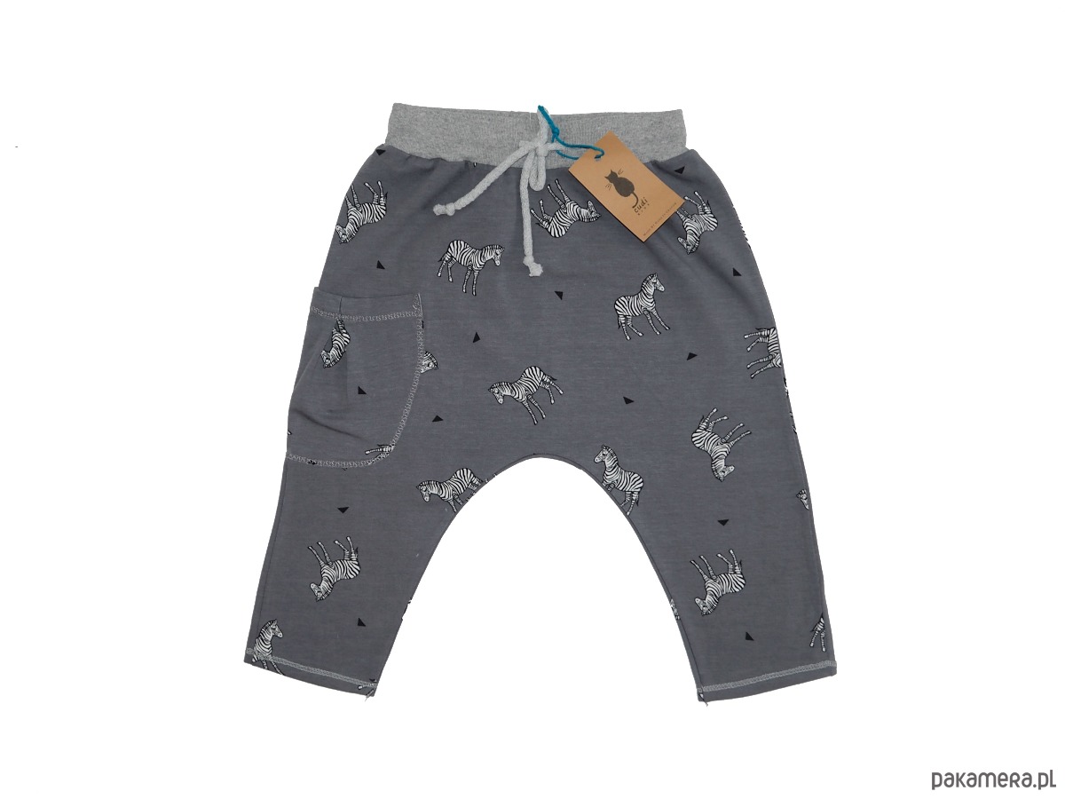 Spodnie rybaczki typu baggy z lekko obniżonym krokiem, naszytą kieszenią z boku.W pasie guma i sznurek do regulacji.