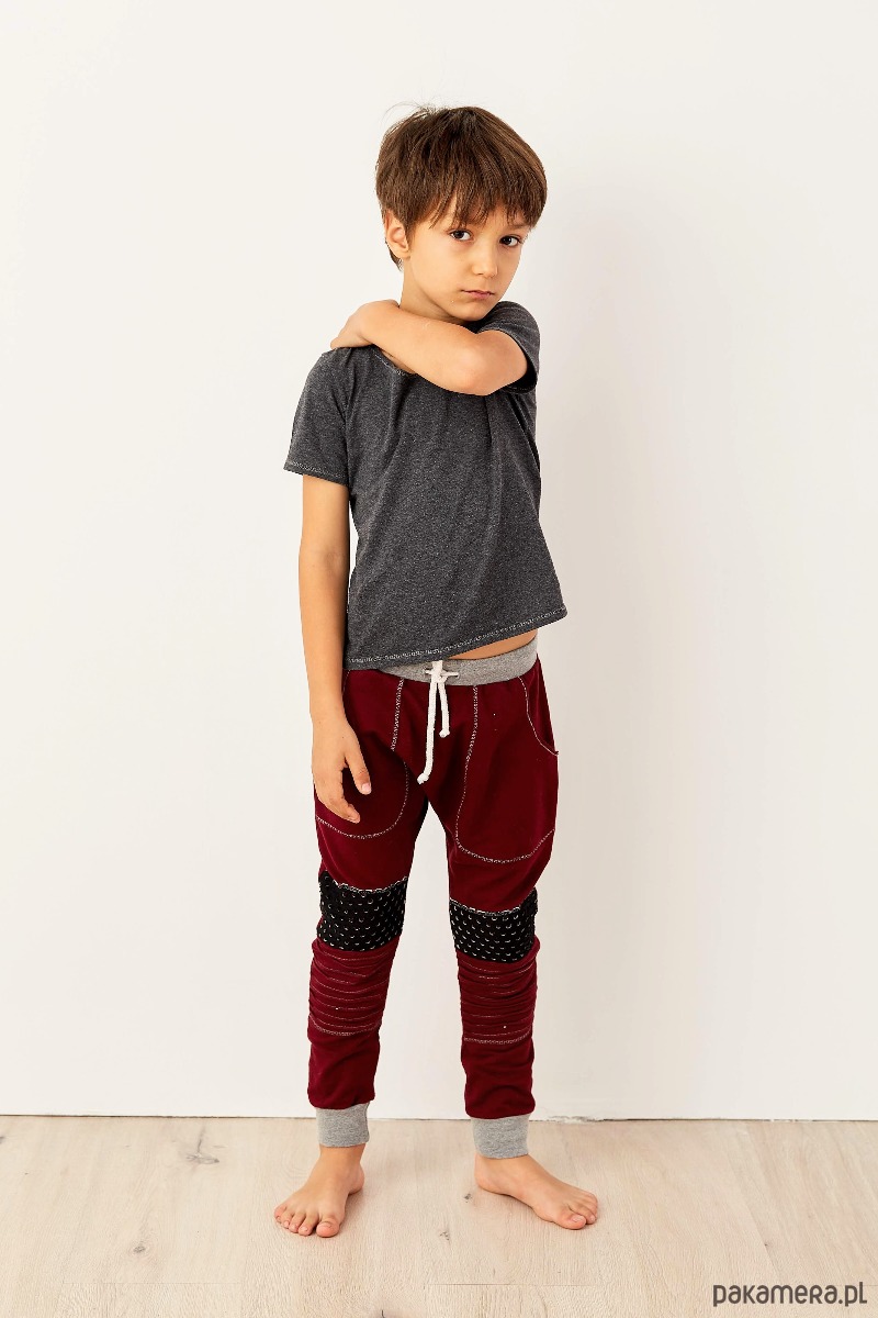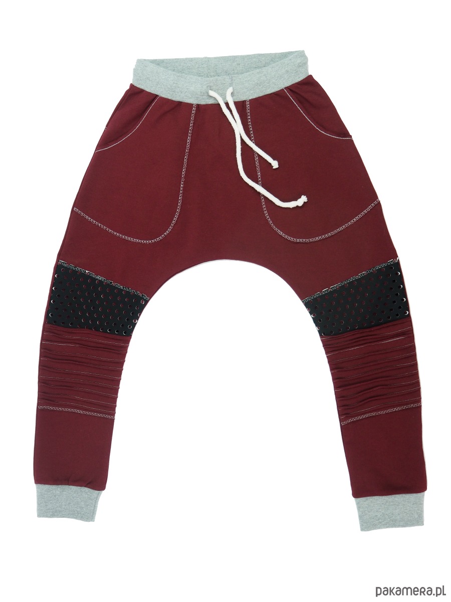 W pasie posiadają troczek do regulacji szerokości, a na kolanach ozdobne wzmocnienia.
