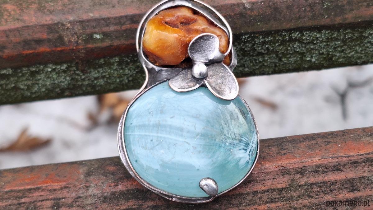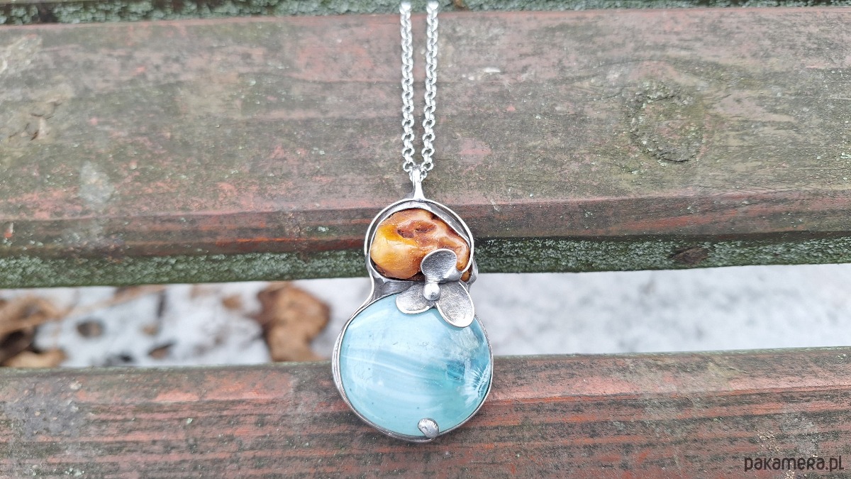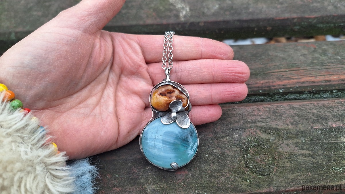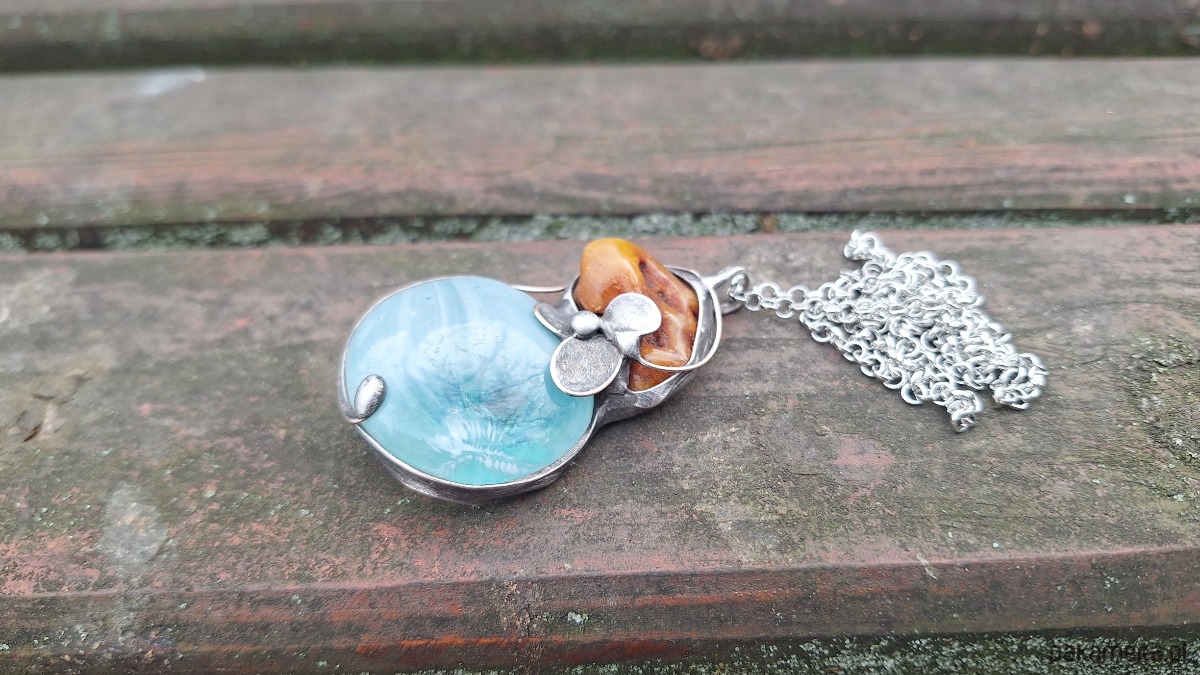 Wisiorek wykonany z miedzi, cyny, szkła i bursztynu. Wymiary ok. 5.5 na 3.5 cm. Zawieszony na łańcuszku o długości ok. 50 cm.