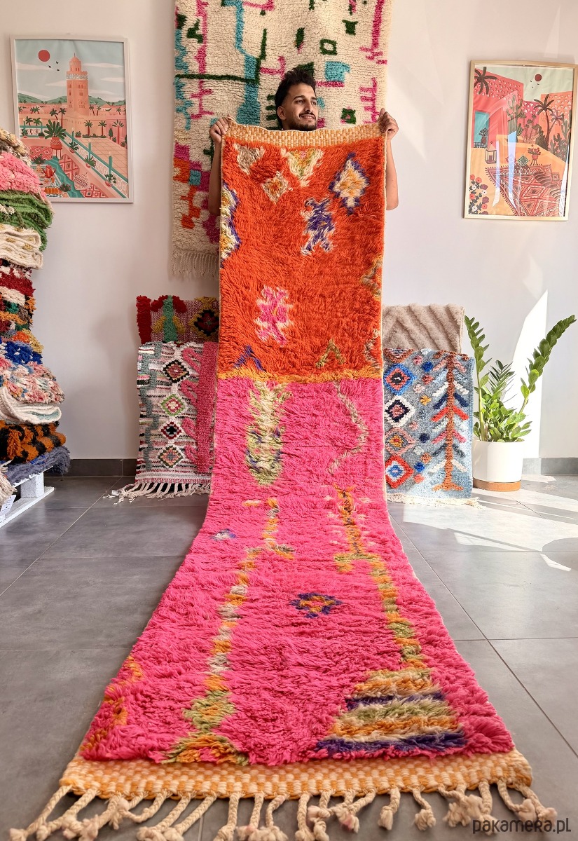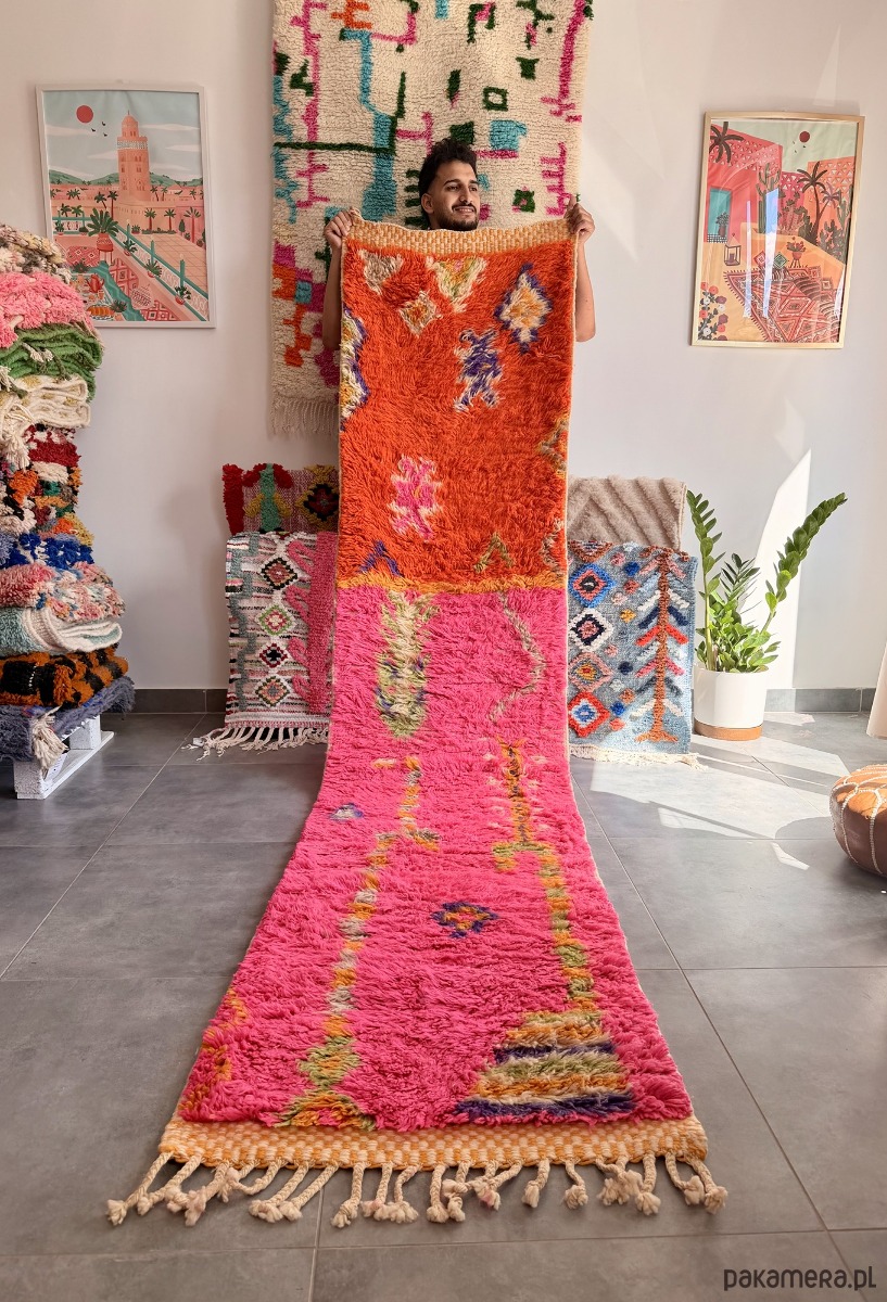 Chodnik wełniany Azilal Kunali Runner – dywan marokanski łączy w sobie tradycyjne wzornictwo z nowoczesnymi akcentami, co czyni go idealnym do każdego pomieszczenia. Dominującą barwą dywanu marokańskiego Azilal Kunali są odcienie intensywnego różu oraz pomarańczy. Wzory na dywanie, chodniku wełnianym Azilal Kunali są nie tylko dekoracyjne. Reprezentują harmonię i równowagę.