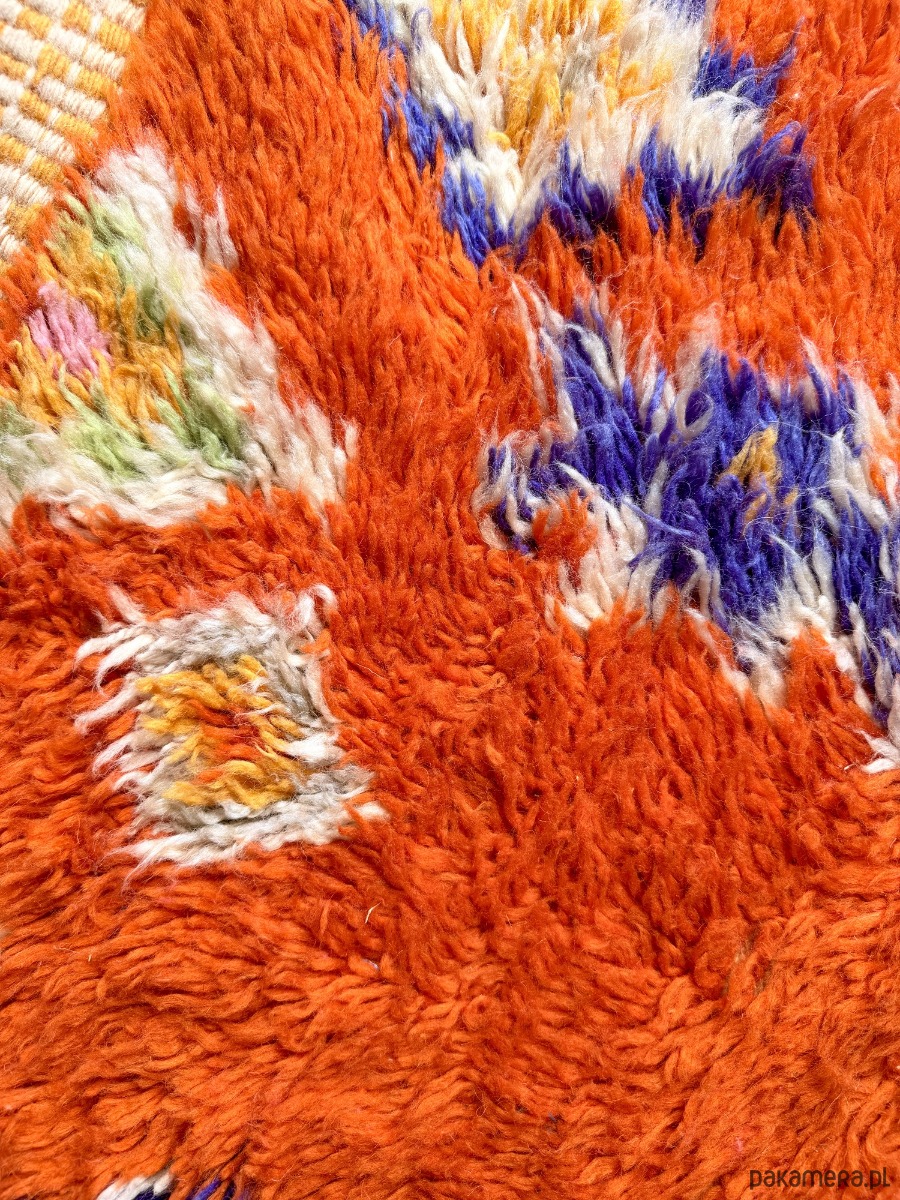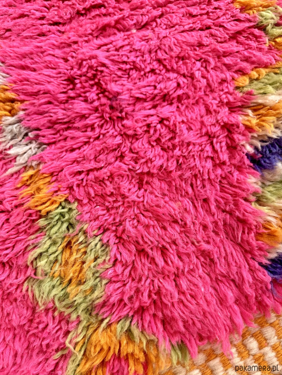 Wełniany dywan marokański shaggy, chodnik wełniany Azilal Kunali Runner to niepowtarzalne, oryginalne kolory, których nie znajdziesz przy masowej produkcji. Ten kolorowy dywan marokański Azilal wykonały ręcznie rękodzielniczki z gór Atlasu Wysokiego w Maroku. Tkały go prawie 4 tygodnie na stojącym krośnie. Kreatywność tych kobiet przejawia się w każdym szczególe. Zdecydowanie doda energii każdemu wnętrzu.