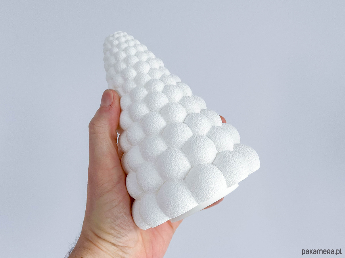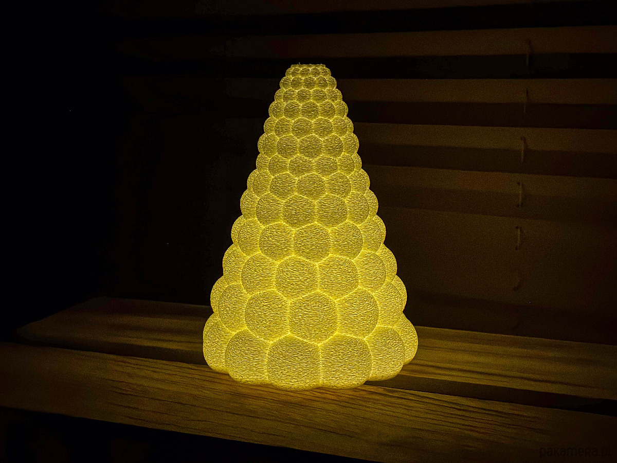 Choinka bąbelkowa, świecąca ozdoba wykonana w całości w technologii druku 3D. Choinka ma zdejmowaną podstawę z miejscem na tea light led (imitujący świeczkę) o średnicy ~37mm (dołączony do ozdoby).