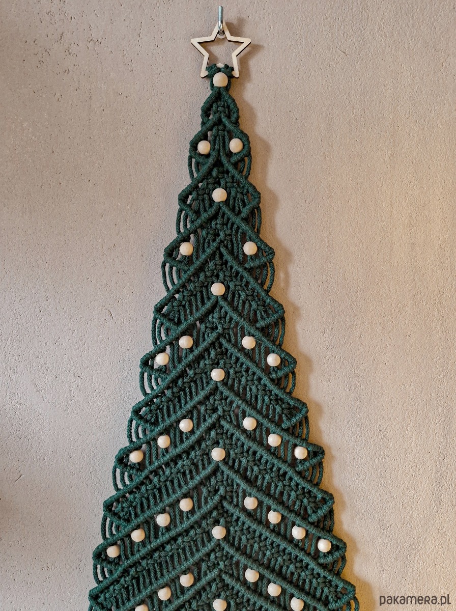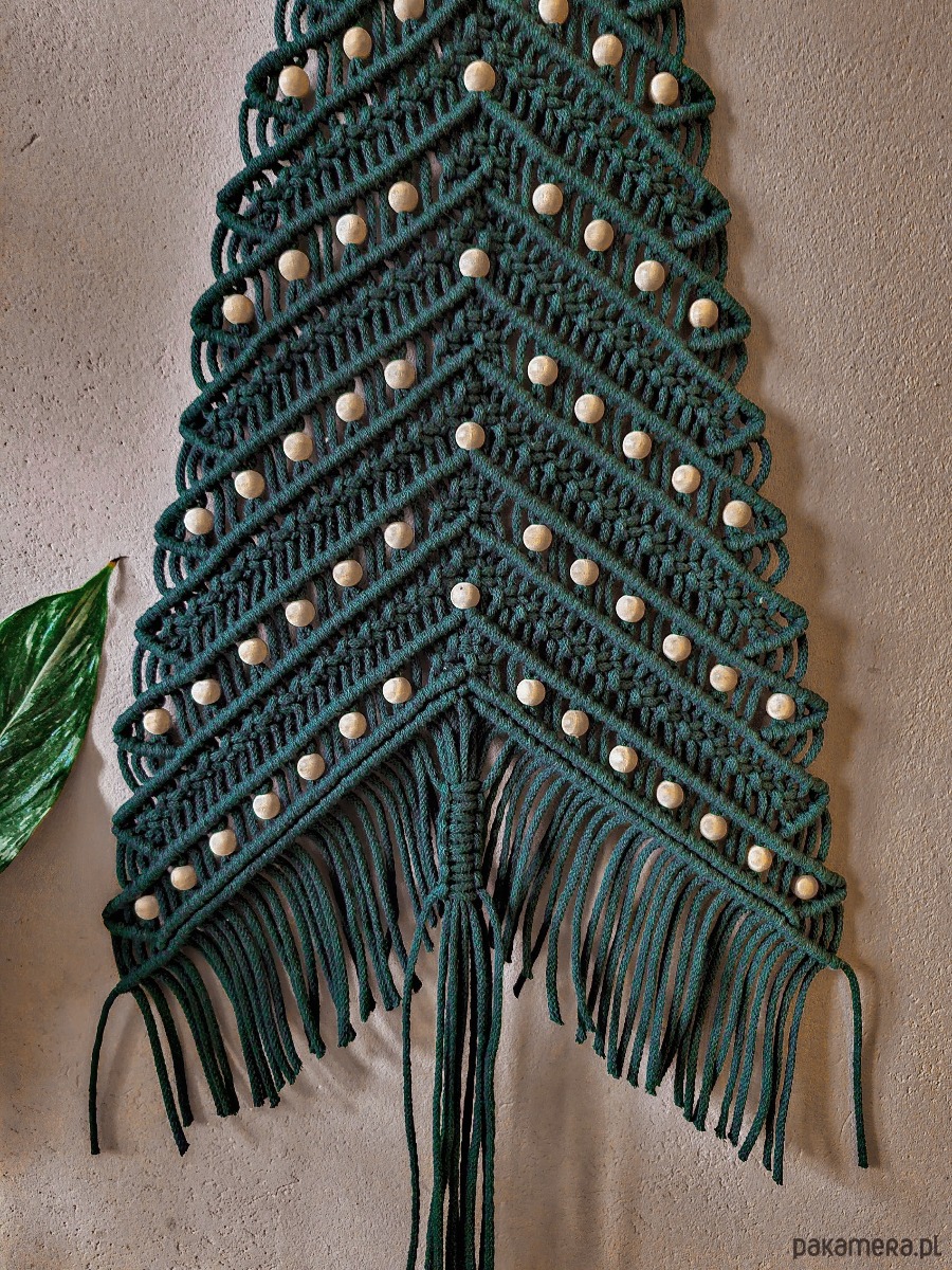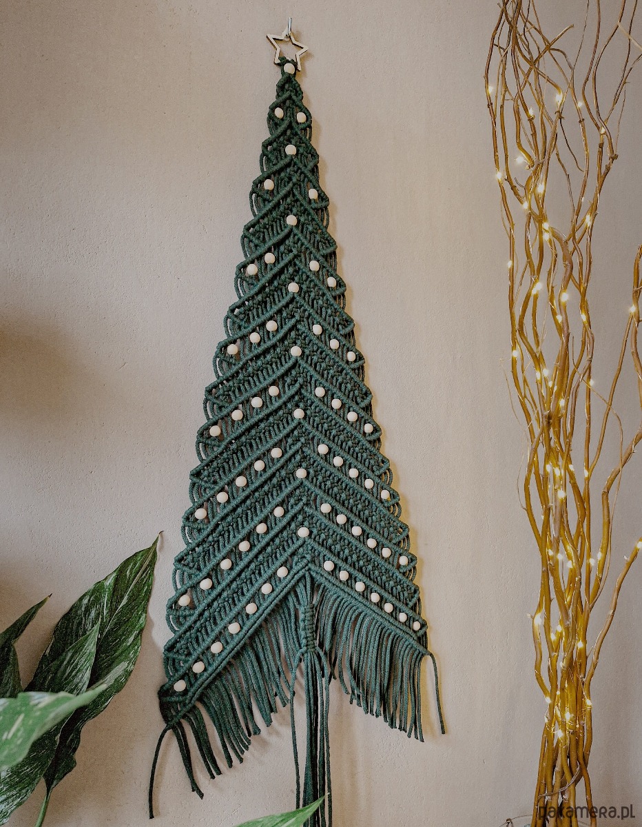 Makrama ścienna w formie choinki, to delikatna, naturalna ozdoba, która wprowadzi do Twojego domu świąteczny klimat. Ta nienachalna, świąteczna dekoracja pięknie prezentuje się w otoczeniu innych przedmiotów naturalnego pochodzenia np. drewnianych. Polecam ją w szczególności właścicielom czworonogów, które mają w nawyku podkradać ozdoby ze stojącej choinki, a także osobom ceniącym sobie ekologię i preferującym święta bez plastiku. Choinka wykonana jest ze sznurka bawełnianego skręcanego 3ply pochodzącego z recyklingu.