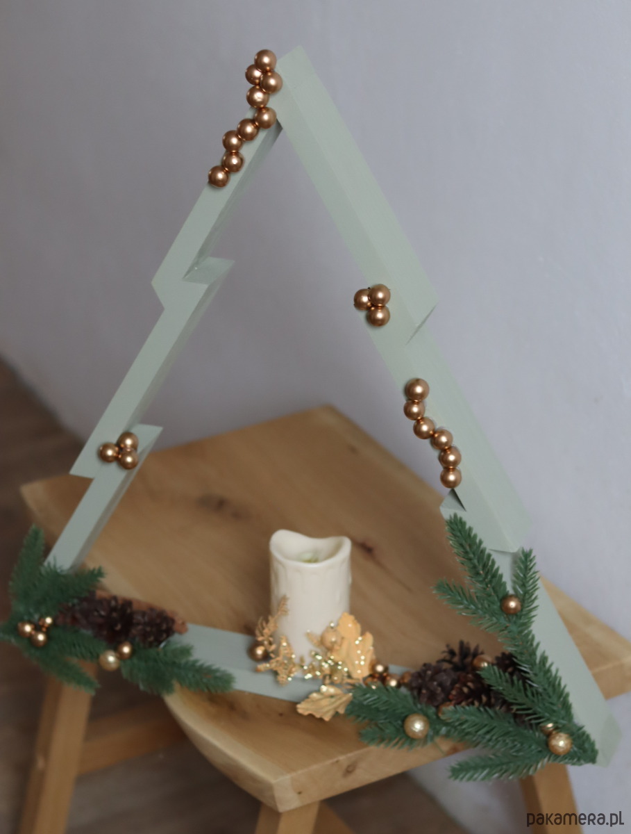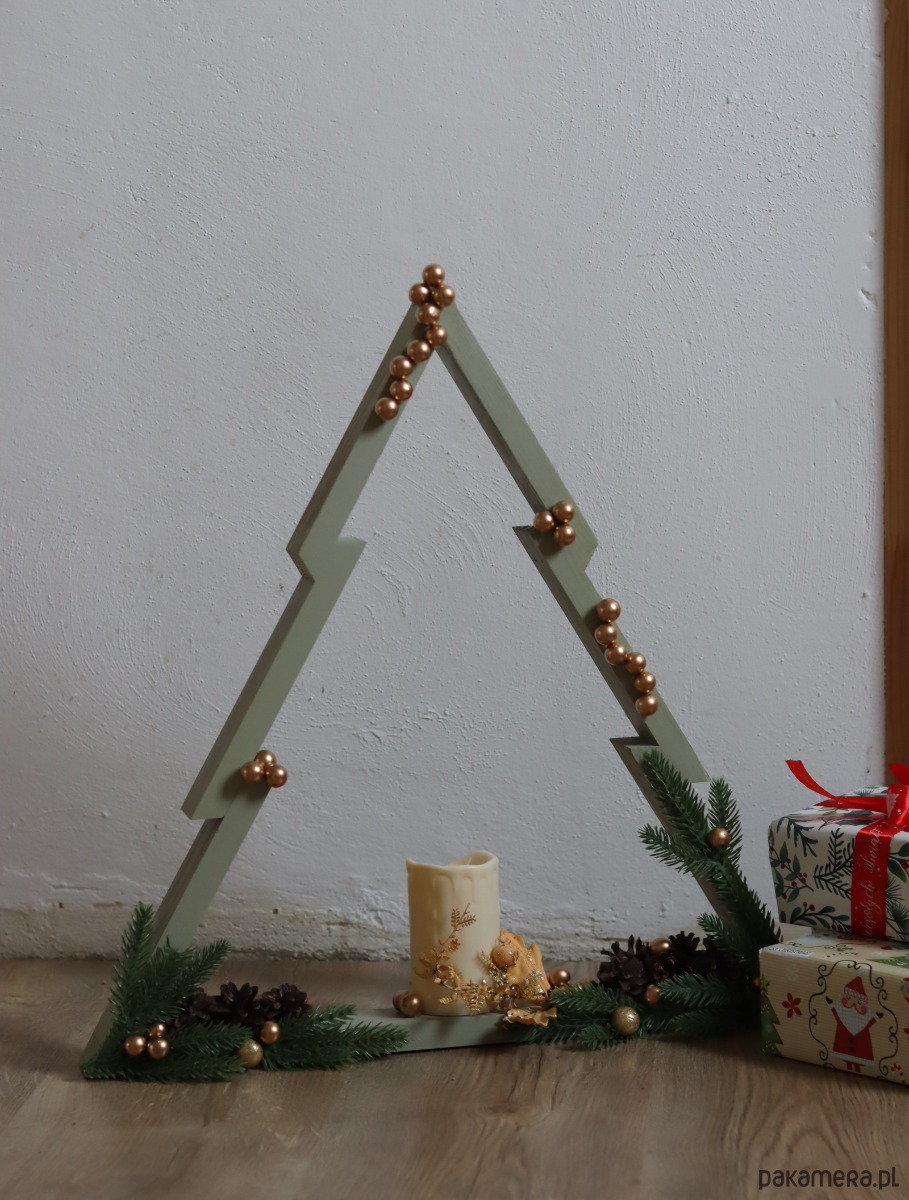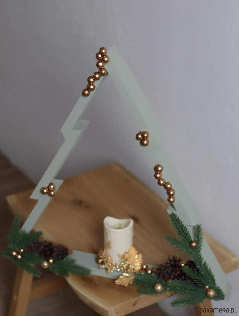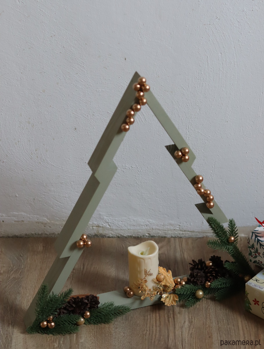 Drewniana ręcznie robiona choinka . Piękny oliwkowy kolor drewnianego drzewka , świeca led i złote ozdoby .
