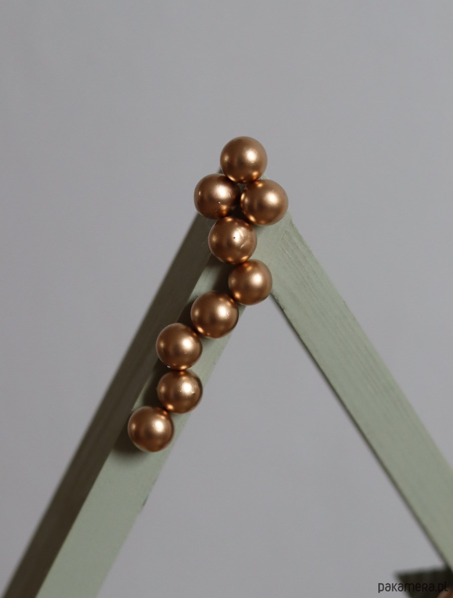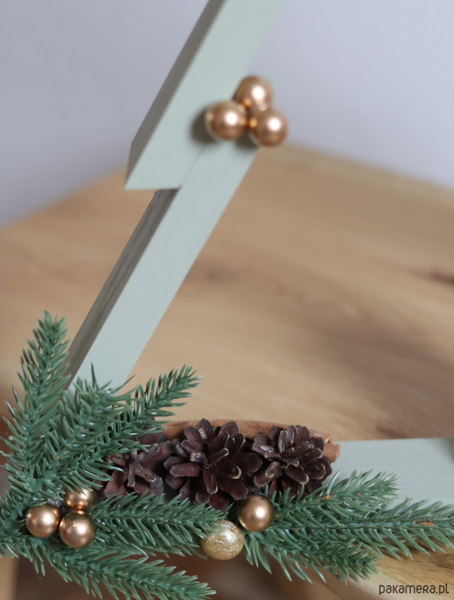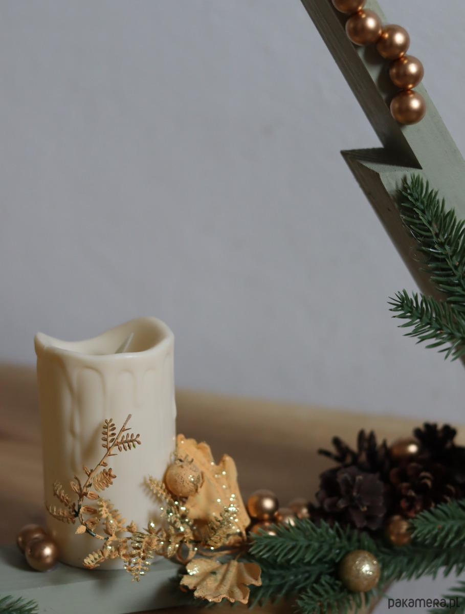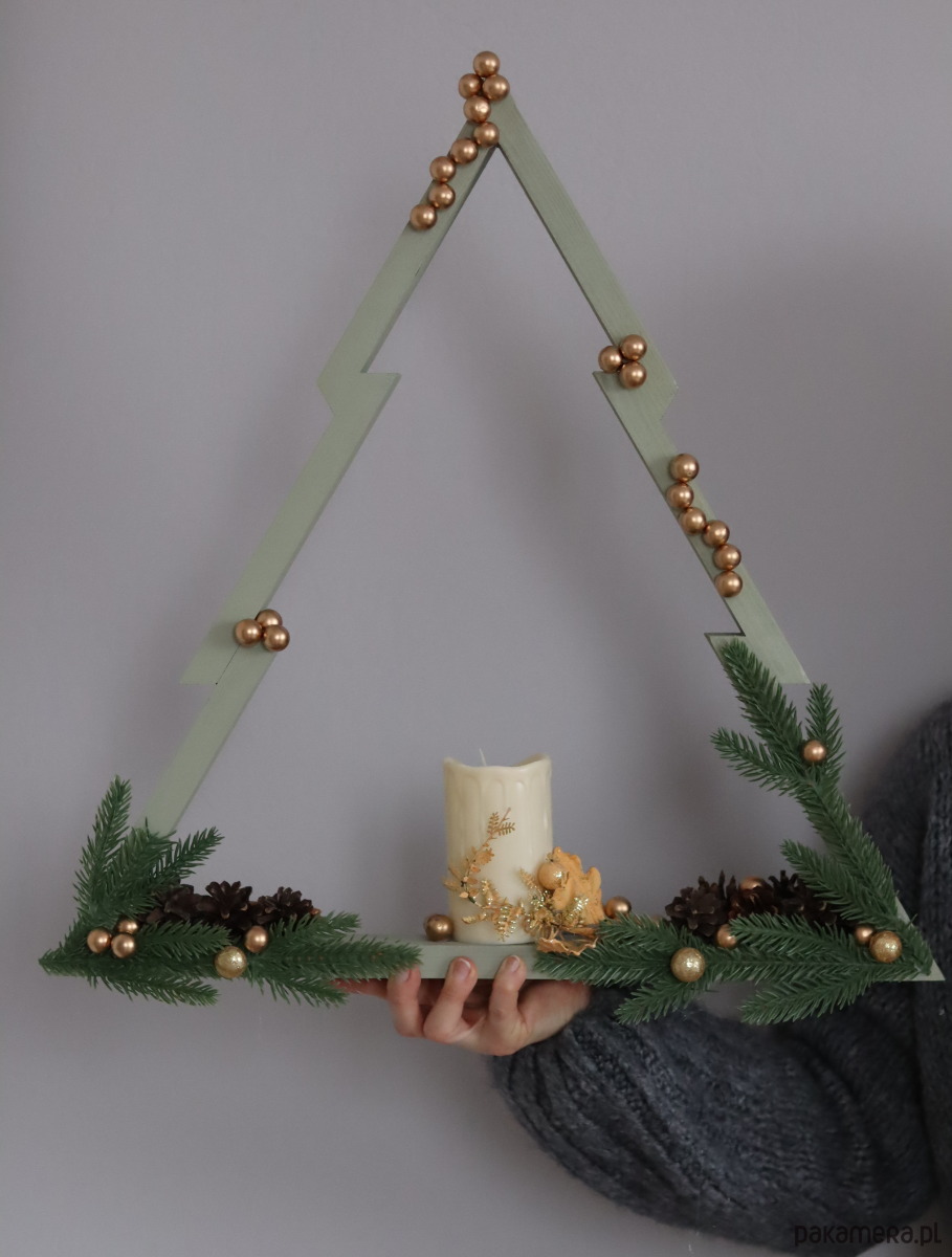 Drewniana ręcznie robiona choinka . Piękny oliwkowy kolor drewnianego drzewka , świeca led i złote ozdoby .