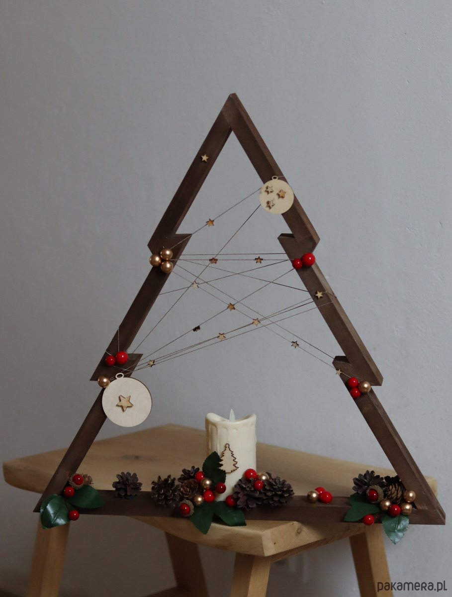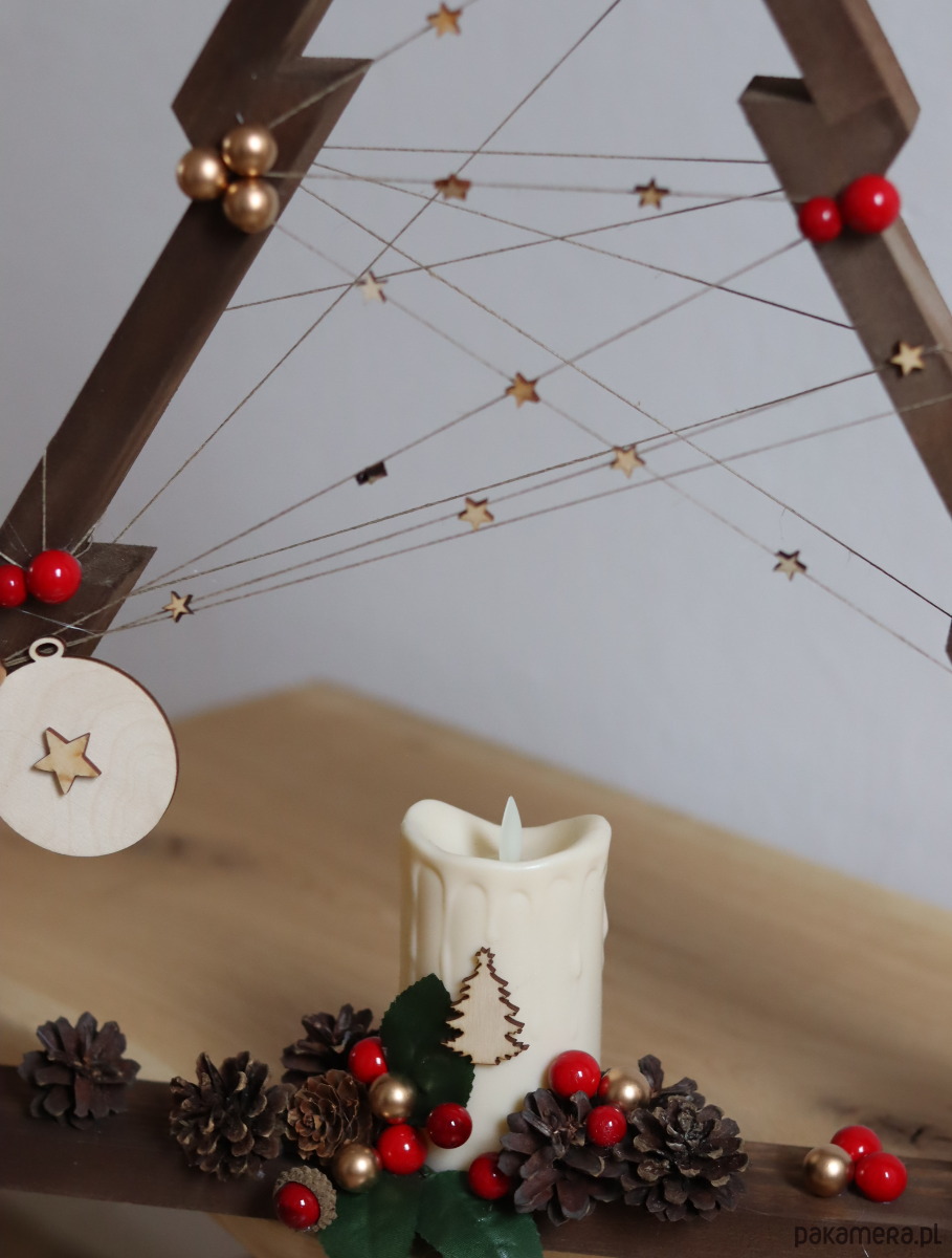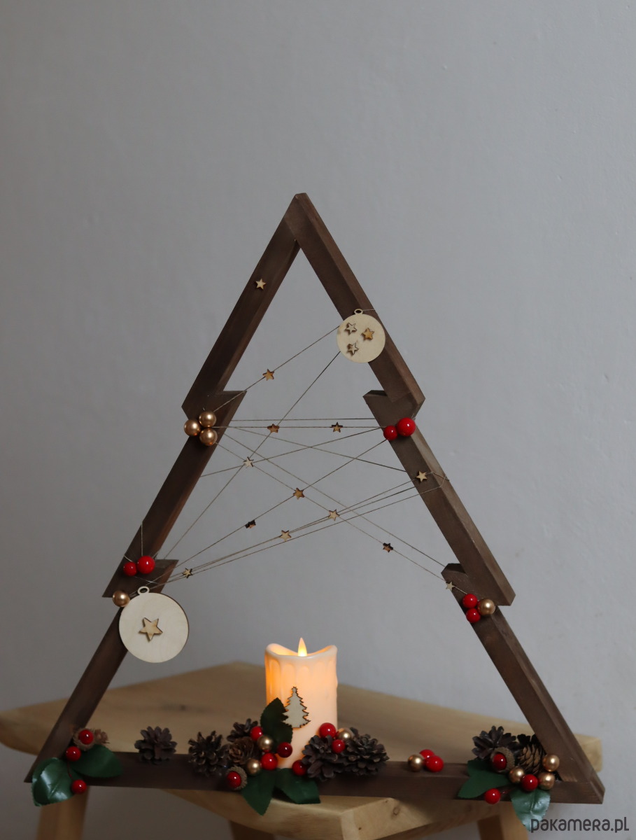 Drewniana ręcznie robiona choinka . Piękny ciemny kolor drewnianego drzewka , świeca led i ozdoby nadają jej naturalnego charakteru