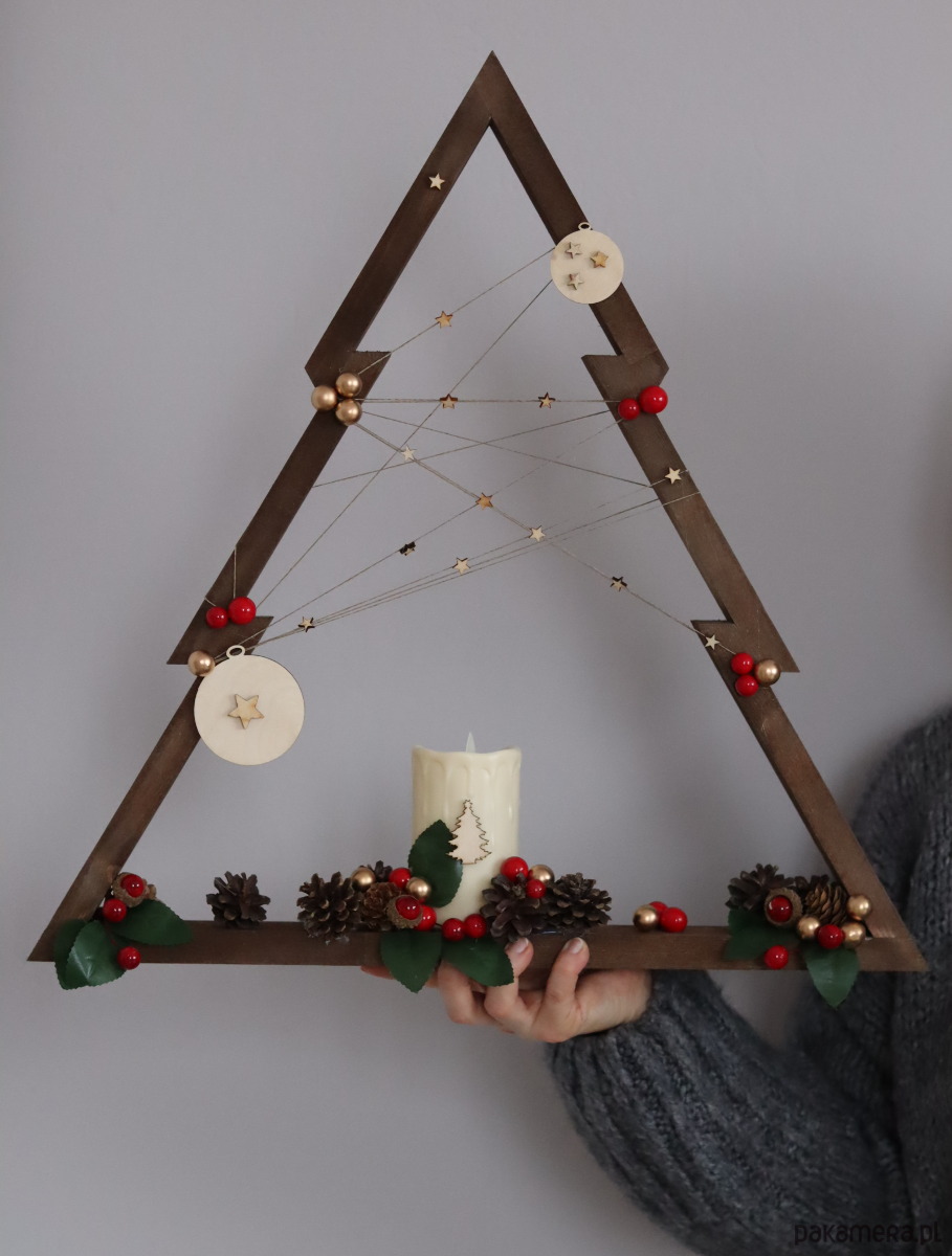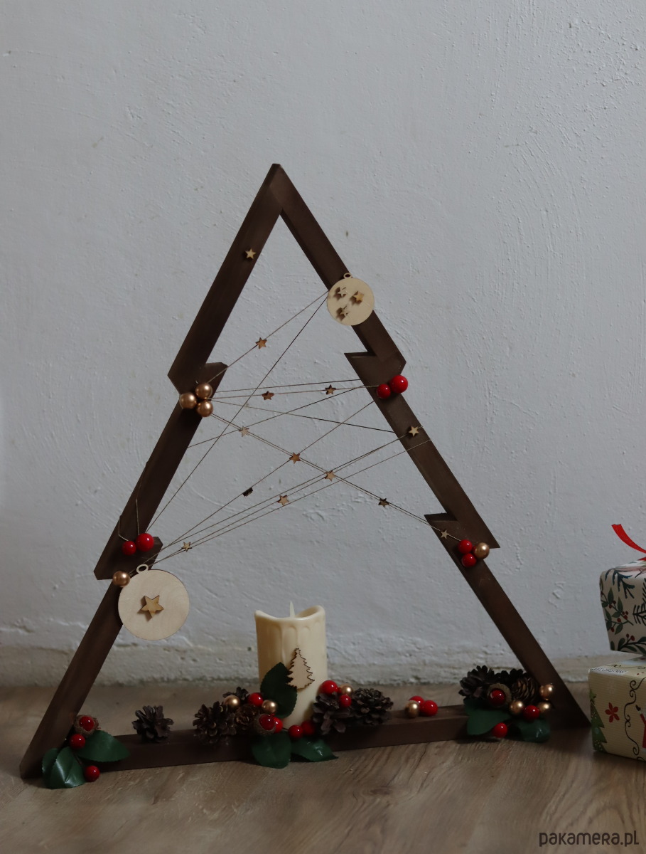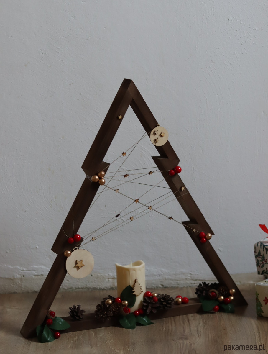 Drewniana ręcznie robiona choinka . Piękny ciemny kolor drewnianego drzewka , świeca led i ozdoby nadają jej naturalnego charakteru
