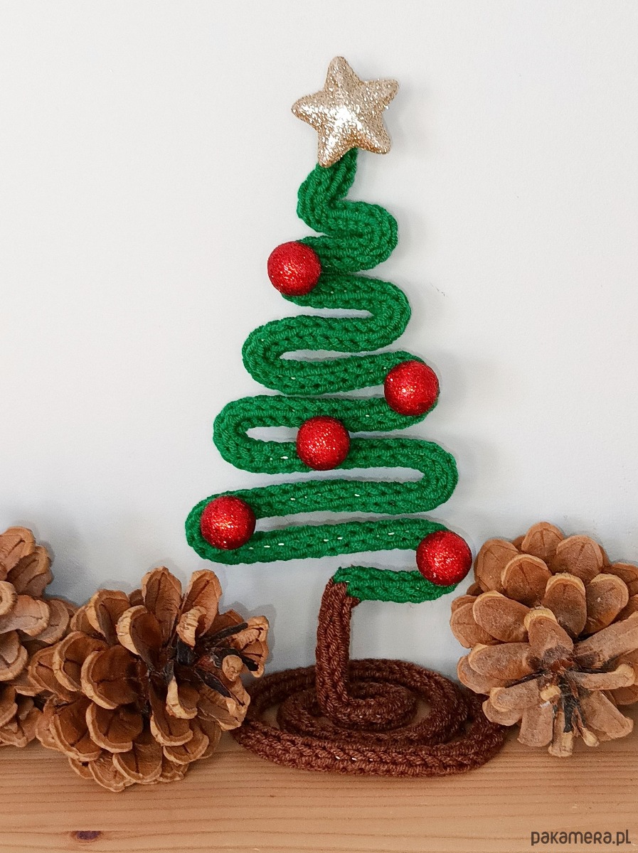 Dodaj odrobinę świątecznego uroku do swojego wnętrza z tą ręcznie robioną choinką z włóczki, ozdobioną kolorowymi bombkami i piękną gwiazdką na szczycie!