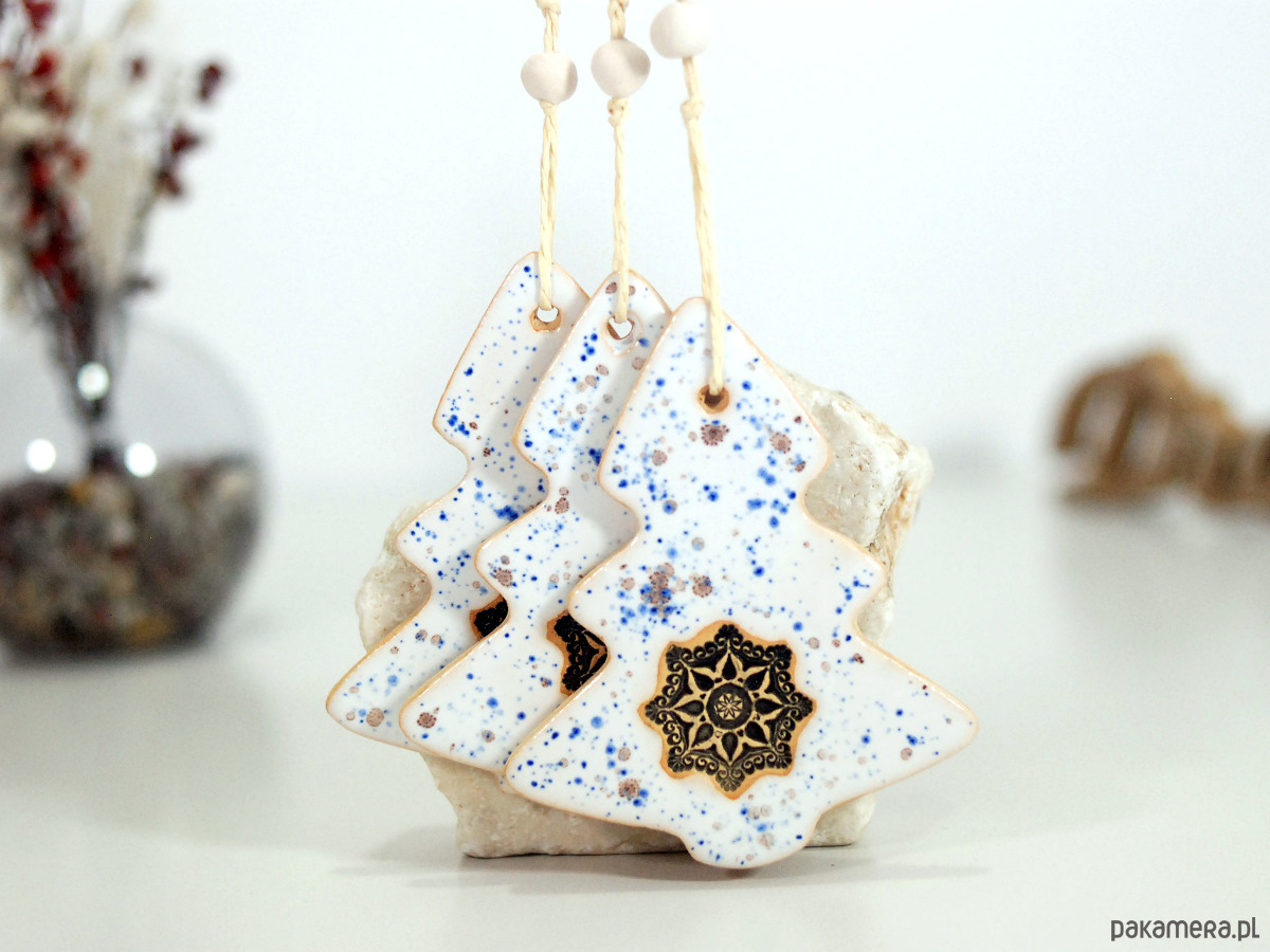 Zestaw zawiera 3 ręcznie robione i malowane ceramiczne choinki.