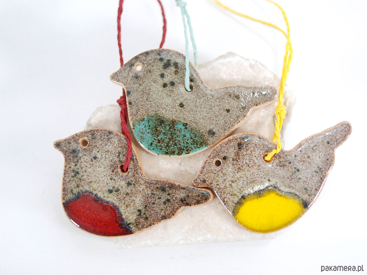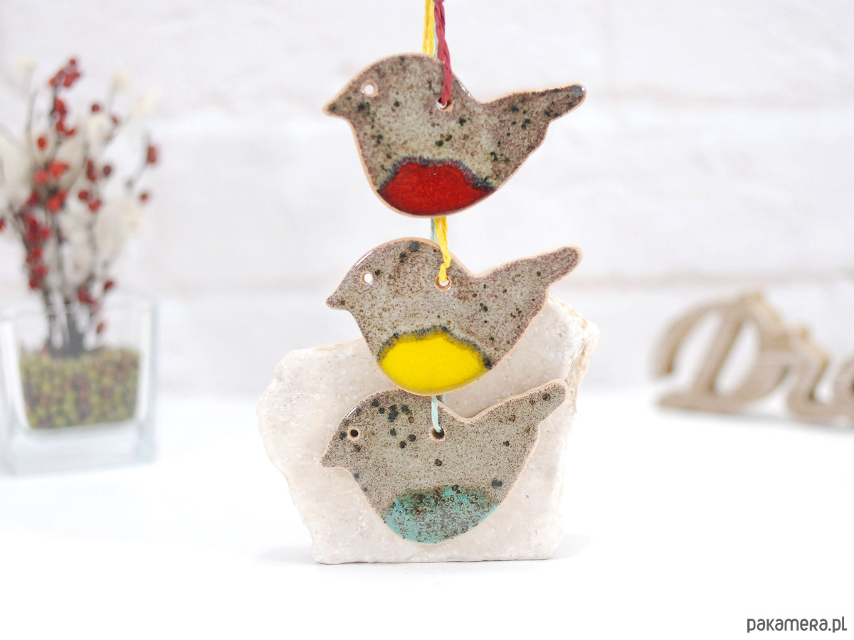 Zestaw zawiera 3 ręcznie robione i malowane ceramiczne ptaszki.